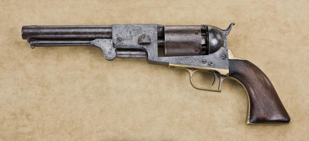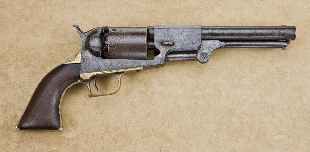 Colt First Model Dragoon percussion revolver, .44 cal., 7-1/2” barrel, blue and case hardened finish, wood grips, #4858. This gun is in overall good condition showing an even brown patina on the barrel and cylinder with scattered erosions and pin prick pitting, faint traces of cylinder scene remaining; frame and loading lever have also gone to an even brown patina with slight traces of case color and silvery finish mixed in; the bore is good, the markings are good including the “U.S.” under the “Colt Patent” on the left side of the frame, the barrel address and a number of inspector “P” stampings on metal parts and an “A” stamping on the trigger guard. The wood grips are worn but overall good with some slight worn losses at the corners, some nicks and mars from carry and storage and no visible inspector’s rectangular initialed cartouches although they may at one time have been there and are now worn off. Whether a Martial of Civilian First Model, this is a very presentable example of the Colt First Model Dragoon revolver. From the Richard Wolfe Estate. Est.: $4,000-$8,000.