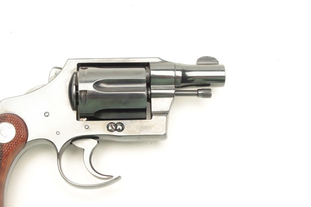 Colt Fitz Special Detective Model revolver, .38 Special caliber, Serial #462369. The pistol is in fine overall condition with a 2” barrel. The pistol retains nearly all of an old quality re-blue with light wear at themuzzle and a faint drag line on the cylinder. The pistol features a bobbed hammer, cutaway trigger guard and checkered trigger. The checkered wood silver medallion grips are in very good condition with small marsand compressions from carry and use. The butt has “GP” lightly scratched into it. The bore is very good, the action crisp and markings are sharp. The lot includes a carved leather, open top holster marked,“S.D. MYRES EL PASO, TEX” from the Gil Newton Collection. The consignor’s notes indicate the pistol was shipped from the factory on October 18, 1940 to Buhl & Sons Co. of Detroit, Michigan. Est.: $2,500-$5,000.(C+R).