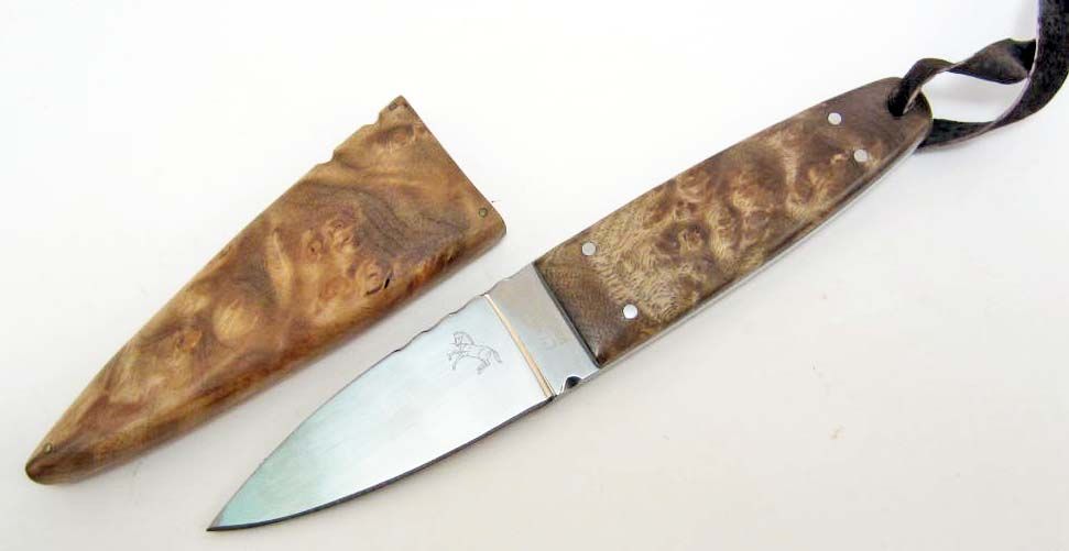 6 1/2" overall. 3 1/8" stainless blade. Full tang. Burl wood handles. Leather lanyard. Burl wood scabbard.