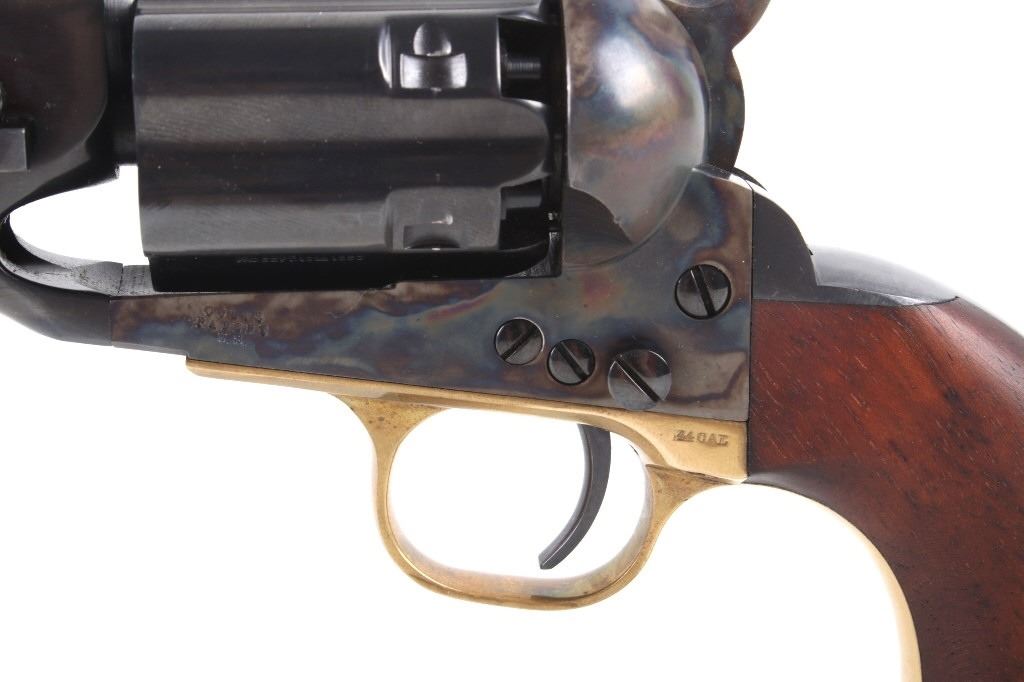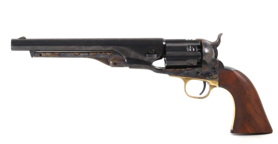 This is an original rare Colt Model 1860 Army percussion revolver with fluted cylinder manufactured by Colt from their Colt Signature Series and chambered in .44 caliber. The revolver features an 8" barrel, fluted 6 shot cylinder, walnut grips, brass trigger guard, brass blade front sight, and hammer notch rear sight. The Colt Model 1860 was originally issued and used during the Civil War, with many, if not most, going to the West after the war for use in the Indian Wars or frontier service with fluted cylinder examples being scarcely issued. Overall, the revolver shows a factory original attractive deep shiny blue finish across the fluted cylinder, barrel, screws, grip frame backstrap, and barrel wedge with the frame, ramrod / lever and hammer being beautifully case hardened showing a rich coloring. The trigger guard and strap are solid brass with a nice coloring. The piece is in all original factory condition nearly mint with some slight scratching, scuffing and handling wear, along with dings in the walnut grips. This revolver also features the correct 8” barrel with sharp and clear Colt one line address on top, correct small front sight, attached loading lever functions correctly, one piece walnut grips fully intact. It is in excellent overall condition. The cylinder is marked "Pat. Sept. 10th 1860". The frame, trigger guard, and barrel are marked with matching serial numbers. The revolver displays wonderful condition with tight mechanics and blue'd patina. Serial Number: 208283. This firearm qualifies as an Antique / Black Powder and does not require FFL Transfer or NICS Background Check. Colt Black Powder Series Gun. This is a Colt 1860 Black Powder Signature Series Revolver, while it does qualify as an Antique / Black Powder pistol it is of a modern original Colt manufacture. These original Colt Signature Series revolvers are becoming more scarce and highly collectible in recent times.