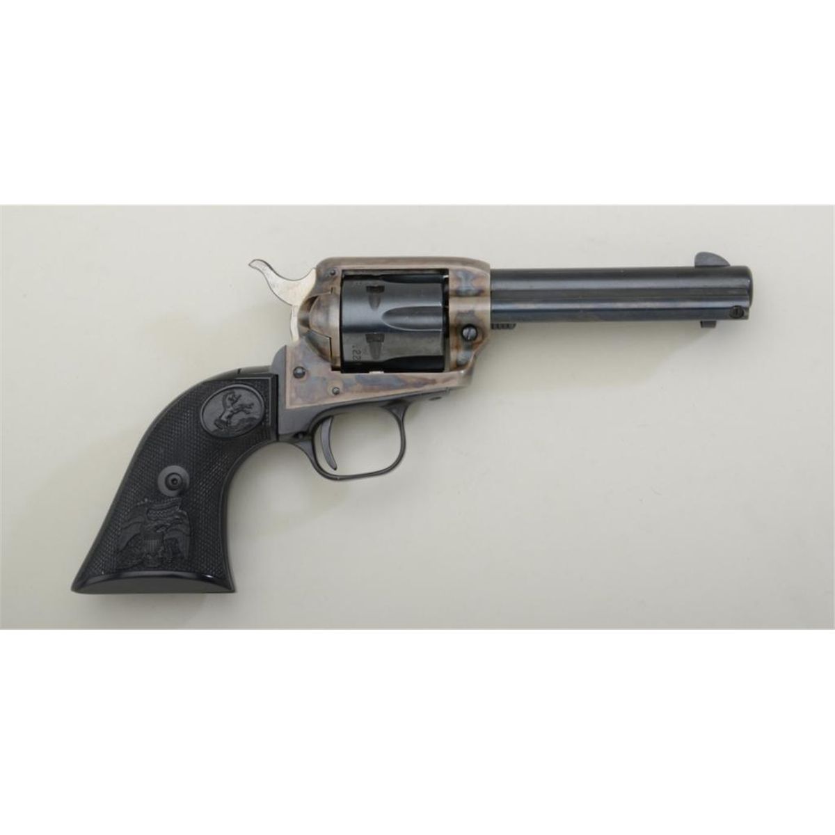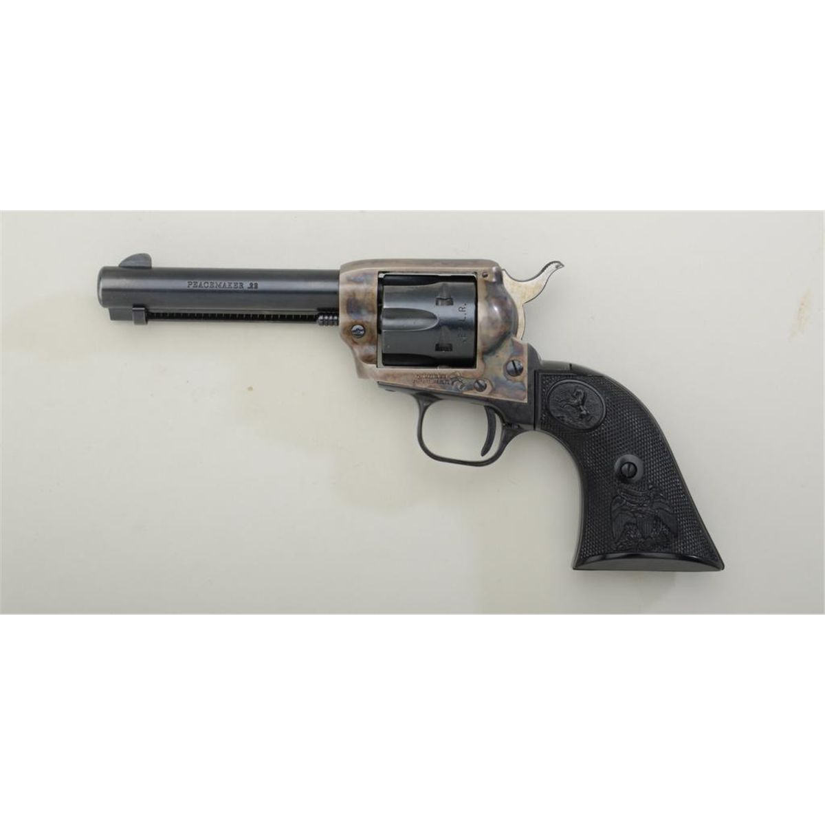 Colt Frontier Peacemaker SAA revolver, .22LR cal., 4-1/2” barrel, blue and case hardened finish, checkered black eagle hard rubber grips, #L03866. This gun is in overall excellent condition showing little use orhandling. Est.: $250-$500.