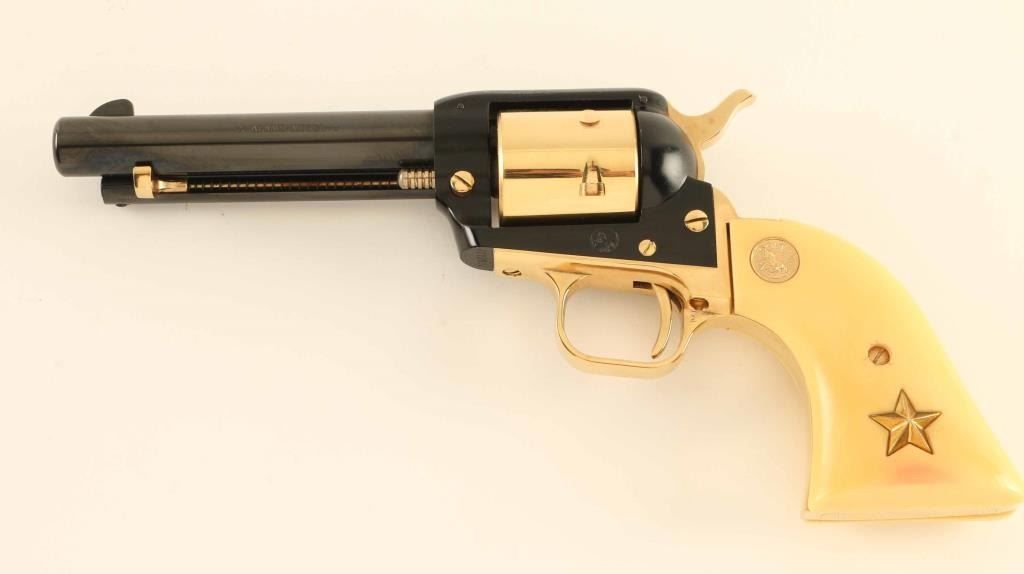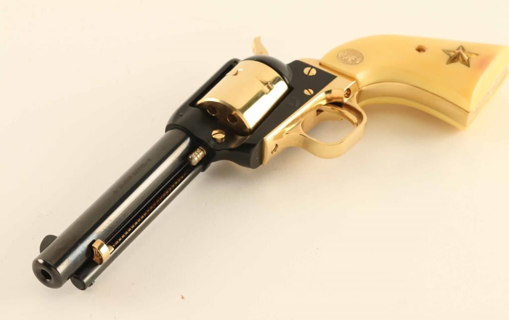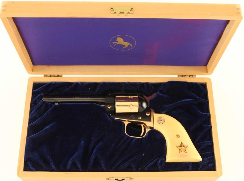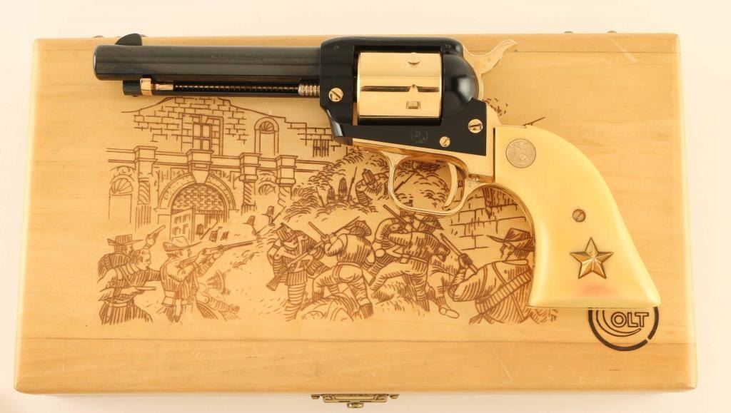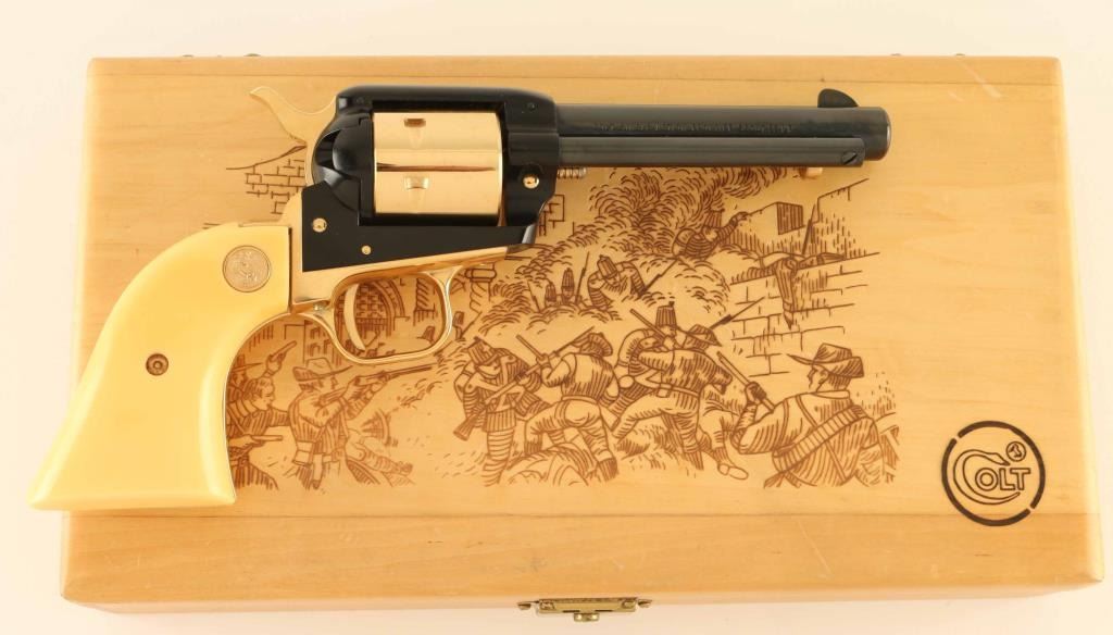 SN: 2602A22 Vintage small frame single action revolver commemorating the Battle of the Alamo, 1836. Manufactured in 1967 with only 4,250 reported to have been produced. Features a blued, black & gold plated finish, 4 3/4" barrel, ejector rod, blade front sight, square notched rear sight, non-fluted six shot cylinder, smooth thin trigger, knurled hammer spur, alloy frame, roll stamped engraved butt and two-piece faux ivory grips with gold Colt medallions and Texas star inlayed into the left panel. Includes a factory wood presentation case with blue velvet fitted interior and a "Battle of the Alamo" scene impressed into the top. Revolver retains approximately 97% of it’s original finish showing minor handling marks and a few losses on the top of the barrel & frame. Action is crisp with very good lock-up, the bore is excellent and the plastic grips are near fine with minor cracks surrounding the screw on the left panel. Condition is near NRA Excellent in box. ***C&R Firearm***