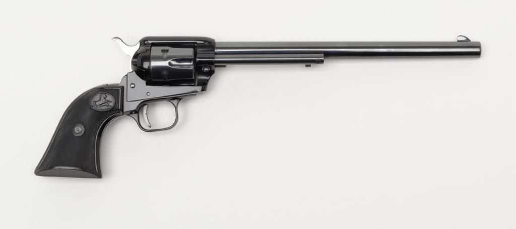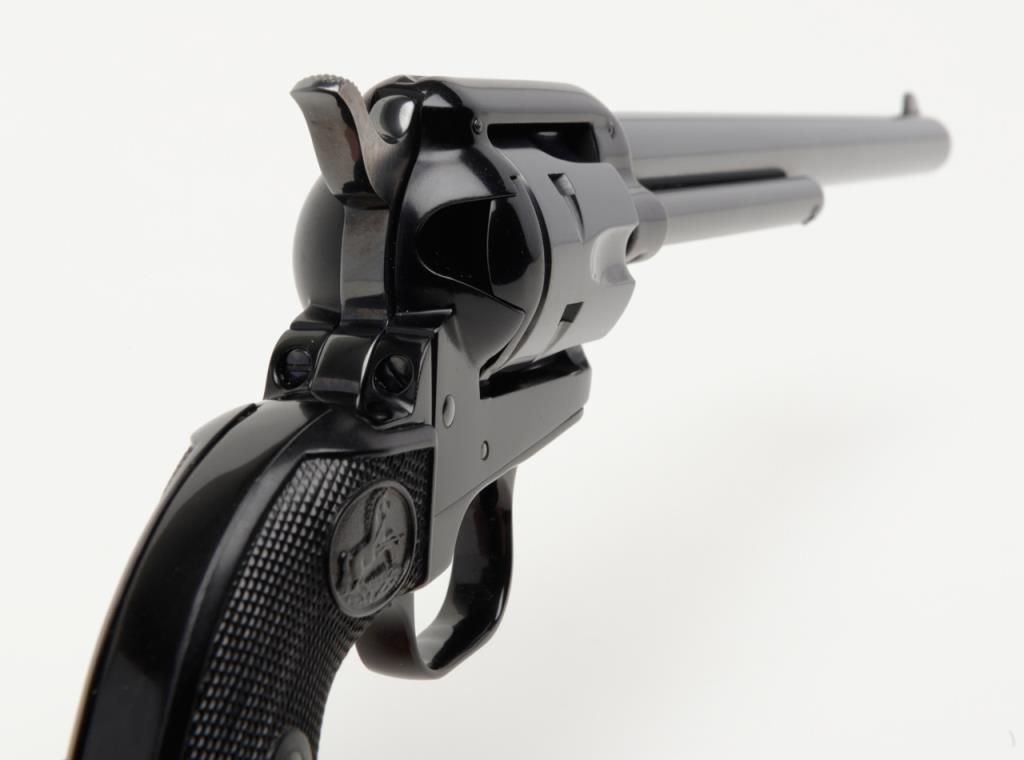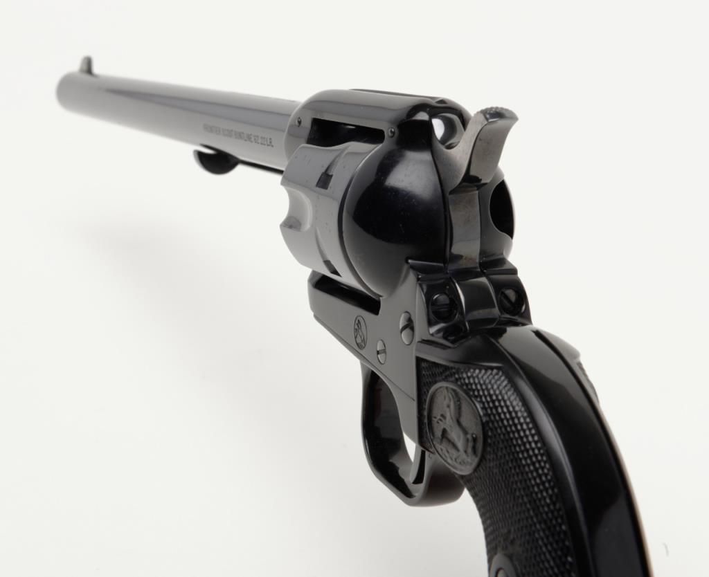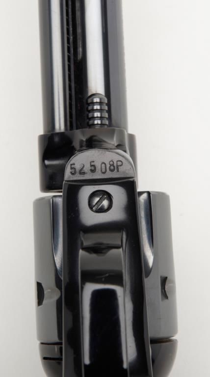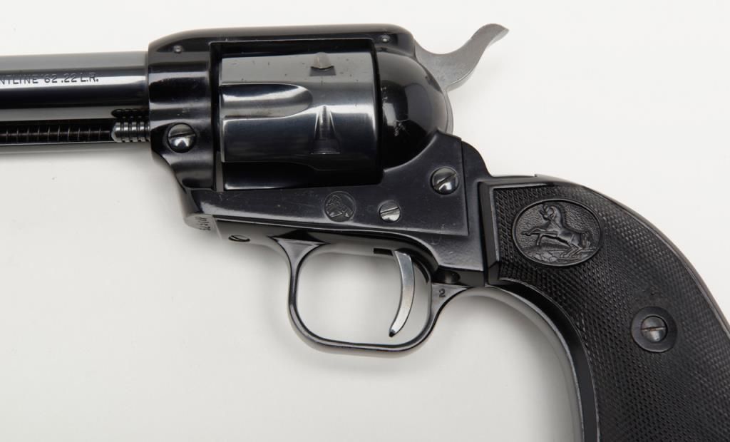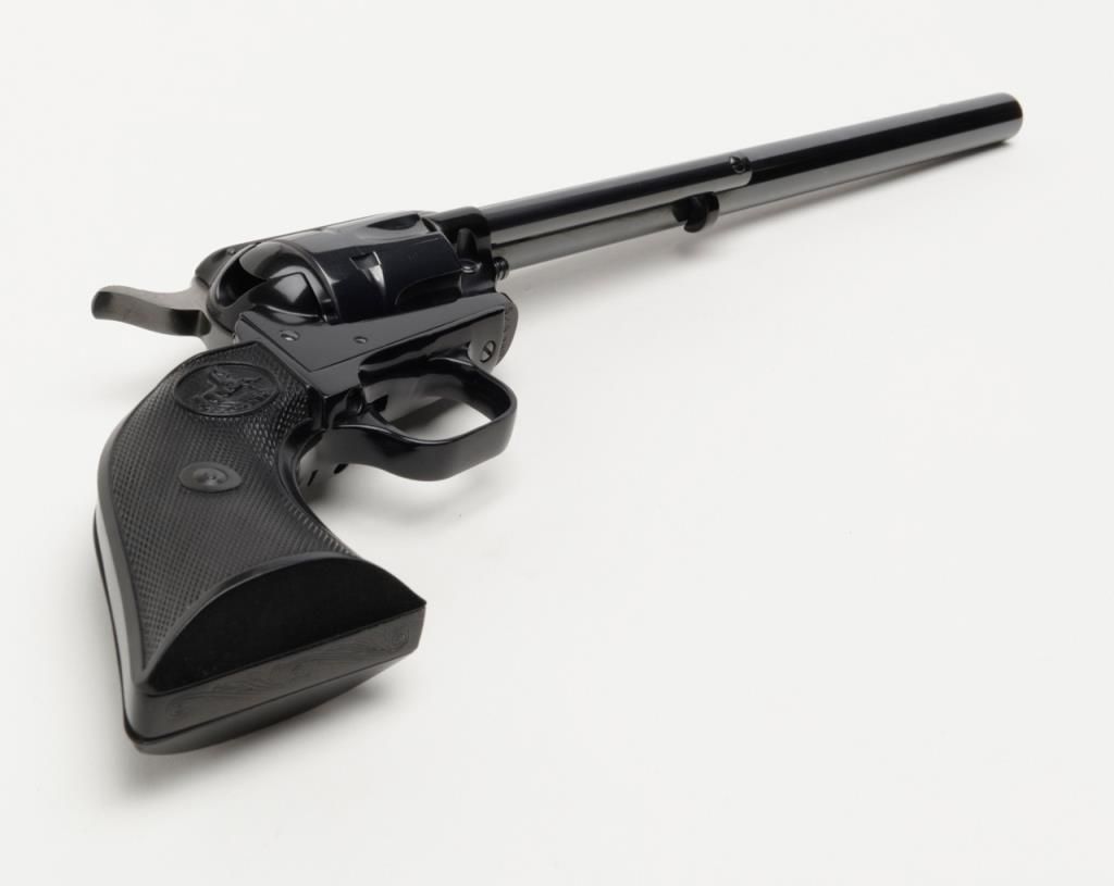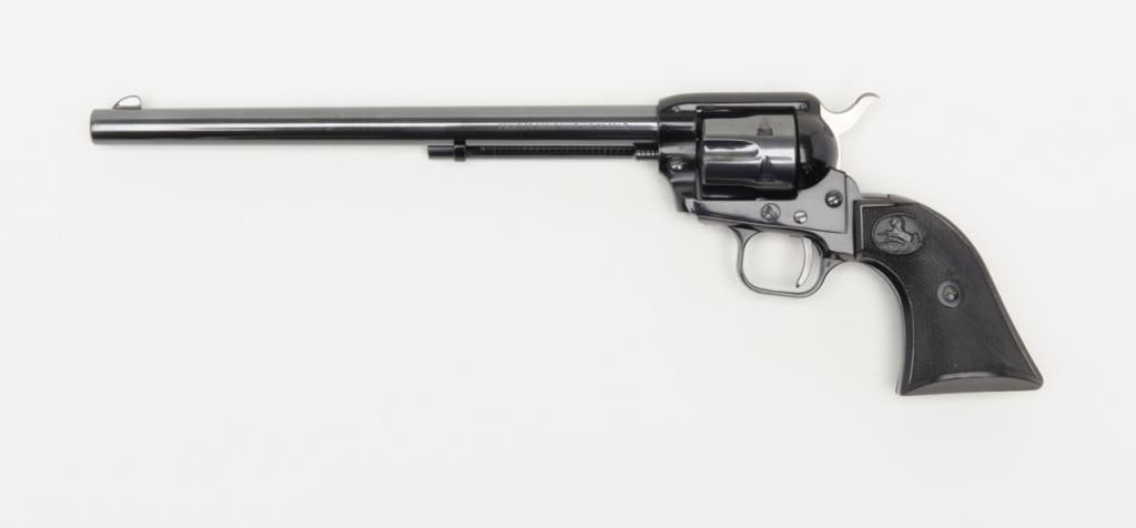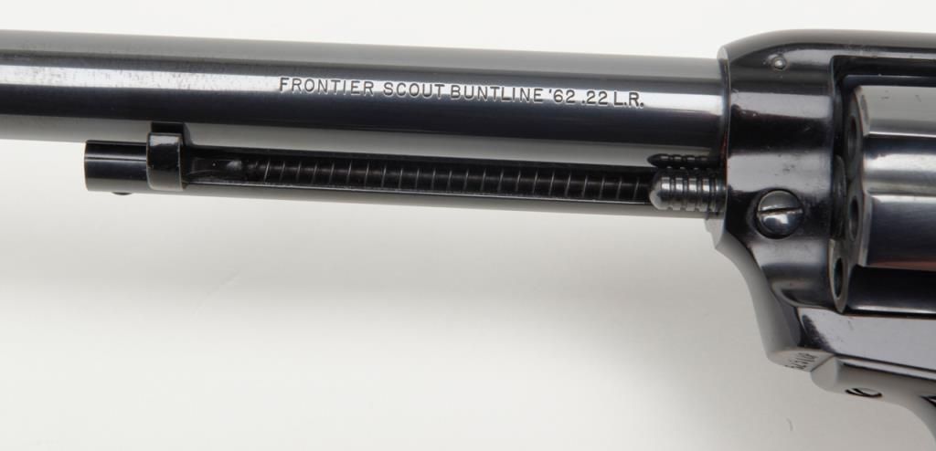 Colt Frontier Scout Buntline ’62 Single Action revolver, .22LR cal., 9-1/2” barrel, appears to have been expertly re-finished, checkered black plastic grips, #52508P in overall very good condition as re-finished with crisp action,markings and fine grips. (C&R/PPT). Est.: $250-$500