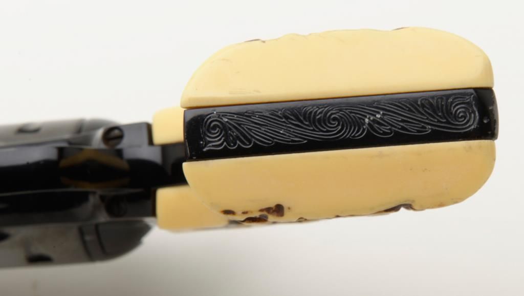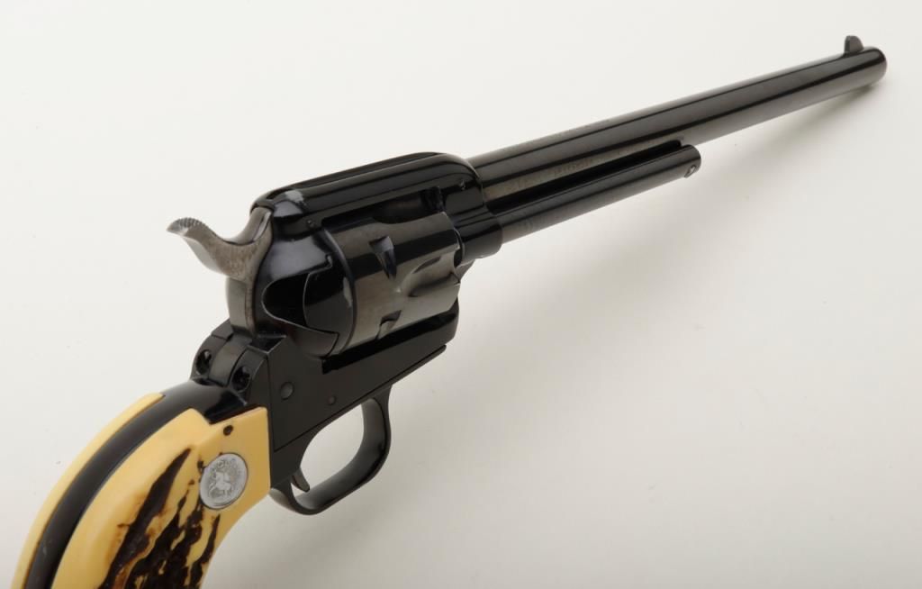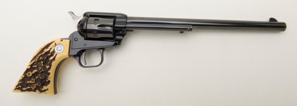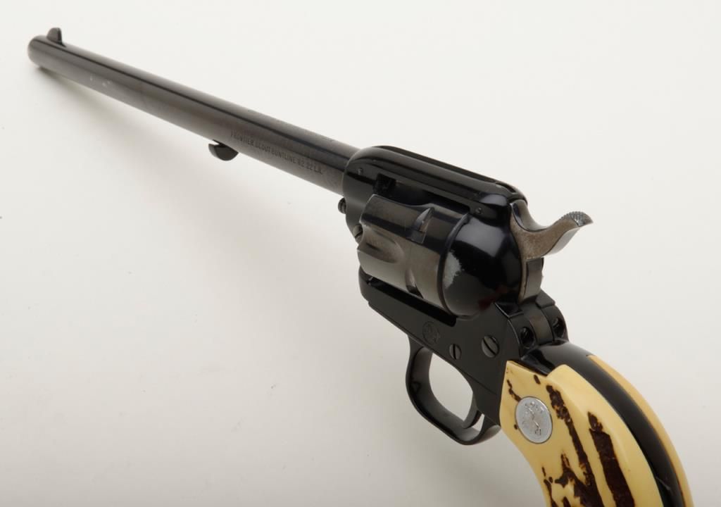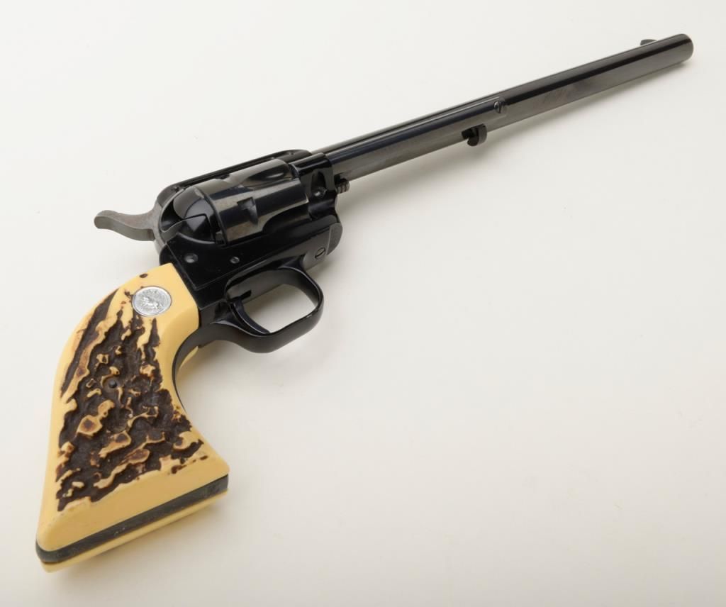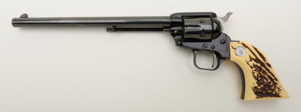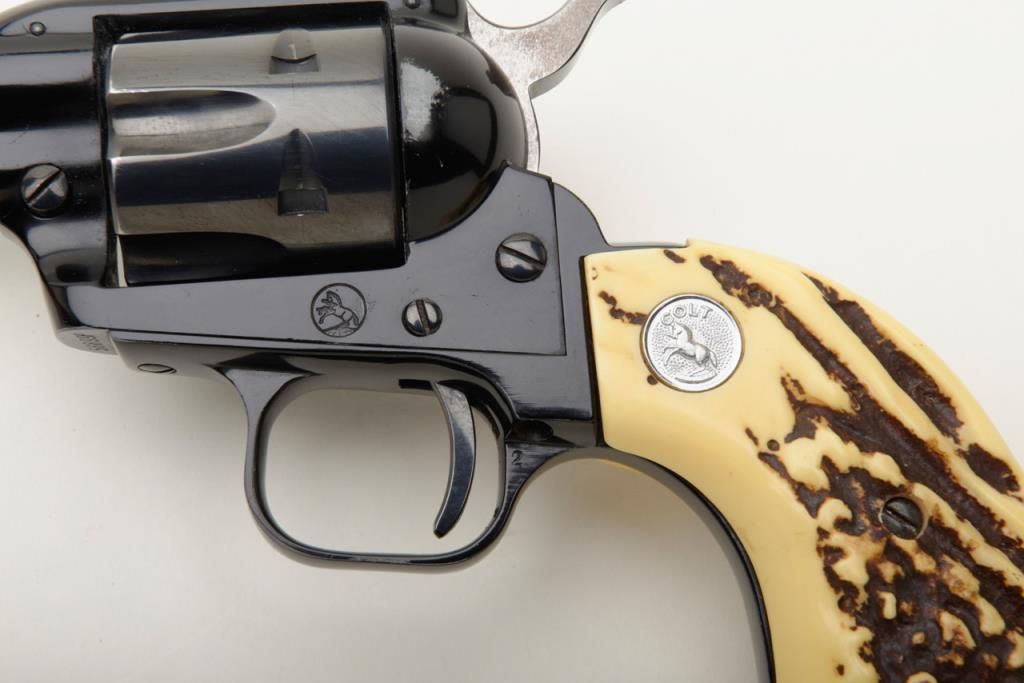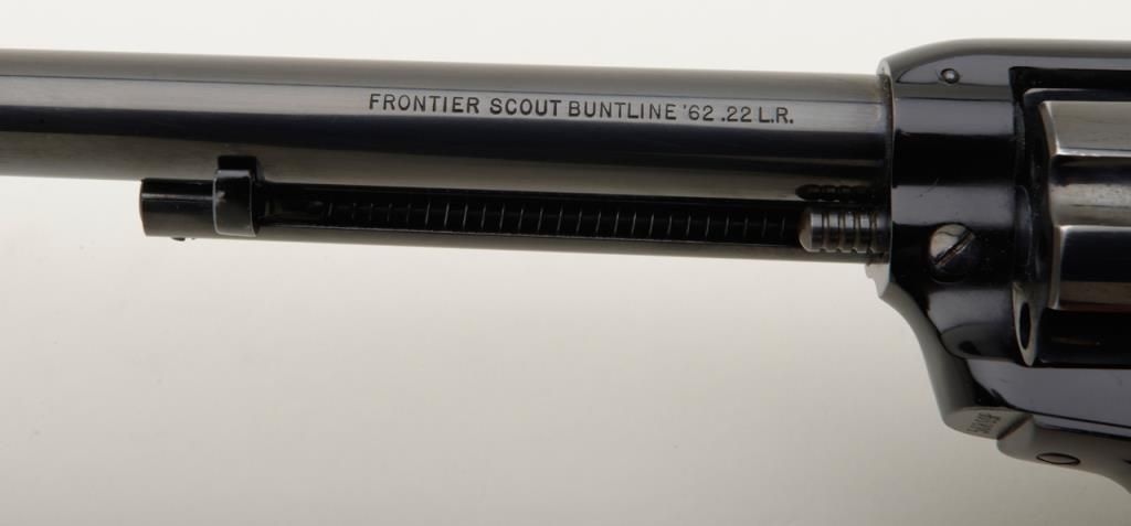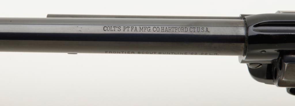 Colt Frontier Scout Buntline ’62 Single Action revolver, .22LR cal., 9-1/2” barrel, blue finish, Colt medallion faux stag grips, #56899P in overall fine to excellent condition showing approx. 96% original finish with loss at muzzle, rear toe of grip strap and at recoil shield sides; otherwise, little use or handling. Est.: $600-$1,200.