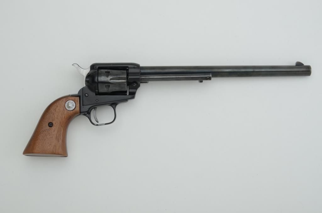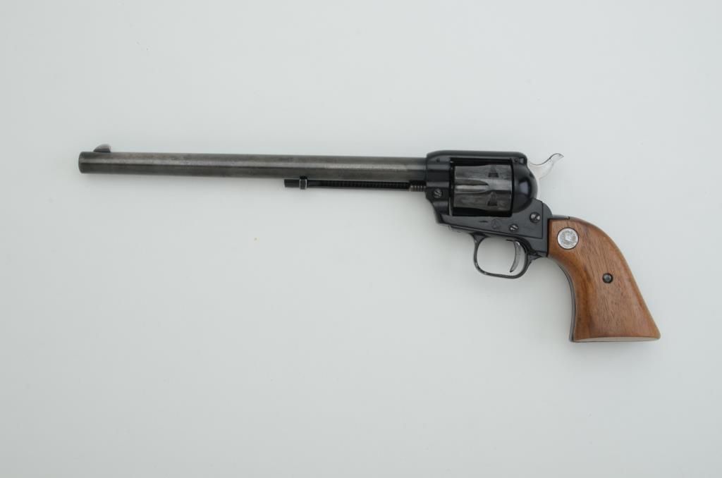 Colt Frontier Scout Buntline 62 single action revolver, .22 Magnum cal., 9-1/2” barrel, blue finish, smooth hardwood medallion grips, #56352P. This gun is in overall very good condition showing original finish on theframe and cylinder and a mixture of original finish on the underside of the barrel and grey patina on the top portion of the barrel, very good bore, crisp action, very good markings and fine grips. Est.: $300-$600.