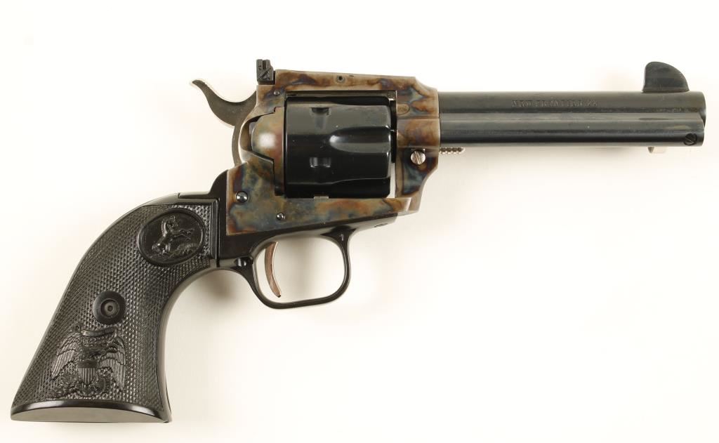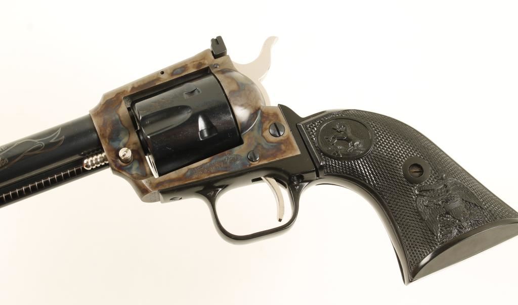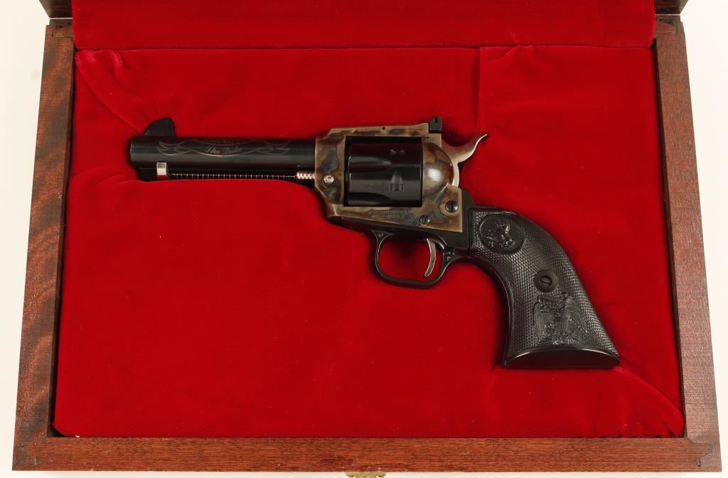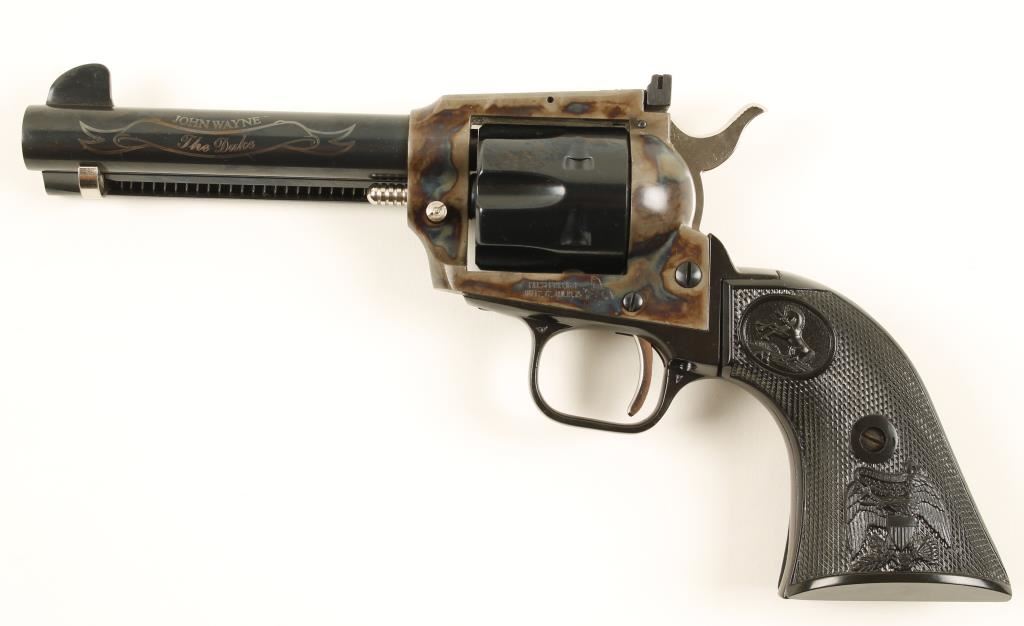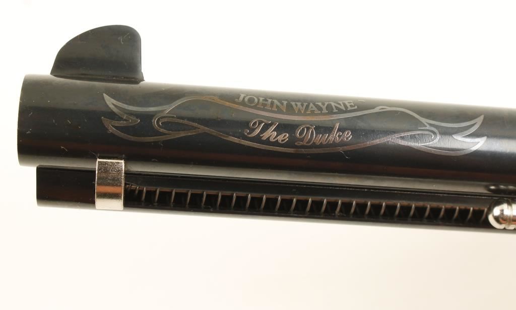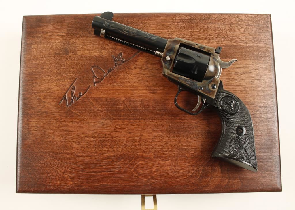 John Wayne Commemorative in presentation case and shipping box. Blued, case colored, black alloy. Six shot single action revolver with a 4 1/2" barrel. Bluing on barrel, cylinder and ejector rod housing is excellent. The barrel is embellished with the name John Wayne over a ribbon that has "The Duke". Frame is color case hardened. Hammer, trigger, cylinder pin and ejector rod are plated with no marring. Alloy grip frame is in excellent condition. Black plastic grips are in fine shape. Rear sight is adjustable for wind and elevation. Hammer block safety. Hardwood box includes: metal plaque with the likeness of John Wayne, his birth date and birthplace. Box is lined in burgundy velvet, outside lid of box has the Colt logo and "The Duke" stamped into it. Box and gun are both in excellent condition. *Modern Firearm*