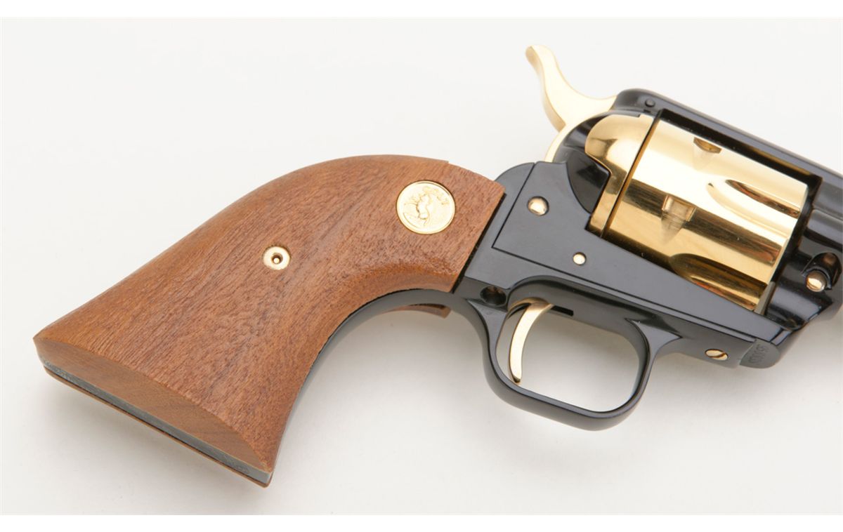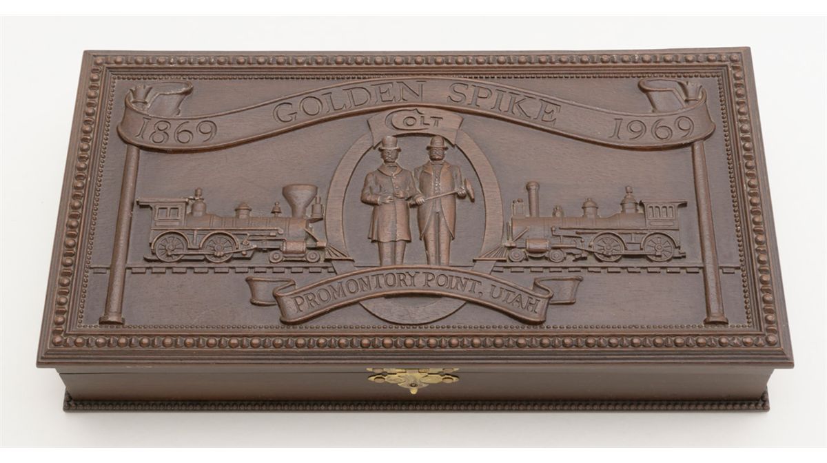 Colt Frontier Scout Golden Spike Commemorative (1869-1969) revolver, .22LR cal., 6” barrel, blue and gold finish, wood grain plastic medallion grips, #9566GS in plastic display case with gold spike accessory. This gun is in like new condition showing little handling. Est.: $600-$1,200.
