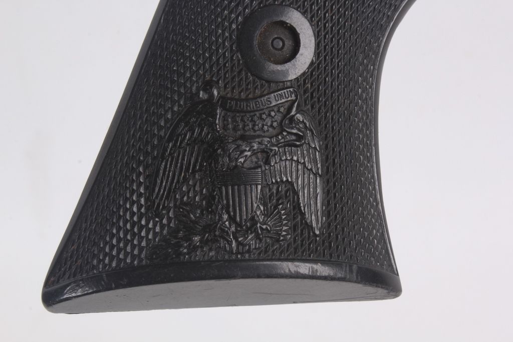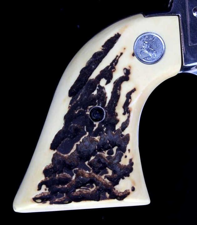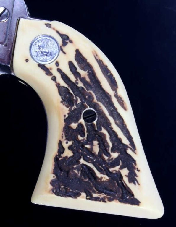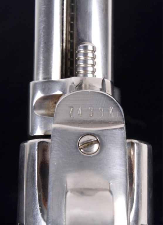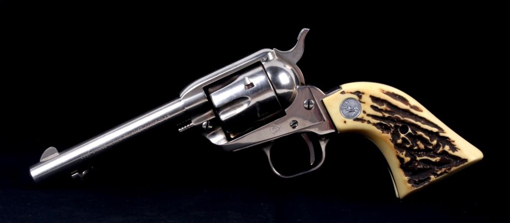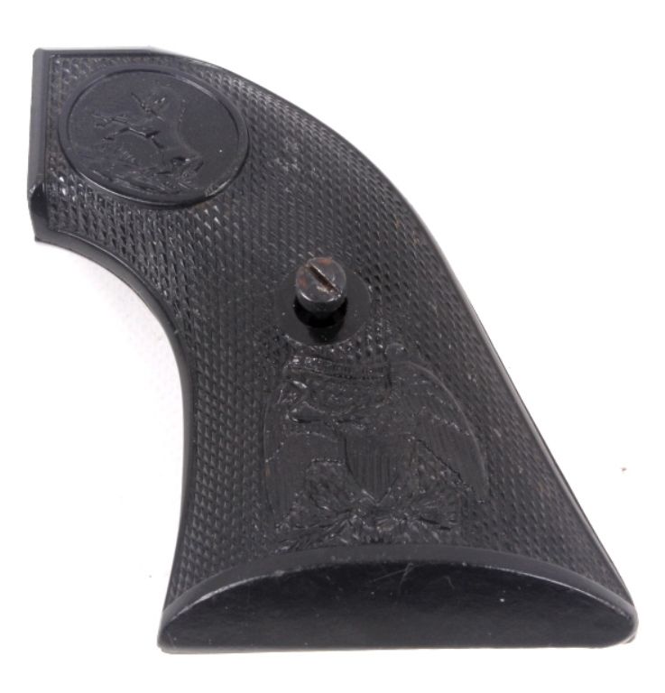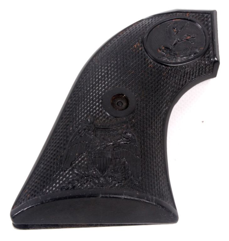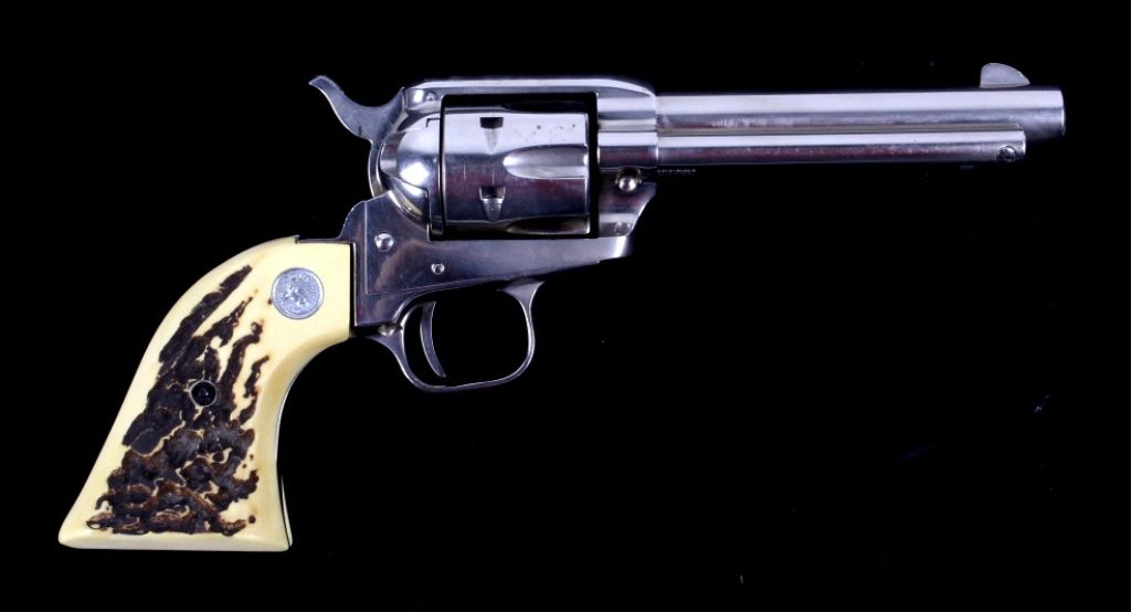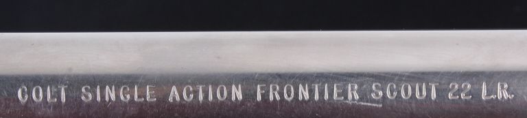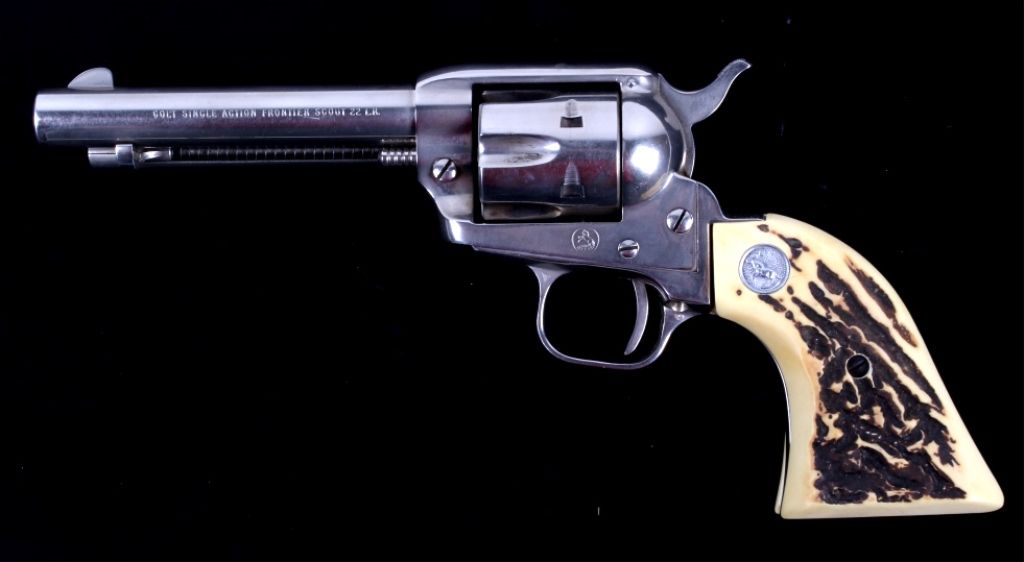 This is a Colt Single Action Frontier Scout 22 L.R. Revolver. This lot features original colt stag horn grips with the steel colt logo on both sides and also the original black Frontier Colt Grips. The hand gun is in very good condition with only a slight amount of wear at the end of the barrel. The butt of the handle shows what is believed to be factory engraving. The gun is serial number 7433K placing this at a manufacturing date of 1961 Frontier Scout K Model. This model of Scout used a Zamac alloy making it 6 oz. lighter than other models Q & F. Also comes with a hard black foam lined box.