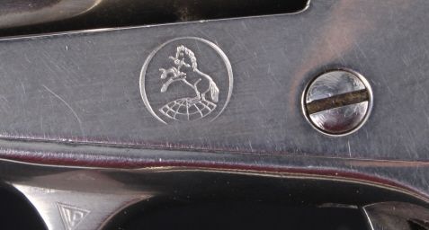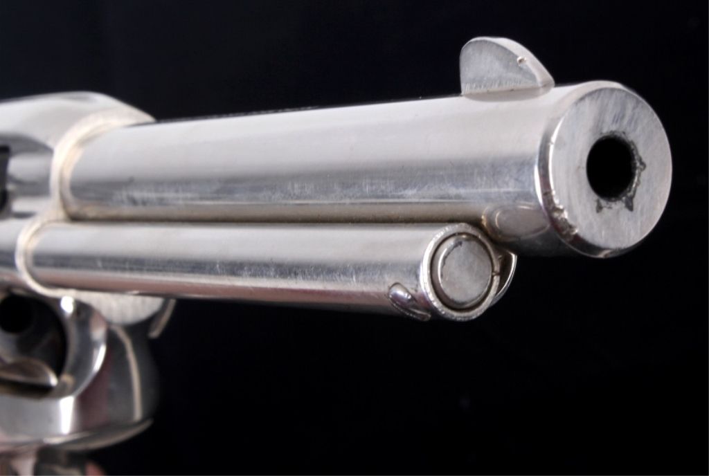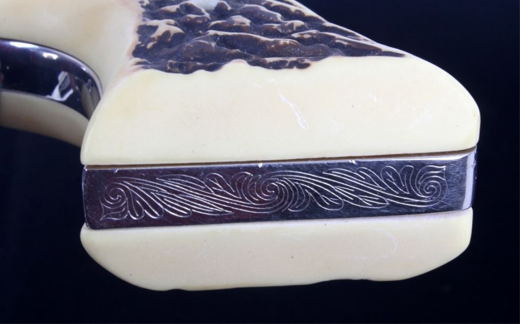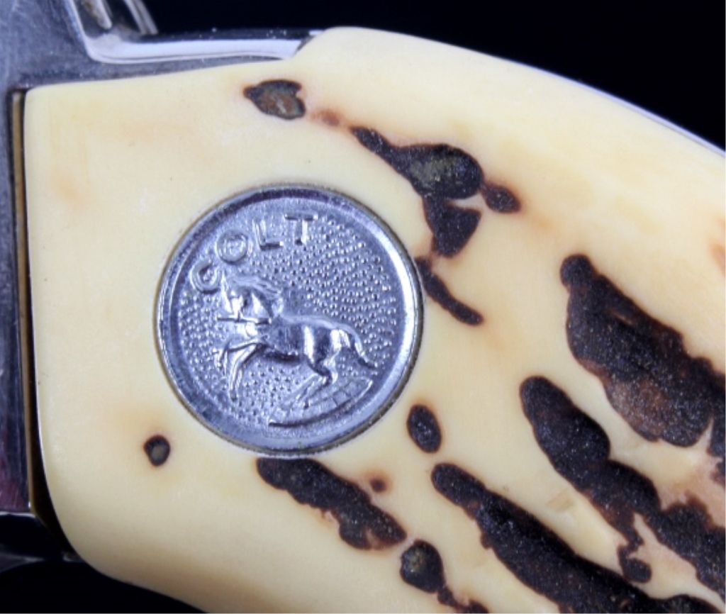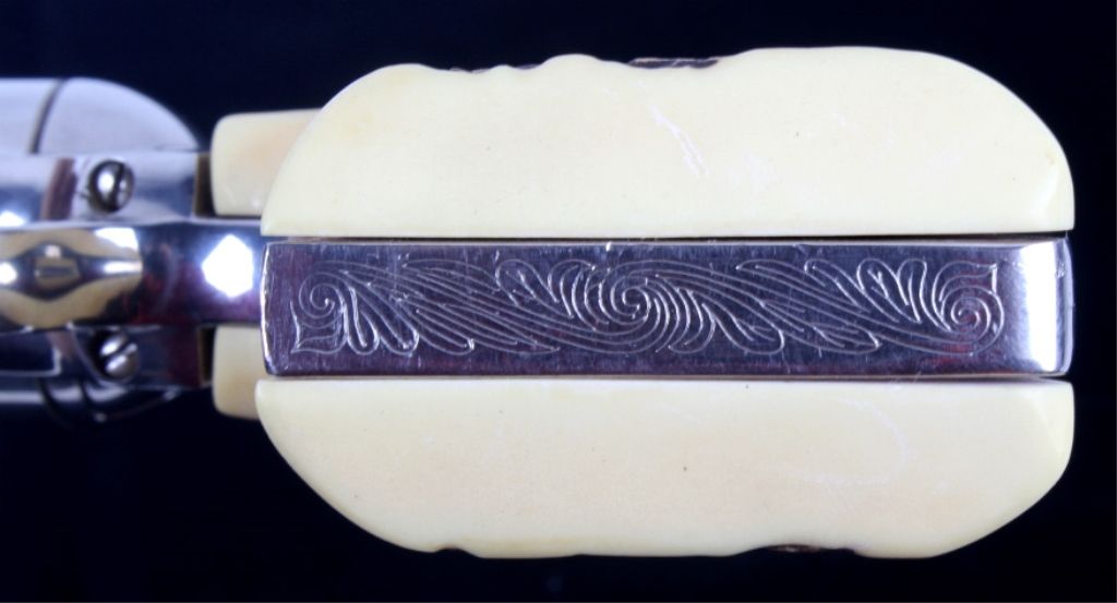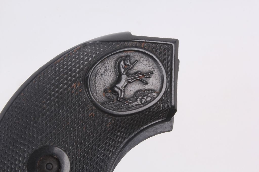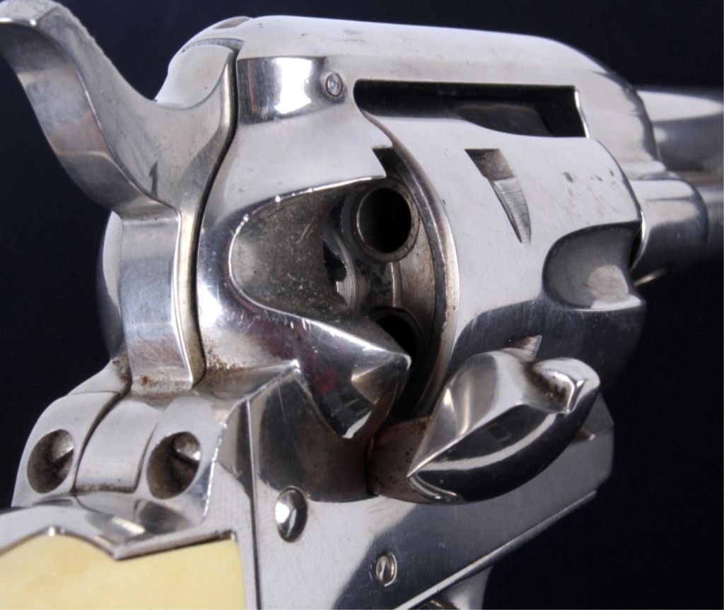 This is a Colt Single Action Frontier Scout 22 L.R. Revolver. This lot features original colt stag horn grips with the steel colt logo on both sides and also the original black Frontier Colt Grips. The hand gun is in very good condition with only a slight amount of wear at the end of the barrel. The butt of the handle shows what is believed to be factory engraving. The gun is serial number 7433K placing this at a manufacturing date of 1961 Frontier Scout K Model. This model of Scout used a Zamac alloy making it 6 oz. lighter than other models Q & F. Also comes with a hard black foam lined box.