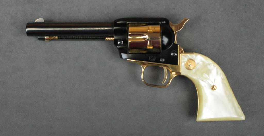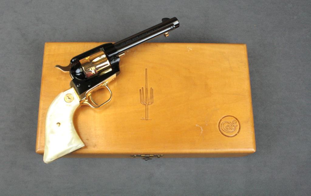 Colt Frontier Scout SAA Arizona Territorial Centennial (1863-1963) revolver in factory wood presentation box, .22LR cal., 4-3/4” barrel, black and gold finish, faux pearl medallion grips, #AT175. This gun is inoverall excellent condition showing approx. 99% original finish on barrel and frame and approx. 98% original gold finish on cylinder, straps, hammer, trigger, cylinder pin and ejector rod actuator; bore is fine, actioncrisp, markings are sharp and the grips are fine; the box is yellow lined and in overall very good condition. Est.: $350-$550.