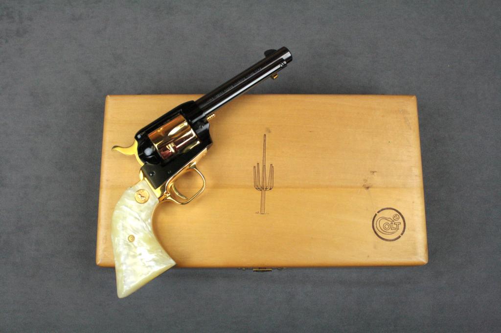 Colt Frontier Scout SAA Arizona Territorial Centennial (1863-1963) revolver in factory wood presentation box, .22LR cal., 4-3/4” barrel, black and gold finish, faux pearl medallion grips, #AT5200. This gun is inoverall fine condition showing approx. 99% original finish on barrel and frame; gold accent is also original finish on cylinder, straps, hammer, trigger, cylinder pin and ejector rod actuator; cylinder finish showssome spots of erosion on one flute rim; bore is fine, action crisp, markings sharp and grips fine; box is yellow lined and in overall very good to fine condition. Est.: $300-$500.