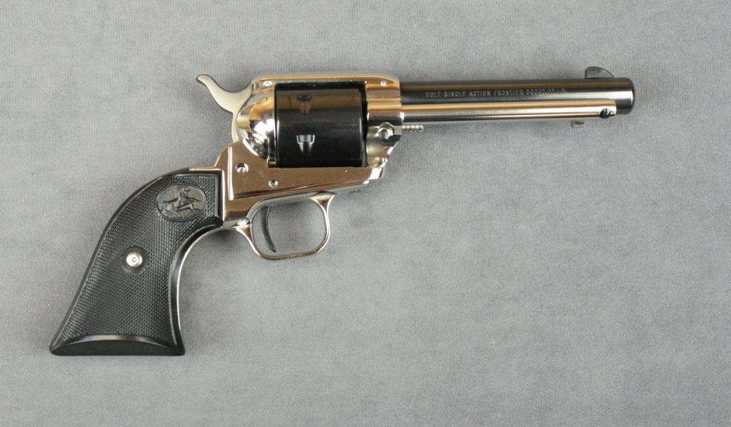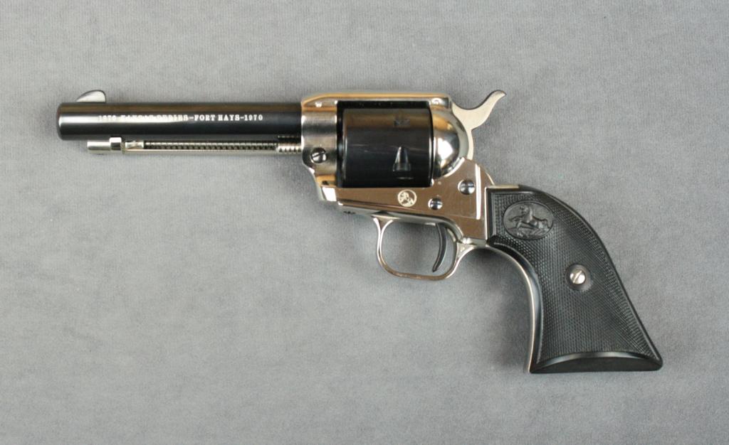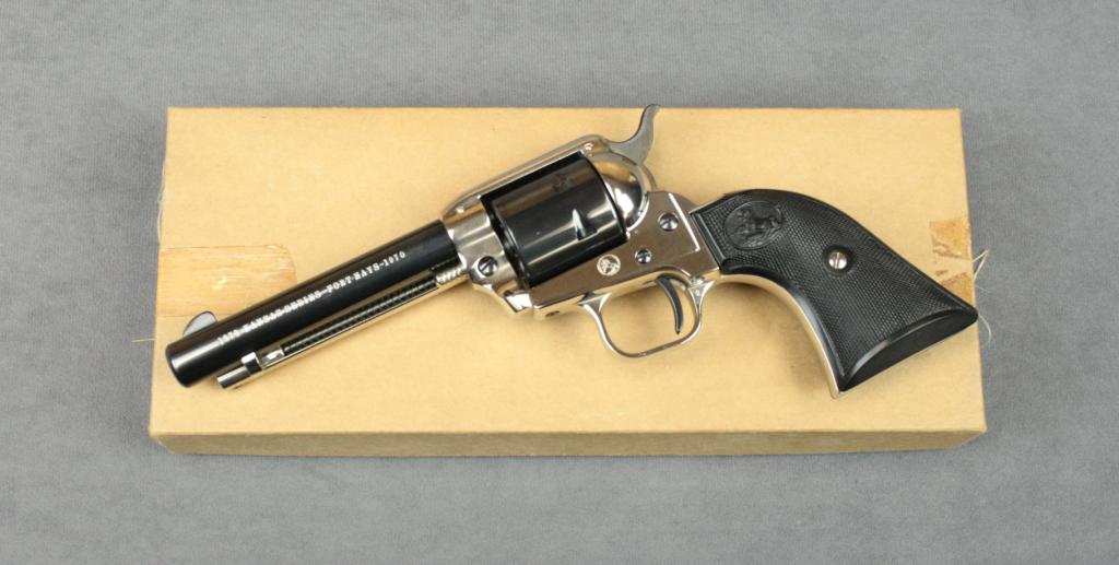Colt Frontier Scout SAA Kansas Series-Fort  Hays Commemorative revolver, .22LR cal.,  4-3/4” barrel, blue and nickel finish,  checkered black hard rubber grips, in factory  cardboard box with instruction sheet, #OFH.This gun is in overall like new condition  showing 99%+ original finish, fine bore,  action and markings; accompanied by a brass  tag marked “G.A.S. 55” indicating it was  likely in George A. Strichman’s collection,at one time, the President of Colt Firearms.   A total of only 500 of this commemorative  were produced and this was no doubt a special  order.  Est.:  $500-$800.