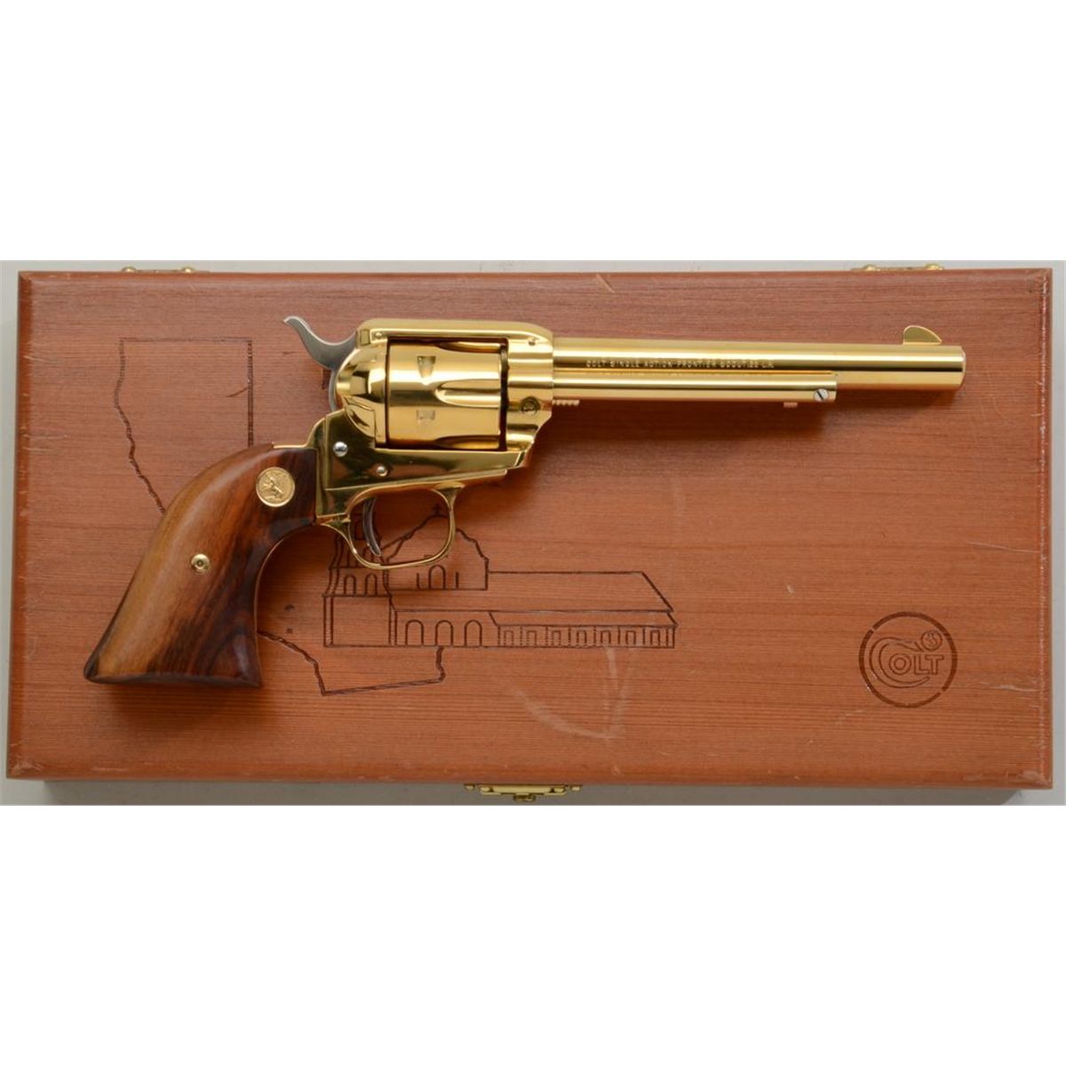 Colt Frontier Scout SAA revolver California Bicentennial (1769-1969) in factory wood presentation case, .22LR cal., 6” barrel, gold finish, medallion smooth wood grips, #164CB1. This gun is in like new conditionshowing little handling; excellent box. Est.: $300-$500.