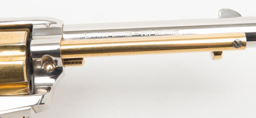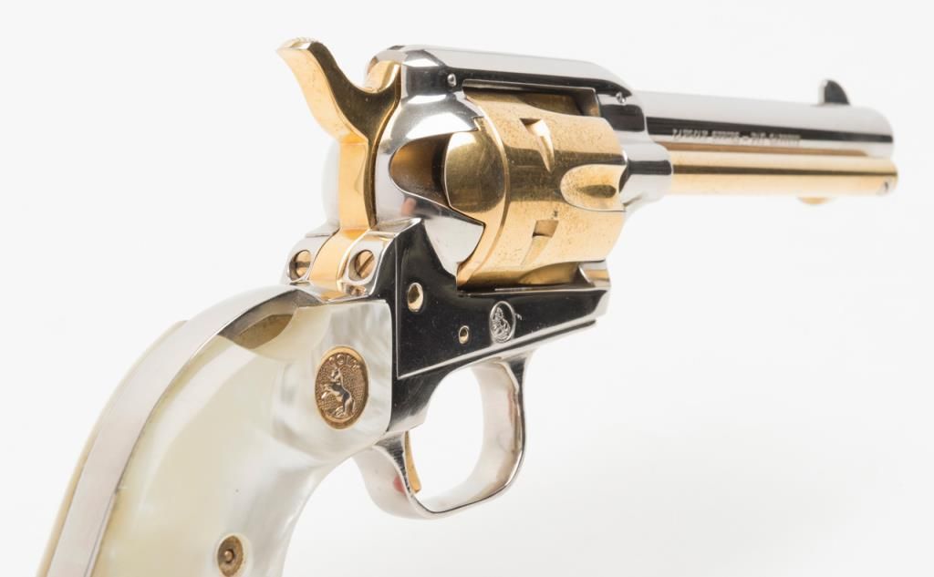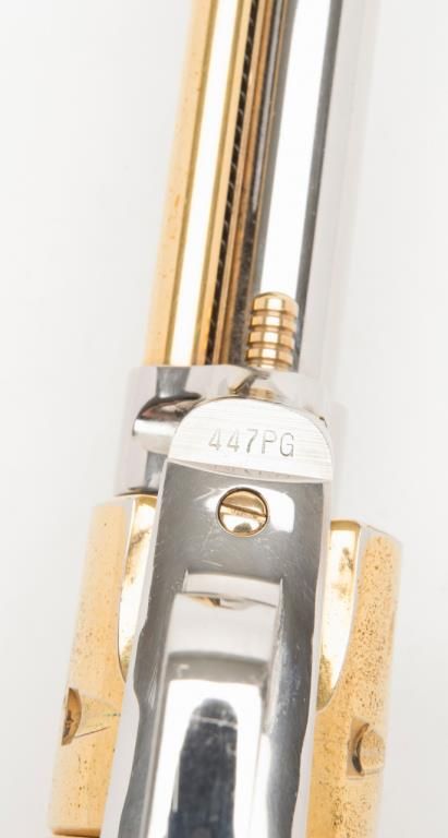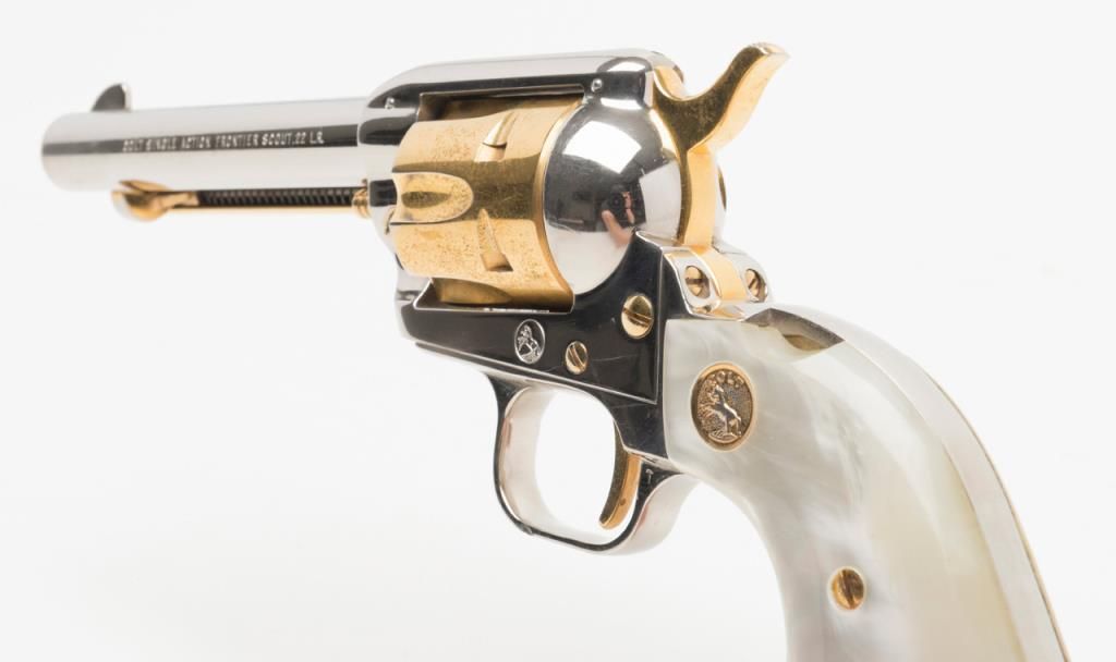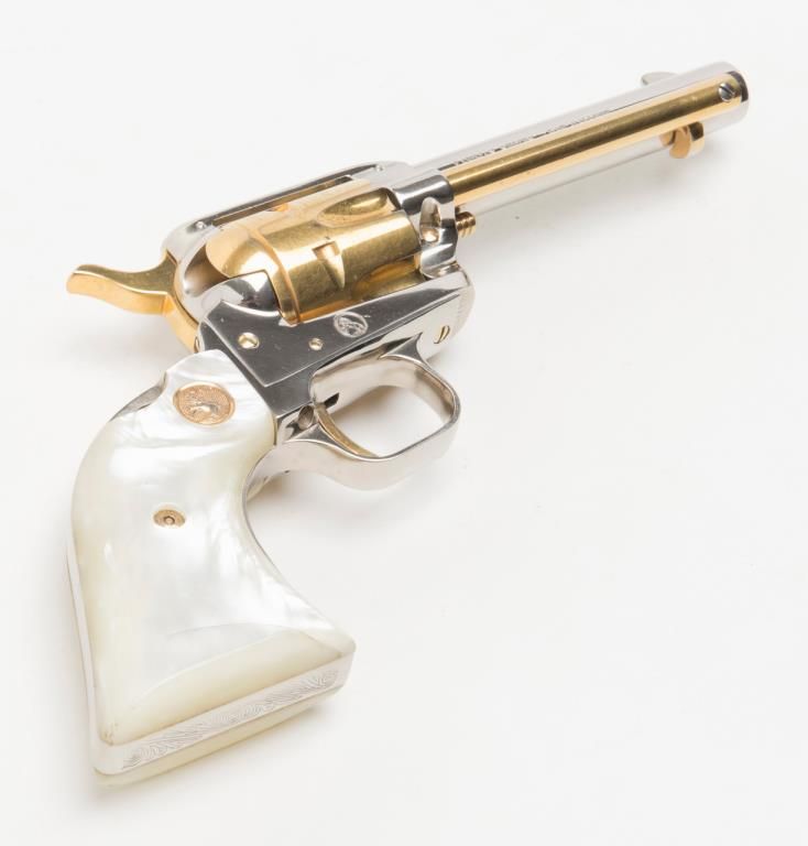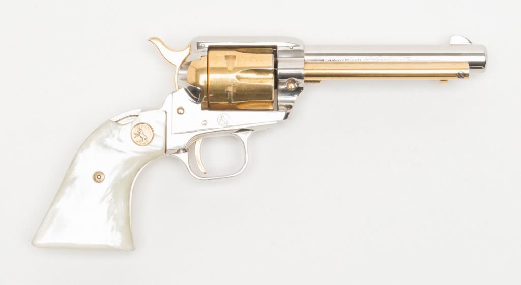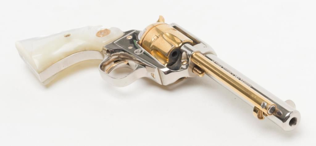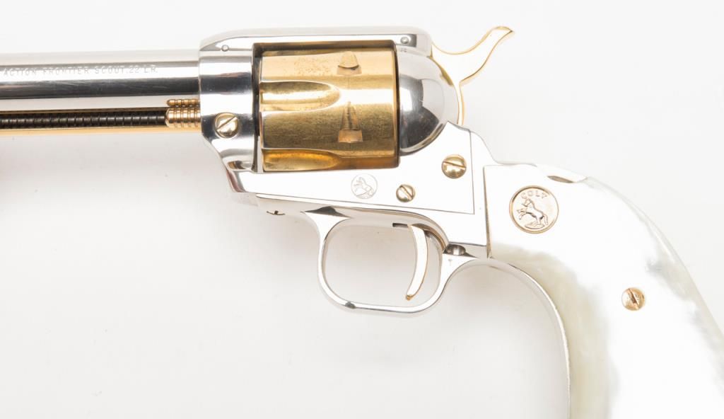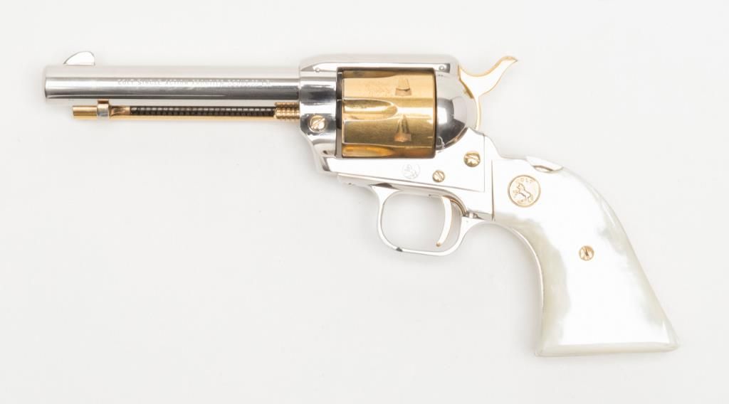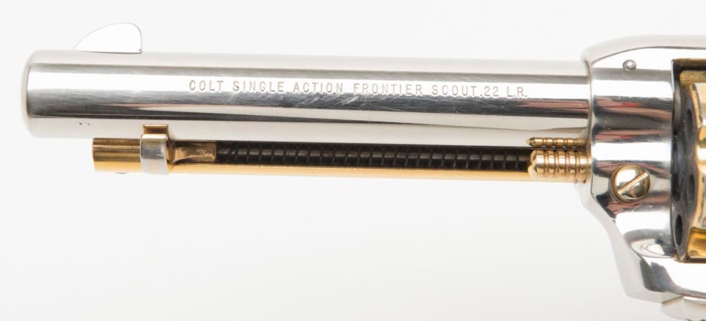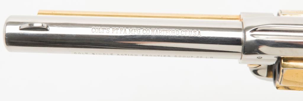 Colt Frontier Scout Single Action revolver, .22LR cal., 4-3/4” barrel, nickel/gold finish, pearlite medallion grips, #447PG in overall very good to near fine condition showing the majority of its original finish, crisp action and markings, goodbore; grips show losses on both sides at the top of the backstrap, otherwise good. (C&R/PPT). Est.: $300-$600.