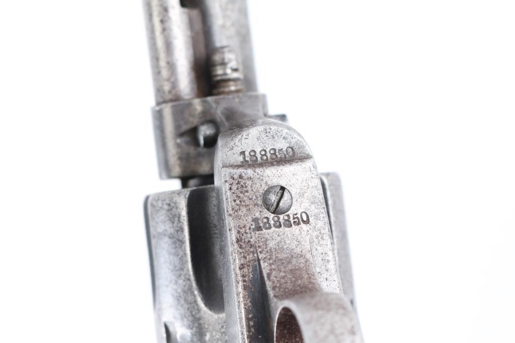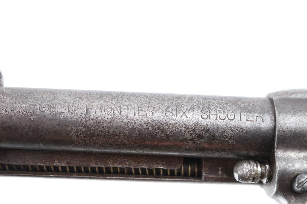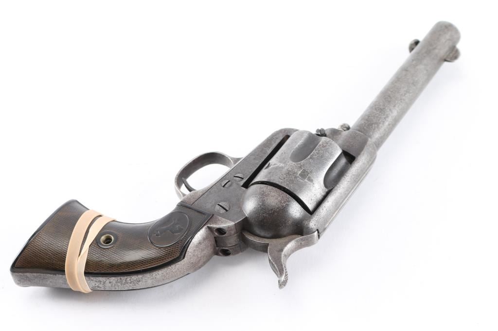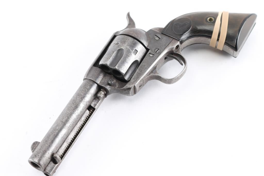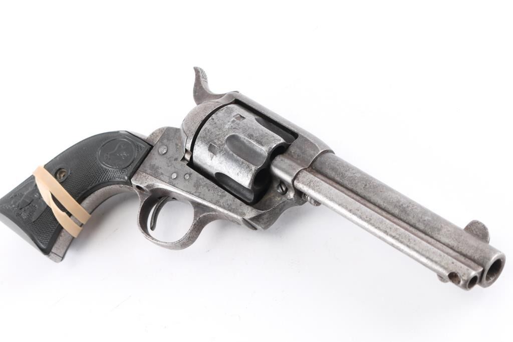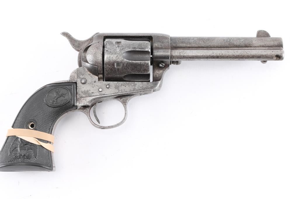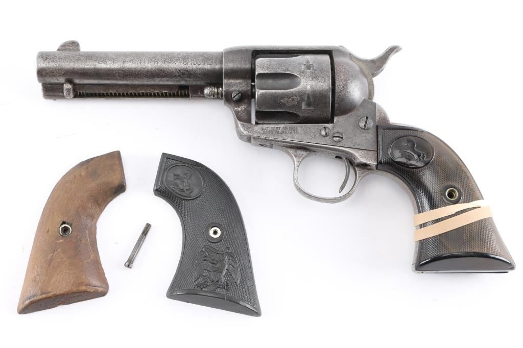 Vintage 1st Generation Colt SAA. 4 3/4" barrel. Manufactured 1898. Blue finish, case hardened frame, original left checkered black hard rubber grip with 'Rampant' Colts, the right panel is a newer replacement with rampant Colt, & American eagle,(No screw) matching left panel is included with the gun along with a left wood panel. Matching serial numbers on frame, triggerguard, & back Strap. Assembly number "587" on loading gate. Two line Colt address on top of barrel, "Colt Frontier Six Shooter" on left side. Bore is fair, strong rifling, scattered areas of light pitting. action is crisp/tight,. Revolver is basically in the white having turned a gray patina from handling wear, scattered pin-prick pitting throughout. Grips are good, handling wear to the Rampant colts & checkering. Markings are mostly clear, barrel markings are feint, but readable.