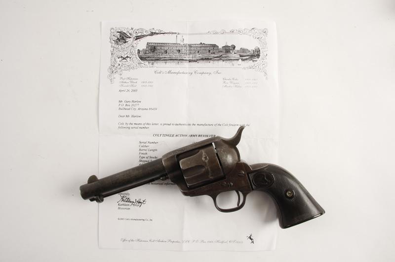 Colt Frontier Six Shooter Cal .45 SN:153249 Nice Colt SAA 1st Generation shipped to Texas in 1893. Finish on barrel still has a worn bluish cast and the frame shows a grey/brown patina, black checkered grips with rampant Colt logo molded in the top. MatcNice Colt SAA 1st Generation shipped to Texas in 1893. Finish on barrel still has a worn bluish cast and the frame shows a grey/brown patina, black checkered grips with rampant Colt logo molded in the top. Matching serial numbers exceptthe loading gate, good bore and working action. Cylinder and barrel modified from original .38/40 caliber, probably during period of use. Condition: Very good with some erosion on the front of the frame. Grips are very good with fournotches at the base? Most of the screws are somewhat buggered but appear original except the grip screw. A nice collectable 1st Gen that has an included Colt Factory letter.