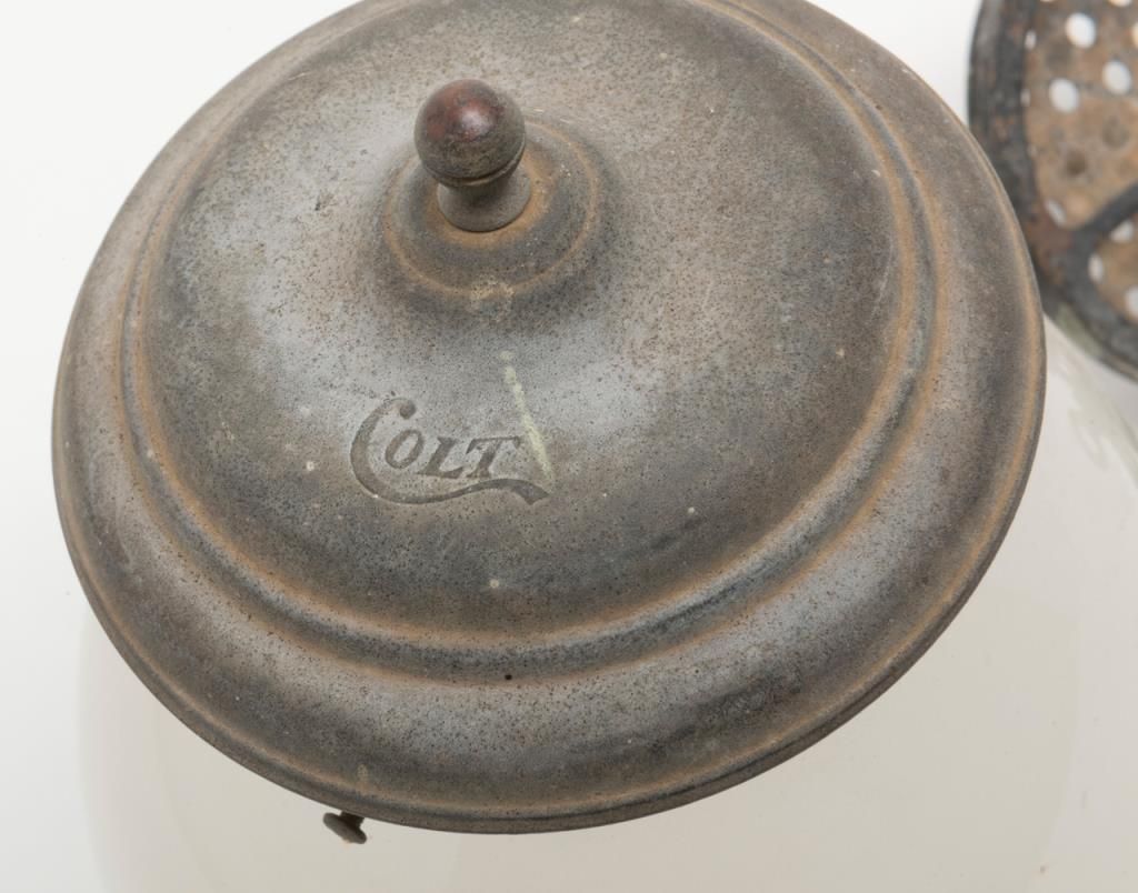 Colt Gas Porch light, circa 1900, from one of the first houses in Texarkana, Texas, in overall un-cleaned very good condition. From the estate of Joe Kiser. Est.: $200-$400.