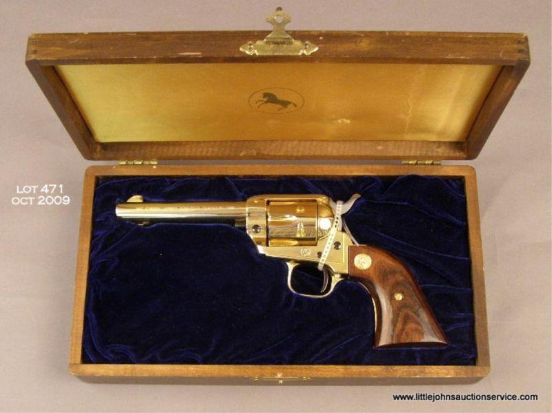 Colt General Hood’s Tennessee Campaign Commemorative (1864-1964) Frontier Scout Single Action, .22 cal., 4-3/4” barrel, gold finish, smooth wood medallion grips, #1358GH. This gun is in overall fine condition showing little handlingand is cased it a Colt lined wood presentation box that is in good overall condition but with scattered nicks and mars from storage on the top of the lid. Est.: $300-$500.