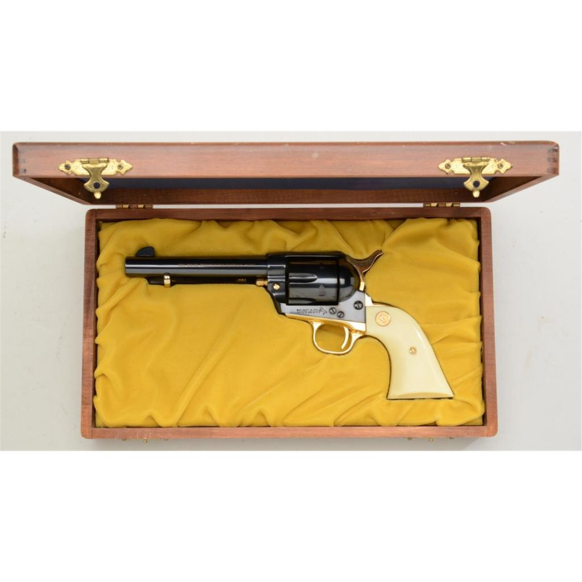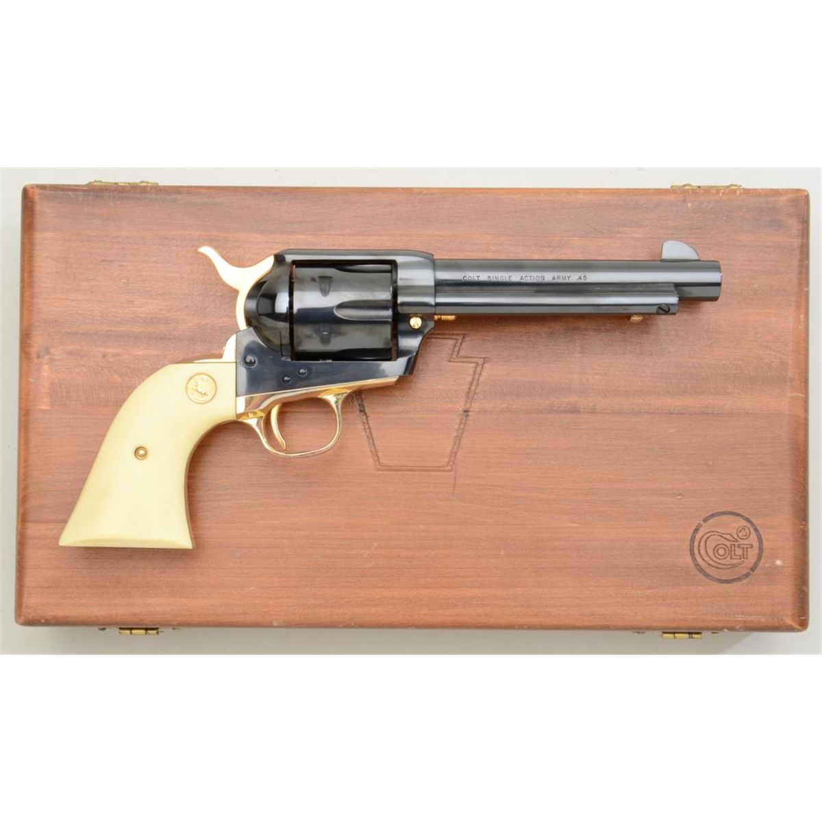 Colt General Meade Pennsylvania Campaign Commemorative SAA revolver, .45 cal., 5-1/2” barrel, blue finish, faux ivory medallion grips, #0142MC, in factory lined wood presentation case. This gun is in like newcondition showing little handling; fine box. Only 200 of this Commemorative Colt were manufactured in 1966. Est.: $1,200-$1,800.
