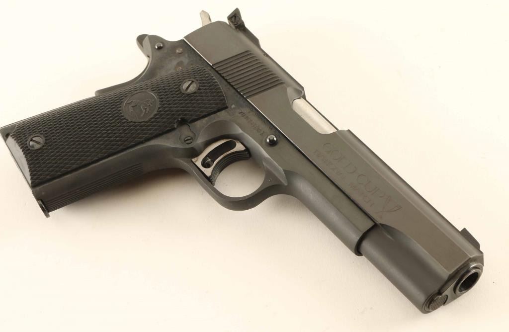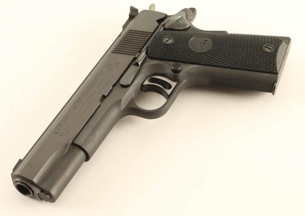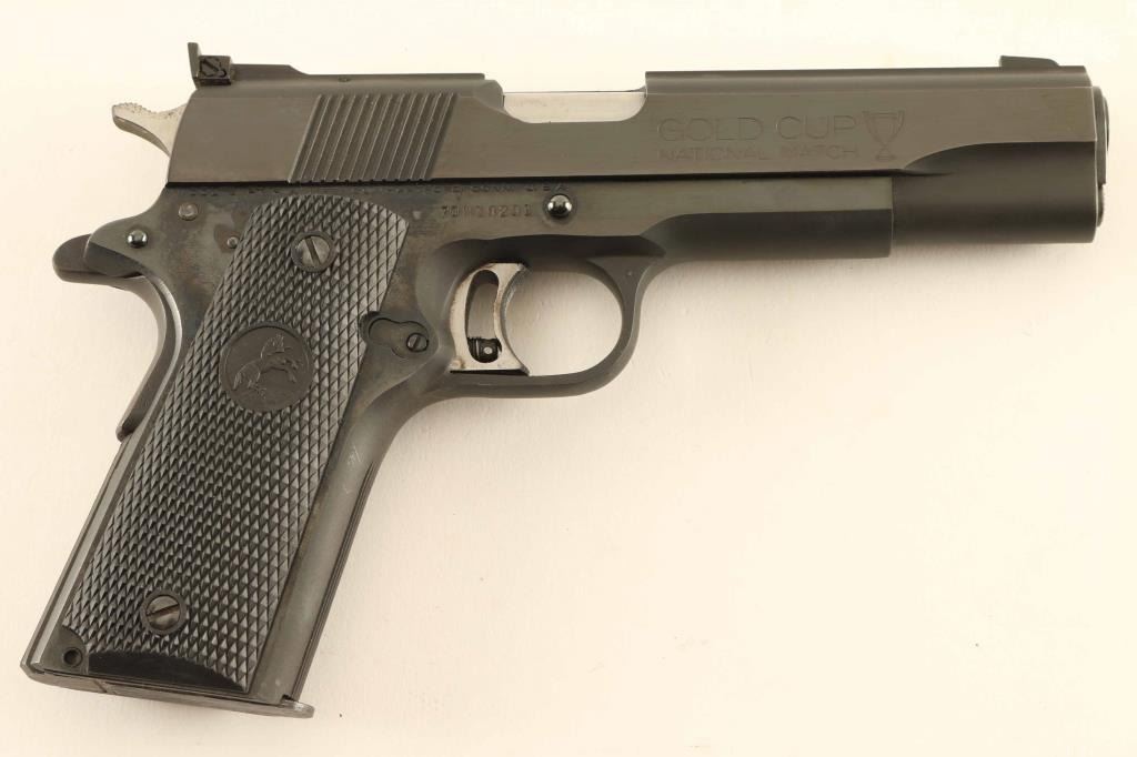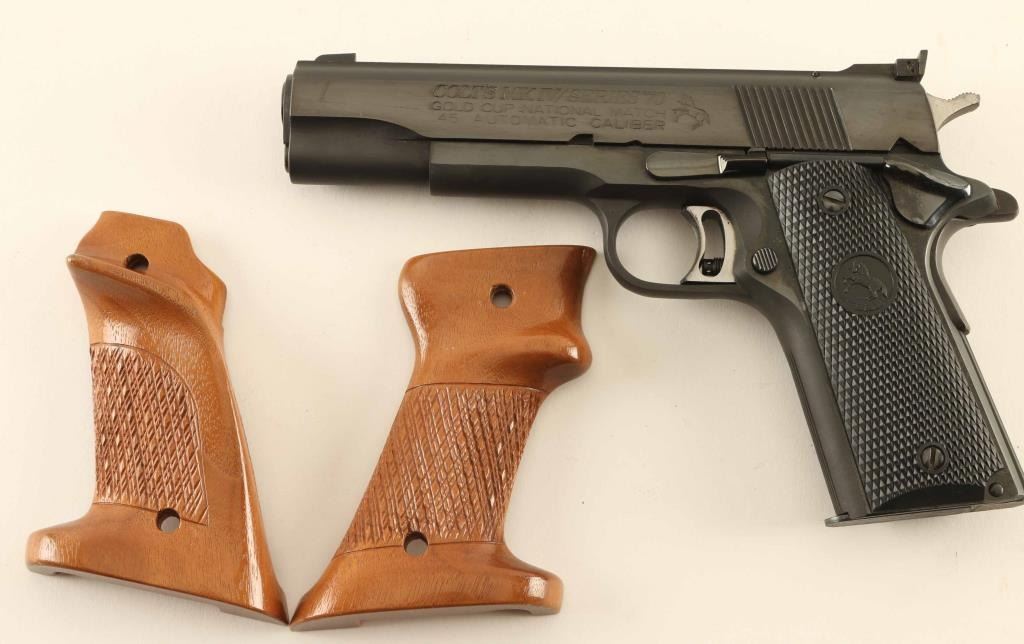 'MK IV Series 70' Desirable single action semi-automatic target pistol chambered in .45 Auto, manufactured circa 1974. Features a matte/polish blued finish, 5" N.M. barrel, patridge front sight, Elliason adjustable rear sight, flat-top slide, serrated wide trigger with overtravel adjustment, serrated hammer spur, thumb safety on the left side of the frame, grip safety, push button magazine release, 7 round magazine, steel frame, serrated straight mainspring housing and two-piece checkered black rubber grips with Rampant Colt decor. Includes a set of Herrett's Camp Perry Target stocks with skip line checkering. Pistol retains approximately 98% original bluing showing minor handling marks and some light surface rust on the grip safety & in the serrations of the mainspring housing. Action is smooth, the bore appears excellent but is dirty and the rubber grips are fine. Condition is near NRA Excellent. ***Modern Firearm***