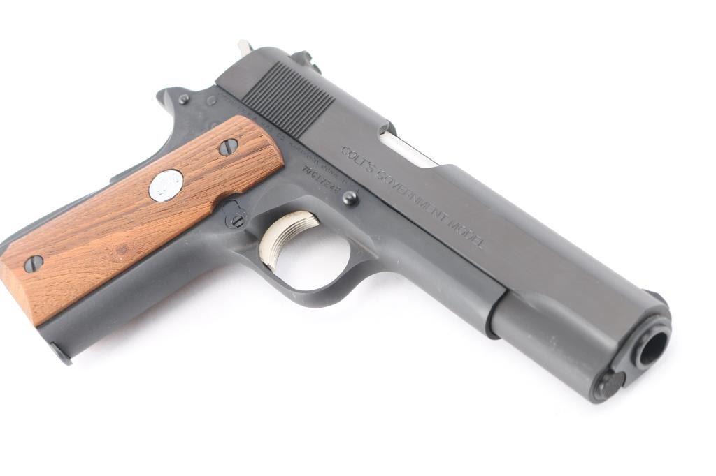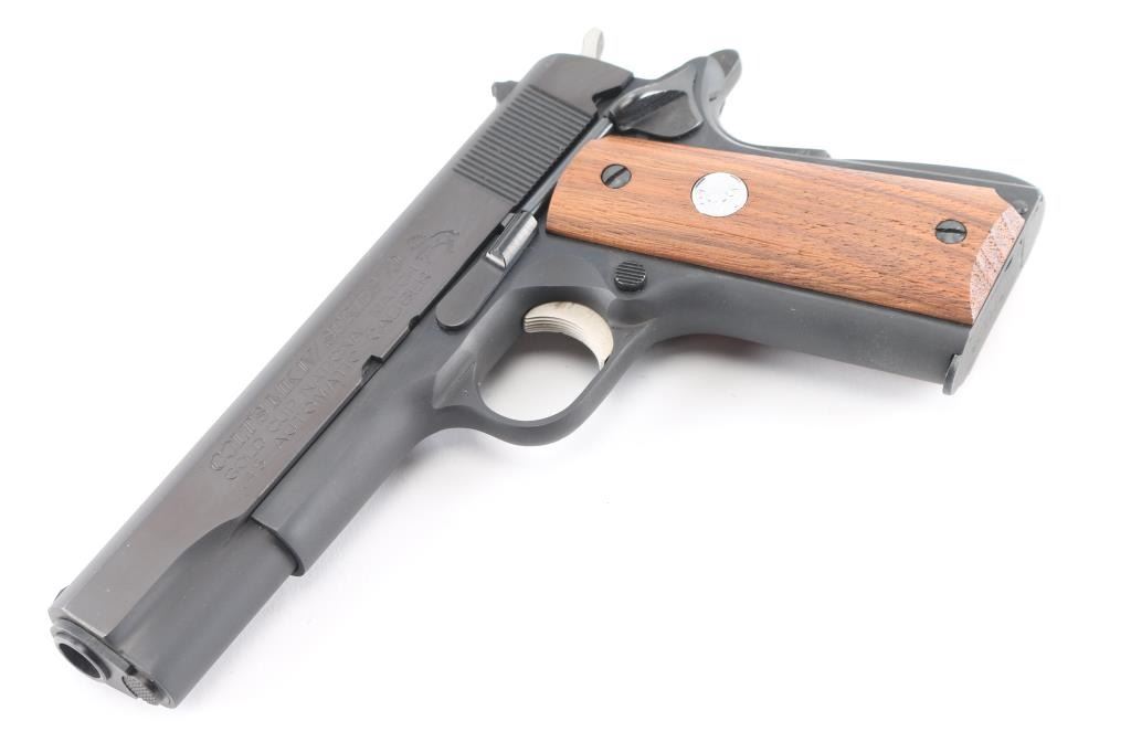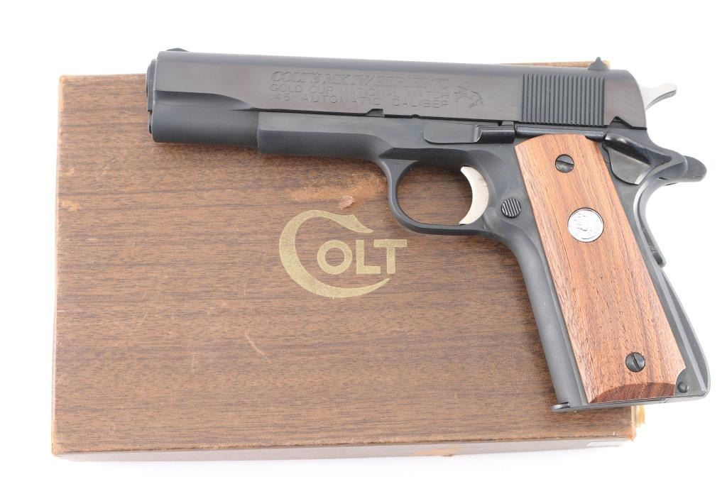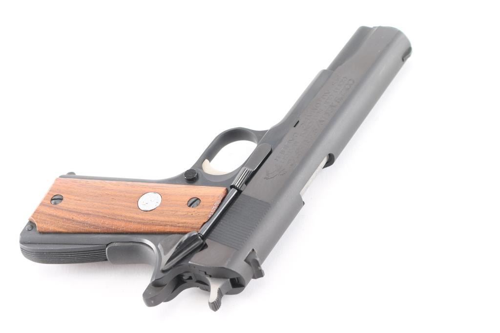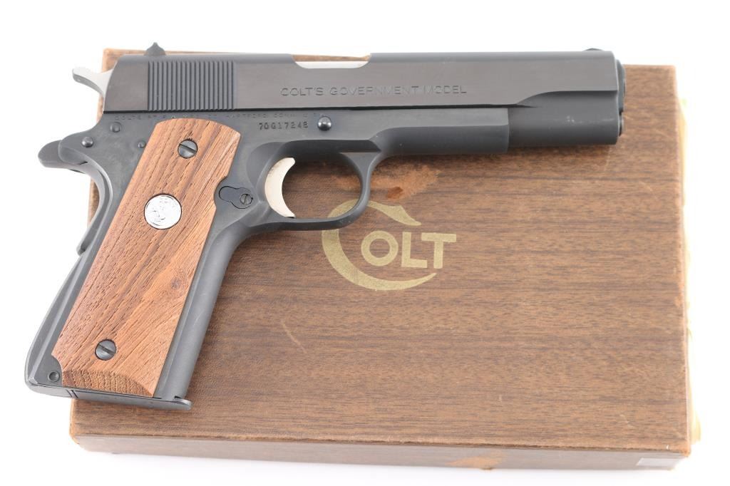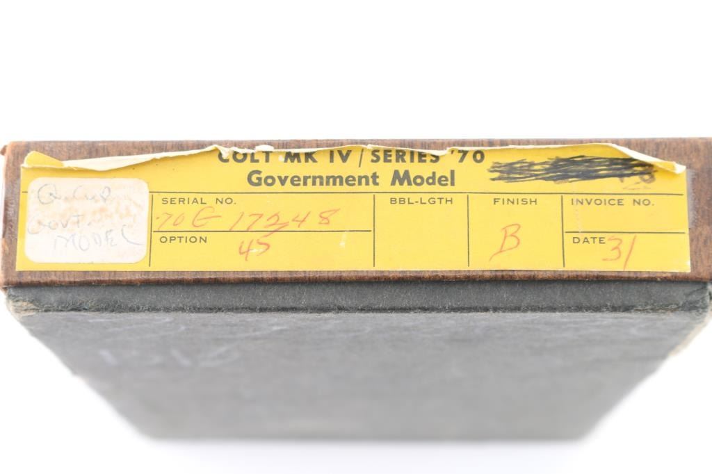 SN: 70G17248. 'Mk IV Series 70' 1911A1 pattern single action semi-automatic target pistol manufactured circa 1971. Features matte blued finish with polished sides, 5" barrel, blade front sight, dove tailed square-notch rear sight, serrated trigger, serrated hammer spur, thumb safety on the left side of the frame, grip safety, push button magazine release, steel frame, serrated arched mainspring housing, smooth wood grips with silver color Colt medallions. Bore is excellent/bright. finish is excellent. Grips are near perfect. Includes Colt styrofoam box with wood grain cardboard sleeve, manual, matching label, (1) magazine. At 53 years old, you don't see many in this condition.