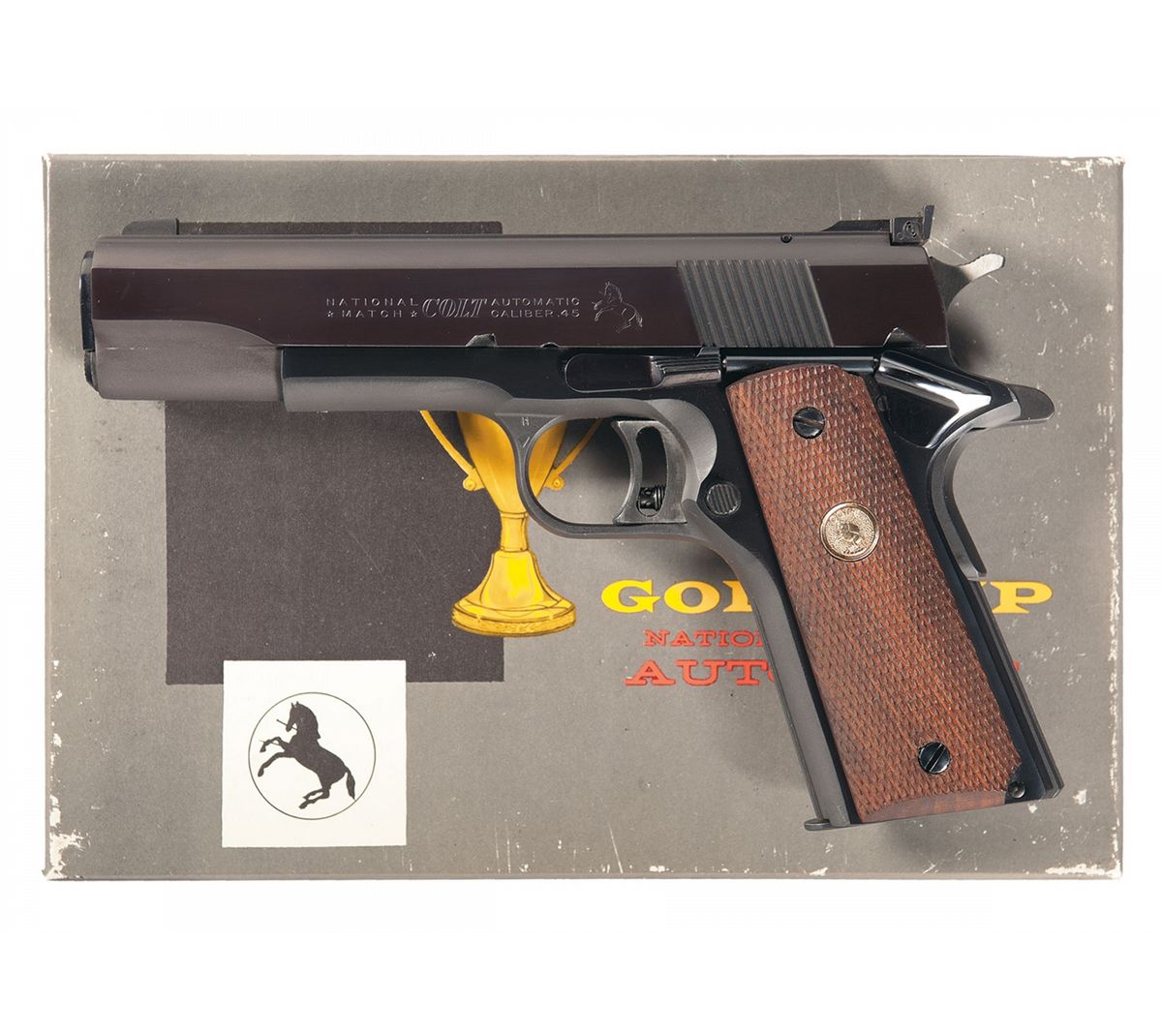 This pre-Series 70 pistol was manufactured in 1968. It features a fixed front sight with adjustable Elliason rear sight. The lightweight trigger has an adjustable trigger stop. Fitted with checkered grips with gold Colt medallions and a flat serrated mainspring housing. Complete with a correct two-piece Colt Gold Cup box.