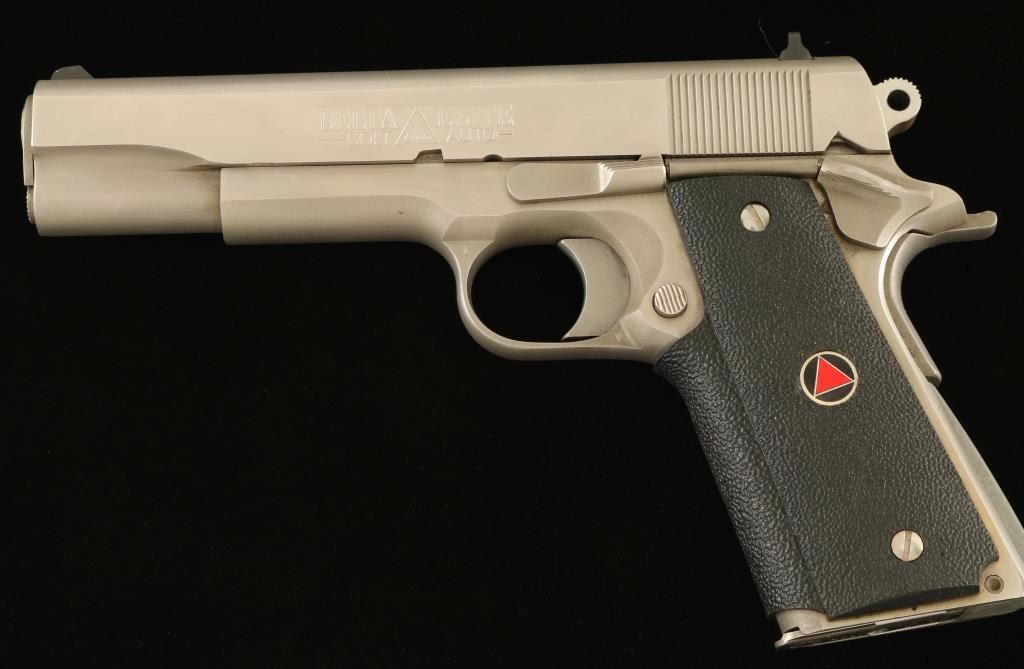 SN: DS02045 'Pre-Enhanced' Stainless steel 1911-A1 style single action semi-automatic pistol chambered in 10mm Automatic, circa 1988-1992. Features a blushed/matte finish, 5" barrel, patridge front sight with white dot, dovetailed two-dot rear window sight, smooth trigger, thumb safety, beavertail grip safety, serrated round hammer spur, push button magazine release, factory 8 round magazine, serrated arched mainspring housing and one-piece textured black rubber wrap-around grips with Delta medallions. Includes a factory hard case with manual and two spare magazines. Pistol exhibits only light handling marks/scratches with no major wear observed. Action is strong, bore is pristine and grips are fine. Condition is excellent. ***Modern Firearm***