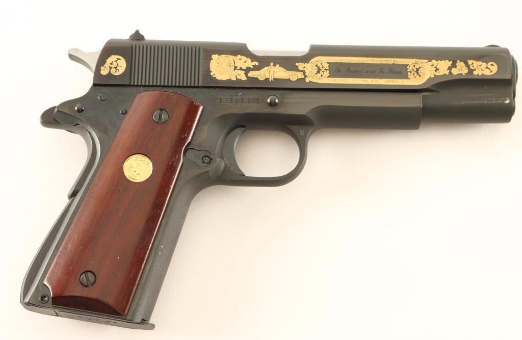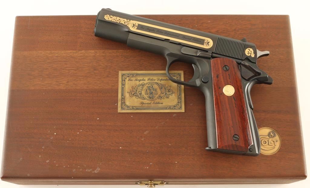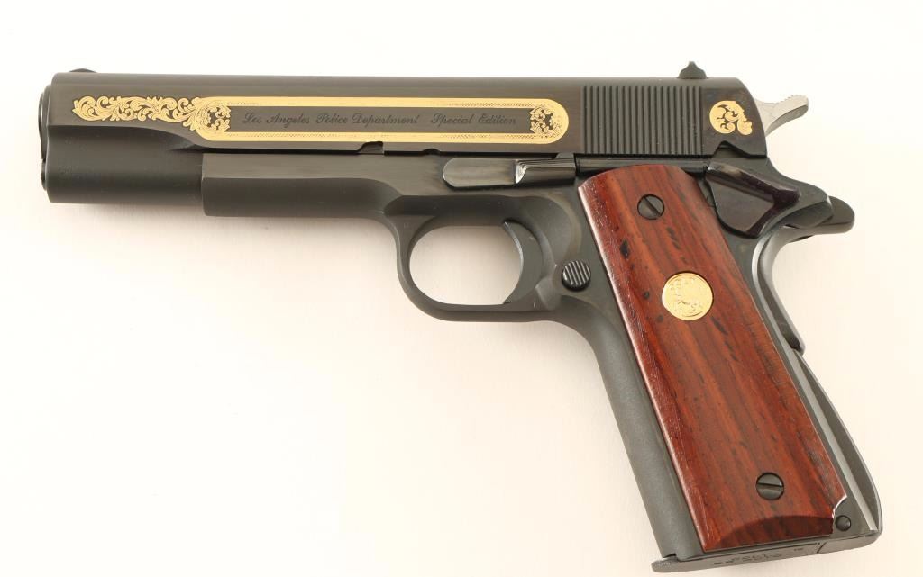 SN: 27682B70 'Los Angeles Police Department' Commemorative1911-A1 style single action semi-automatic pistol chambered in .45 Automatic. 1 of only 300 produced. Features a blued finish, engraved/gold inlayed slide law enforcement scenes surrounded by floral scroll, 5" MK IV Series '70 barrel, low-profile patridge front sight, dovetailed rear window sight, serrated trigger, serrated hammer spur, push button magazine release, factory 7 round magazine, thumb safety, beavertail grip safety, serrated arched mainspring housing, and two-piece smooth wood grips with gold Colt medallions. Includes a walnut presentation case with engraved brass plaque and blue velvet lined fitted interior. Pistol exhibits approximately 98%+ of it's original finish showing a small spot of wear on the right side of the slide near the recoil spring plug. Action is smooth, bore is pristine and grips are fine. Condition is near new in box. ***Modern Firearm***