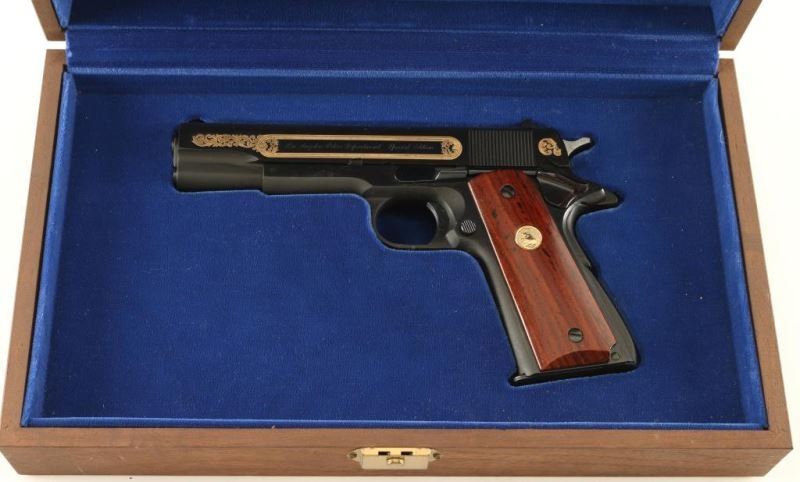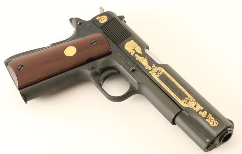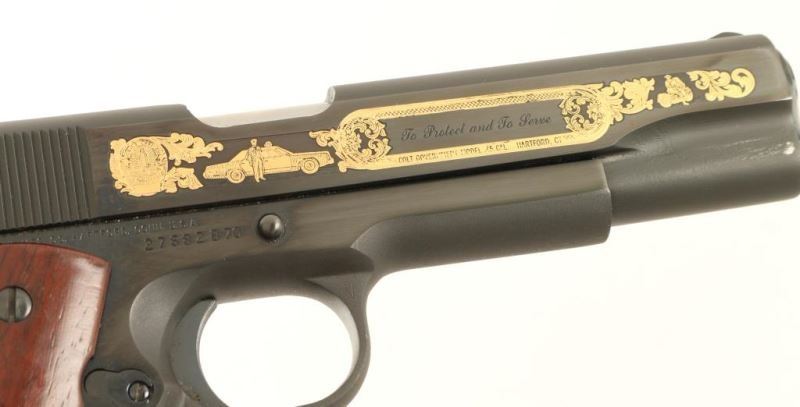 SN: 27682B70 'Los Angeles Police Department' Commemorative1911-A1 style single action semi-automatic pistol chambered in .45 Automatic. 1 of only 300 produced. Features a blued finish, engraved/gold inlayed slide law enforcement scenes surrounded by floral scroll, 5" MK IV Series '70 barrel, low-profile patridge front sight, dovetailed rear window sight, serrated trigger, serrated hammer spur, push button magazine release, factory 7 round magazine, thumb safety, beavertail grip safety, serrated arched mainspring housing, and two-piece smooth wood grips with gold Colt medallions. Includes a walnut presentation case with engraved brass plaque and blue velvet lined fitted interior. Pistol exhibits approximately 98%+ of it's original finish showing a small spot of wear on the right side of the slide near the recoil spring plug. Action is smooth, bore is pristine and grips are fine. Condition is near new in box. ***Modern Firearm***