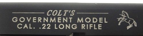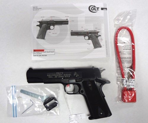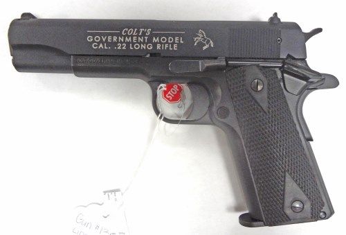 Colt Government 1911 Sem-Automatic Pistol. 22 LR. Finish: matte black. Action: semi-automatic. Stock: black synthetic. Capacity: 12+1. Magazines: 1. Safety: manual thumb and grip. Sights: fixed. Overall length: 8.6". Weight. 36 oz.