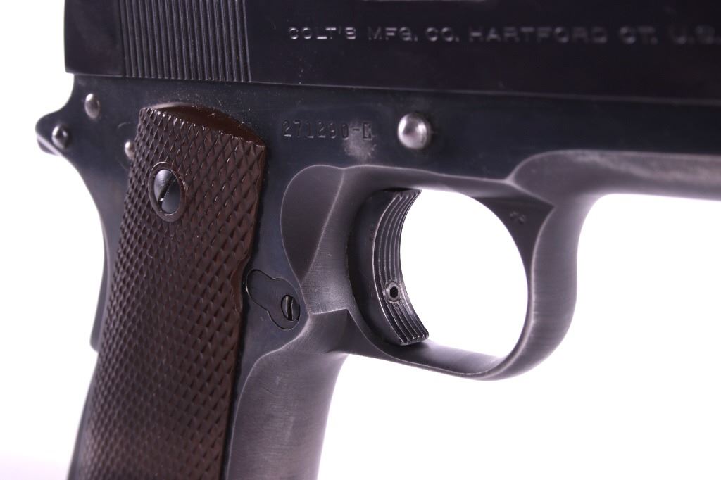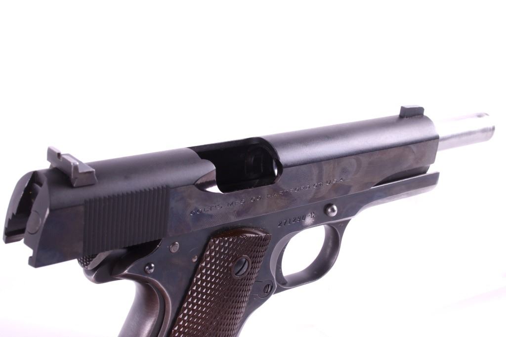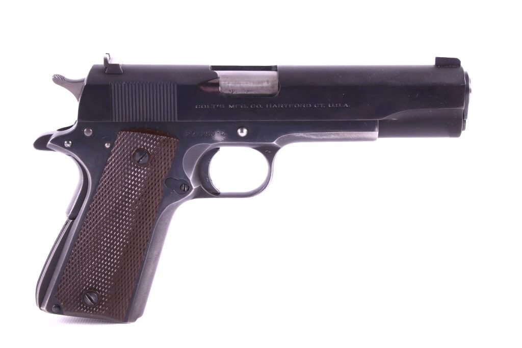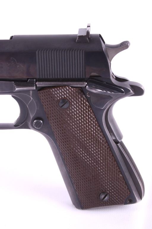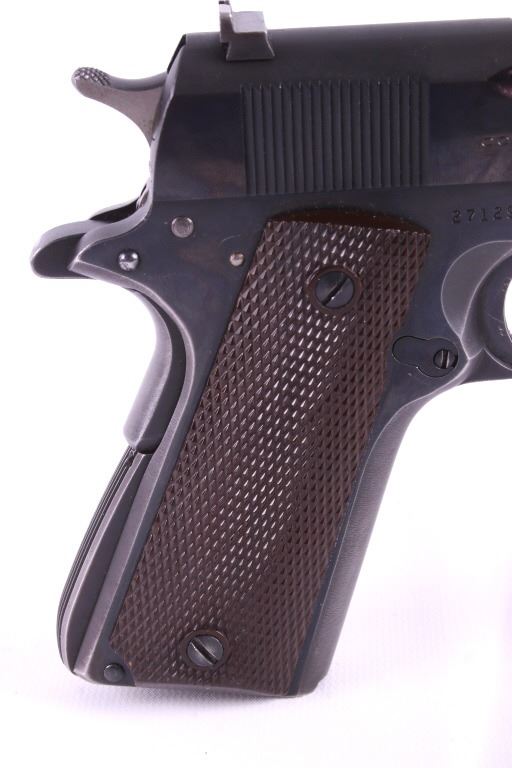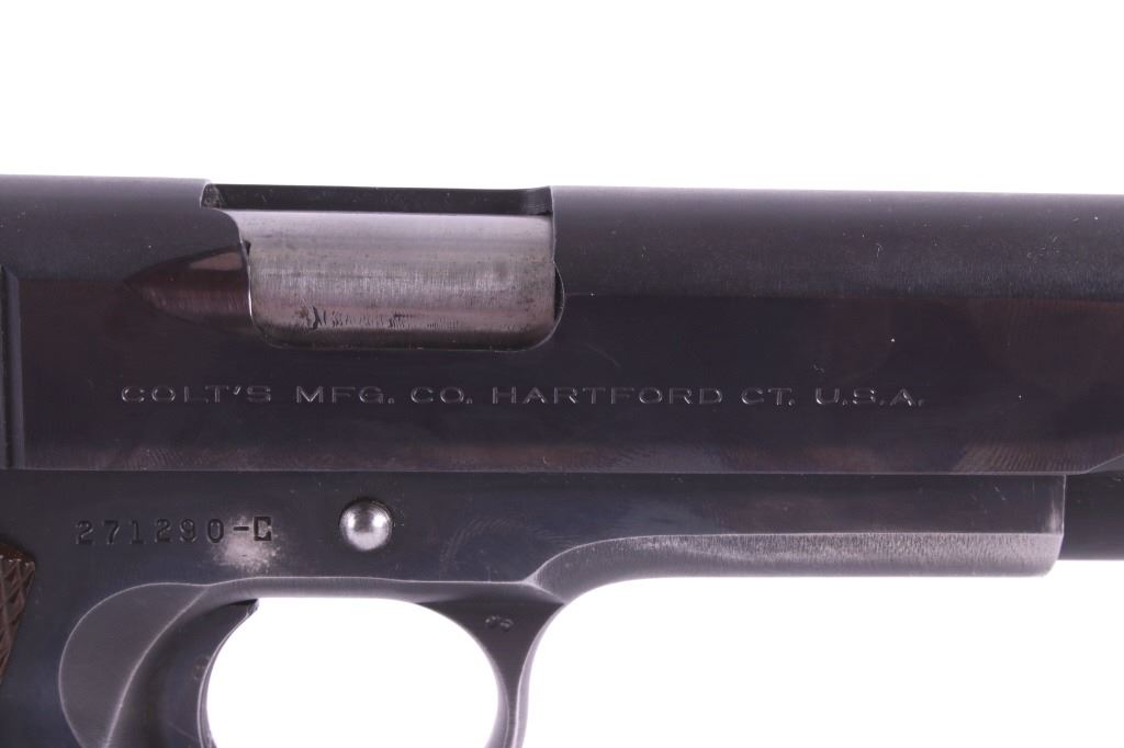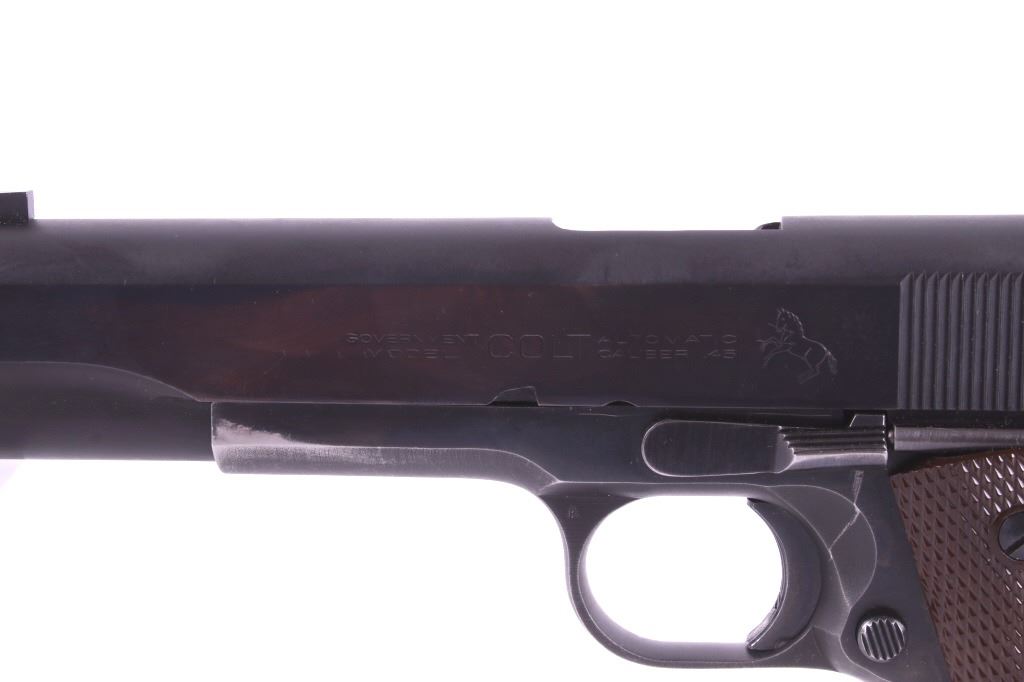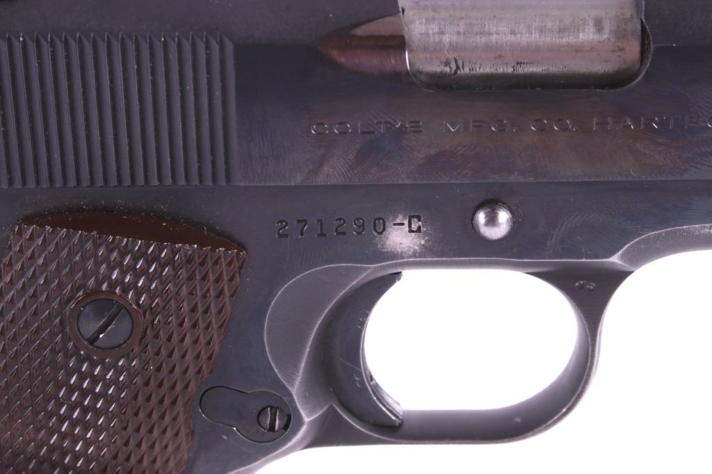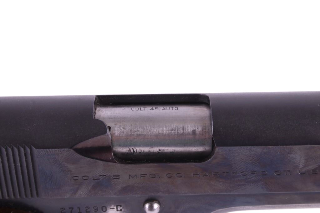 This lot features a Colt Government 1911 .45 ACP Pistol. The pistol features a 5" barrel, original wood checkered grips, adjustable rear sights, and blue'd finish. The M1911 is a single-action, semi-automatic, magazine-fed, recoil-operated pistol chambered for the .45 ACP cartridge. It served as the standard-issue sidearm for the United States Armed Forces from 1911 to 1986. It was widely used in World War I, World War II, the Korean War, and the Vietnam War. The pistol's formal designation as of 1940 was Automatic Pistol, Caliber .45, M1911 for the original model of 1911 or Automatic Pistol, Caliber .45, M1911A1 for the M1911A1, adopted in 1924. The designation changed to Pistol, Caliber .45, Automatic, M1911A1 in the Vietnam War era. The pistol shows good condition, with light holster wear. The mechanics are smooth and in good condition. The serial number shows it was built in 1956. This is a Curio & Relic Firearm. FFL transfer or NICS background check required. The serial number is 271290-C