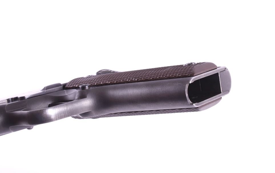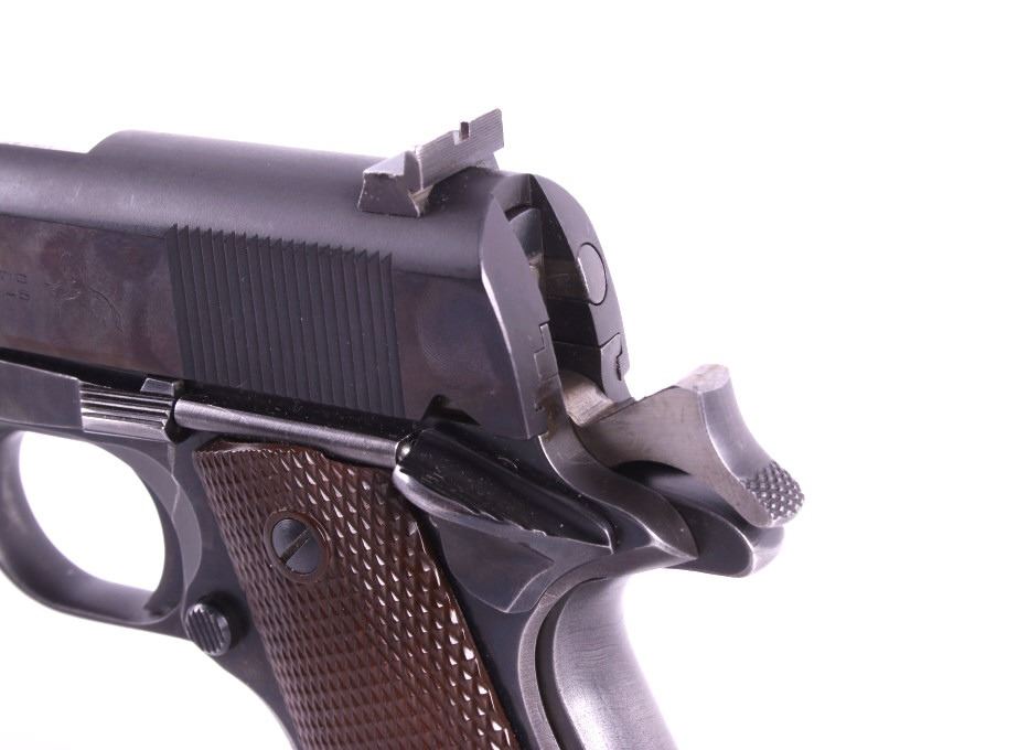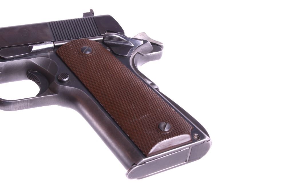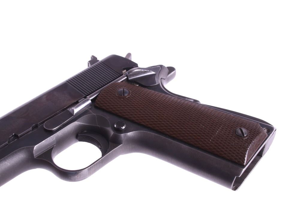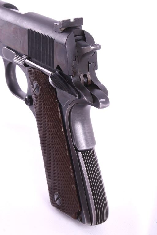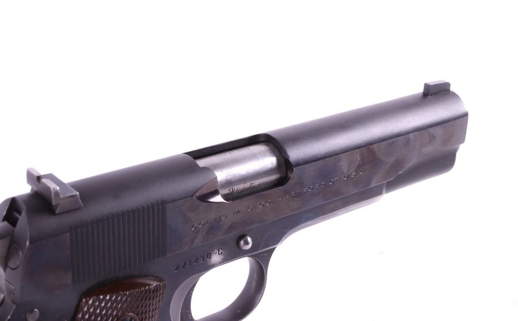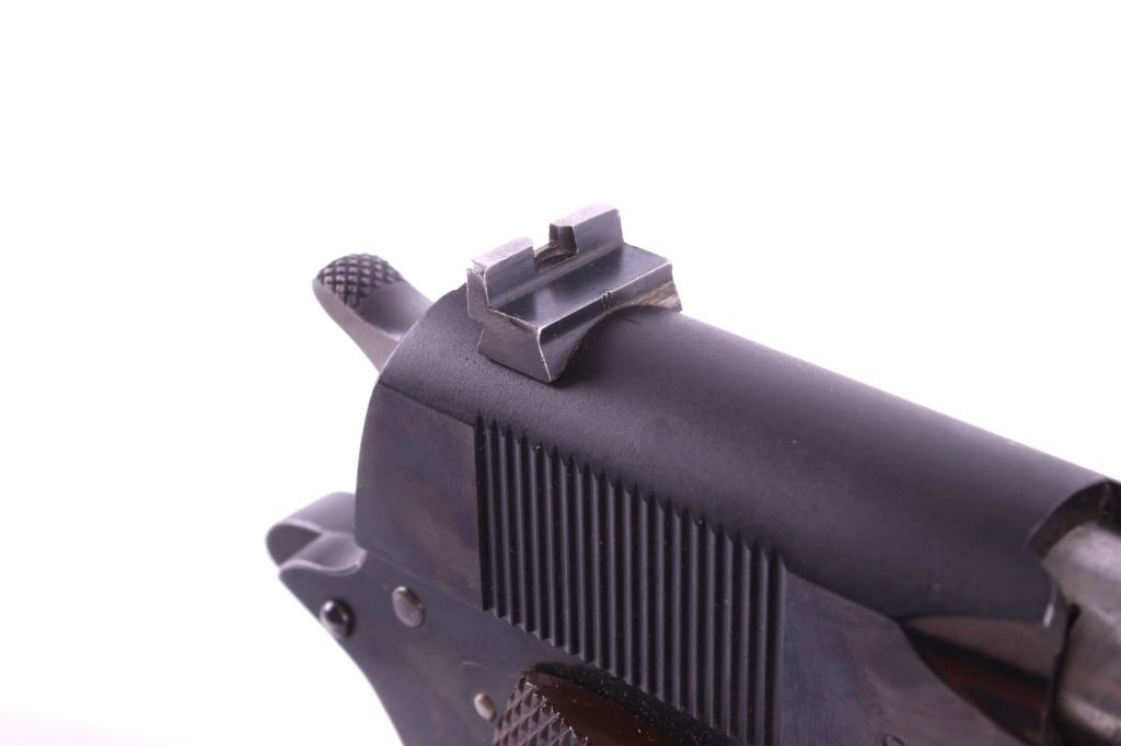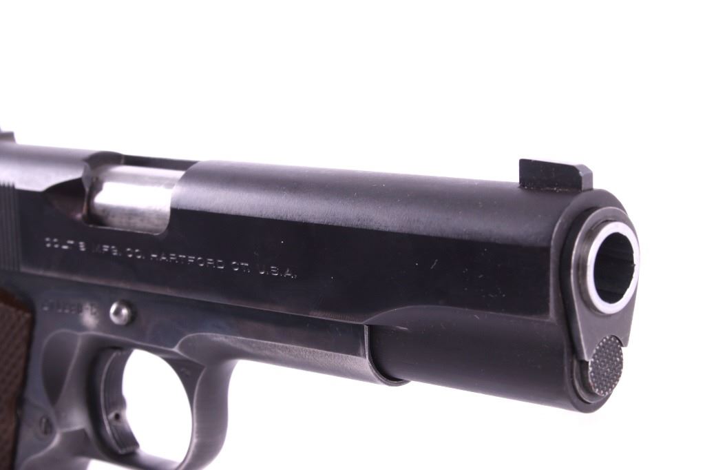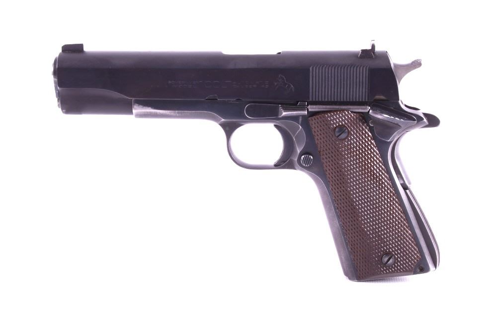 This lot features a Colt Government 1911 .45 ACP Pistol. The pistol features a 5" barrel, original wood checkered grips, adjustable rear sights, and blue'd finish. The M1911 is a single-action, semi-automatic, magazine-fed, recoil-operated pistol chambered for the .45 ACP cartridge. It served as the standard-issue sidearm for the United States Armed Forces from 1911 to 1986. It was widely used in World War I, World War II, the Korean War, and the Vietnam War. The pistol's formal designation as of 1940 was Automatic Pistol, Caliber .45, M1911 for the original model of 1911 or Automatic Pistol, Caliber .45, M1911A1 for the M1911A1, adopted in 1924. The designation changed to Pistol, Caliber .45, Automatic, M1911A1 in the Vietnam War era. The pistol shows good condition, with light holster wear. The mechanics are smooth and in good condition. The serial number shows it was built in 1956. This is a Curio & Relic Firearm. FFL transfer or NICS background check required. The serial number is 271290-C