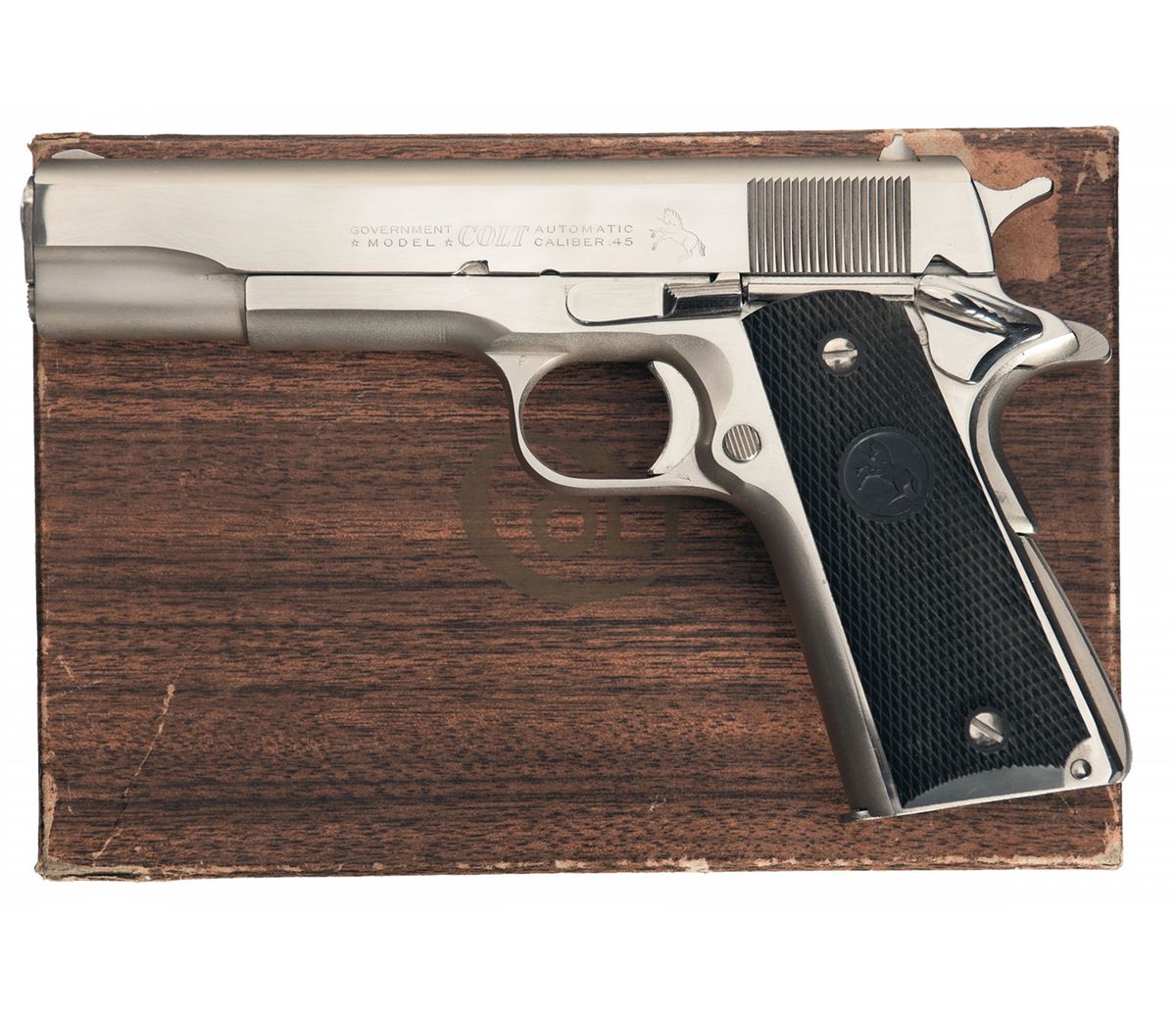 Manufactured in 1965 with fixed low-profile sights. The hammer, thumb safety, slide stop, trigger, magazine release and arched mainspring housing are serrated. Fitted with a set of checkered rubber grips with the circled Rampant Colt. With a Colt "woodgrain" box with matching label numbered to another gun and a set of nicely figured checkered walnut grips.