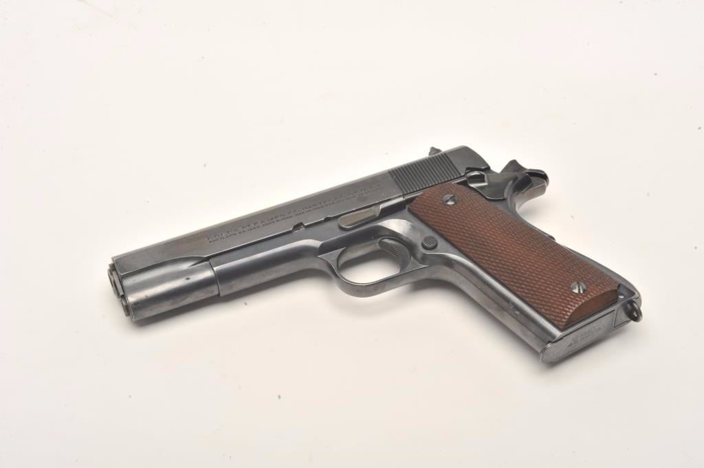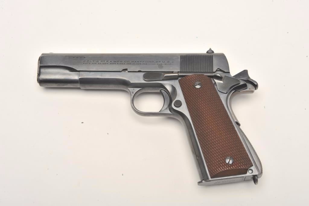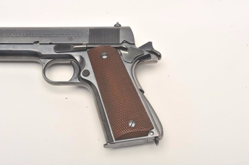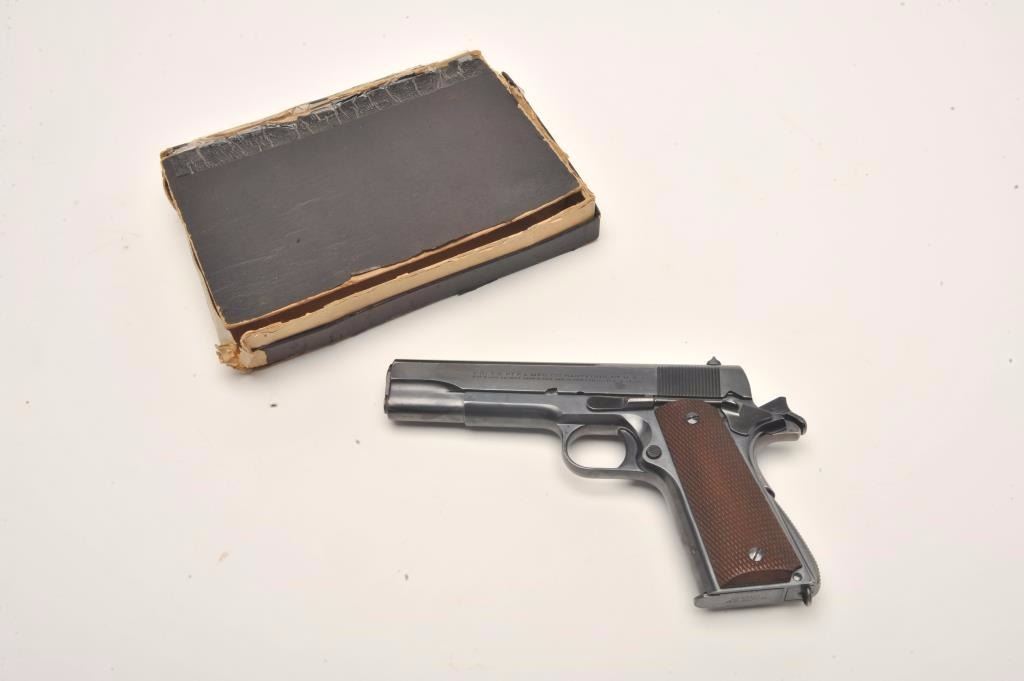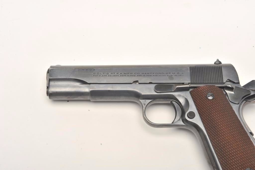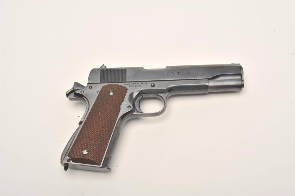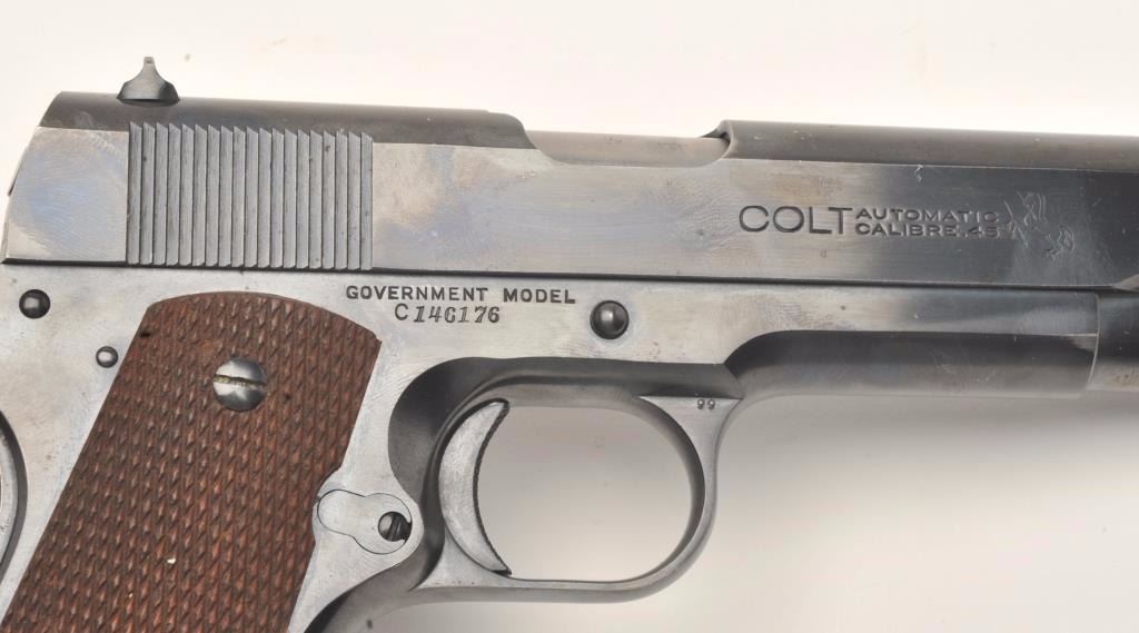 Colt Government Model 1911A-1 semi-automatic pistol, .45 caliber, 5” barrel, blued finish, checkered wood grips, S/N C146176, in overall excellent condition displaying approximately 99% original finish, fine bore, crisp action, sharp markings and excellent grips. Accompanied by a brown covered cardboard factory box which shows missing panels, wear, taping and damage. (C&R/PPT). Est.: $3,000-$6,000.
