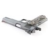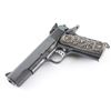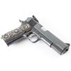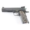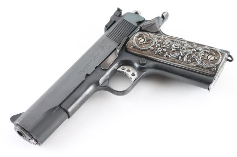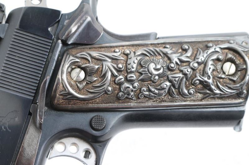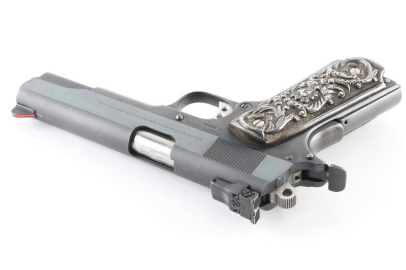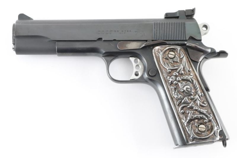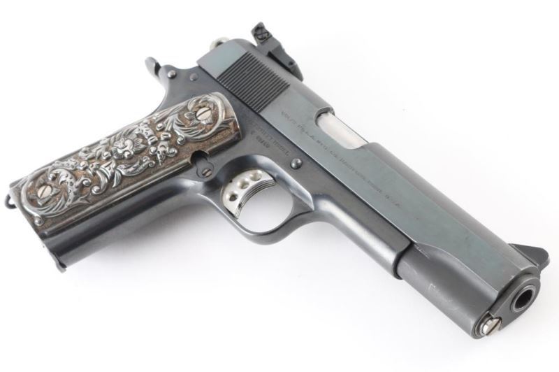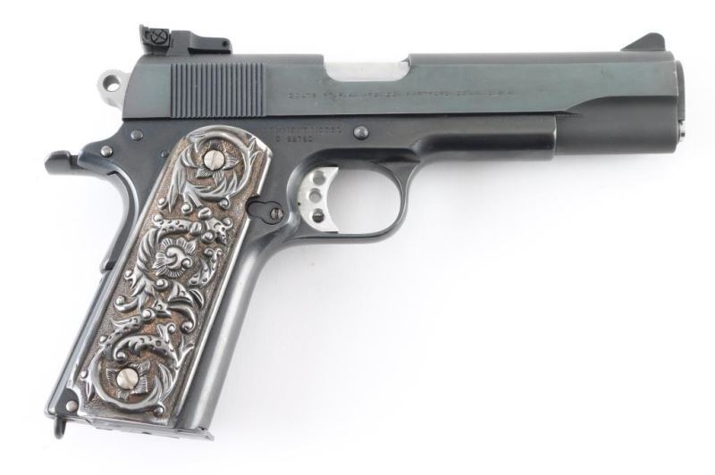Pistol. Semi-Automatic. 8+1 capacity. Government 1911 model frame manufactured 1917, mounted with a Colt .38 Special Kit. The Colt .38 Special kit was introduced in 1963. Colt ceased production in 1972. 5" barrel. Red ramp front , adjustable white-outline square notch rear sights. Commander style hammer. Smooth, straight, mainspring housing. Skeletonized , serrated trigger, with adjustable stop. Lanyard ring. Grip, thumb safeties. Left slide marked "Colt .38 Spec. Kit, with Rampant Colt" Barrel marked "Colt .38 Spec. Kit" Right slide marked with one-line Colt address. Right frame marked "Government Model" with serial number below it. Slide action is smooth/tight. Bore appears excellent/bright. Blued finish (Frame has been re-blued at some point) Elaborate raised floral designed metal grips, possibly pewter. Blued finish. is about 90%, with scratches/rubs. There is some slight pitting along the right side of the frame, and on the fore strap, and slide stop. Comes with correct Colt magazine. NRA Condition-Good (Frame Re-Blued) C&R Firearm.