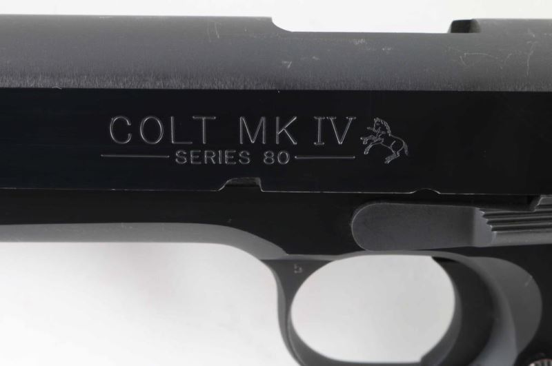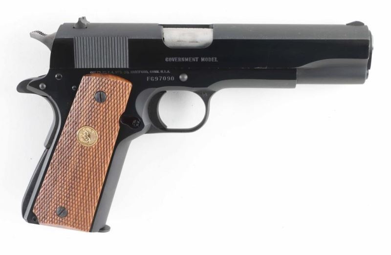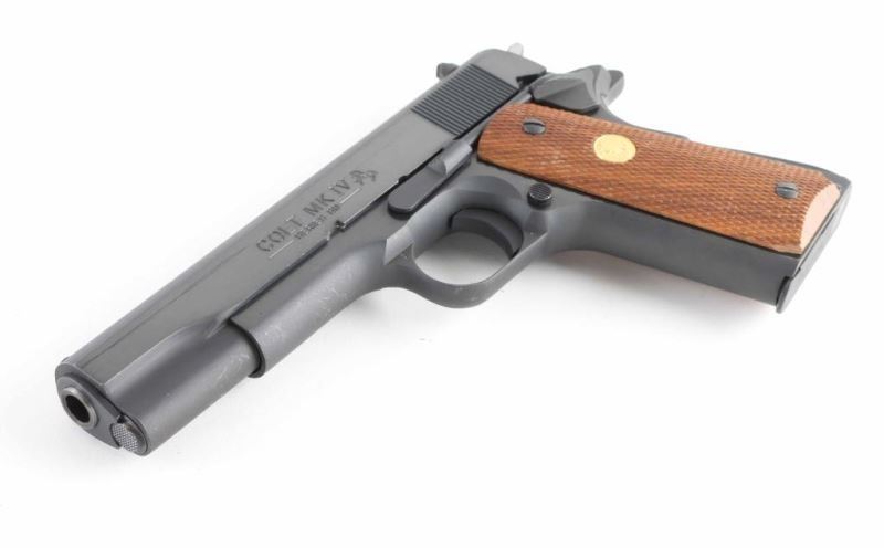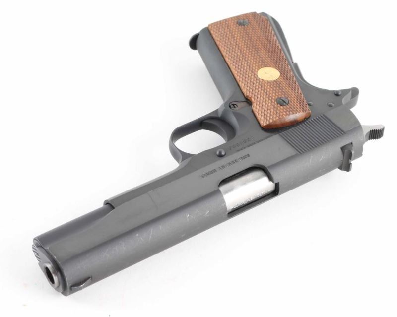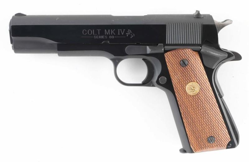 'MK IV/Series 80' 1911A1 pattern single action semi-automatic pistol manufactured circa 1990. Features blued finish with polished flats, 5" barrel, blade front sight, notch rear sight in dovetail, smooth trigger, serrated hammer spur, thumb safety on the left side of the frame, grip safety, push button magazine release, steel frame, serrated arched mainspring housing, checkered wood grips with gold color Colt medallions. Pistol retains approximately 95% of its original blued finish with several scratches to right side of slide, lighter scuffing in several places. Action is smooth, the bore is very good and the grips are fine. Includes (1) magazine. Condition is NRA Very Good++ *** Modern Firearm ***