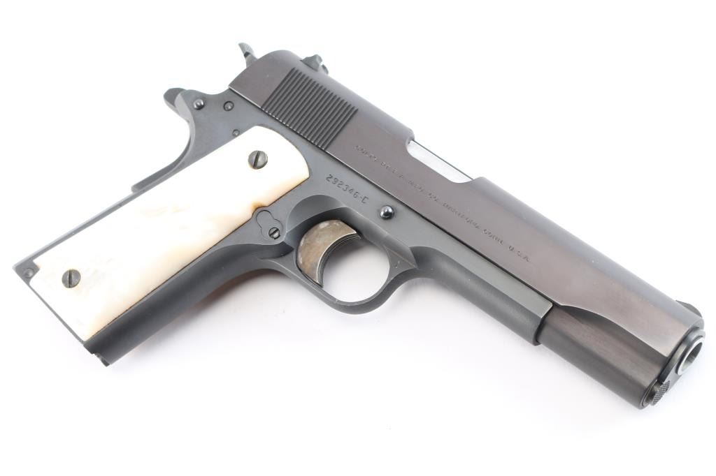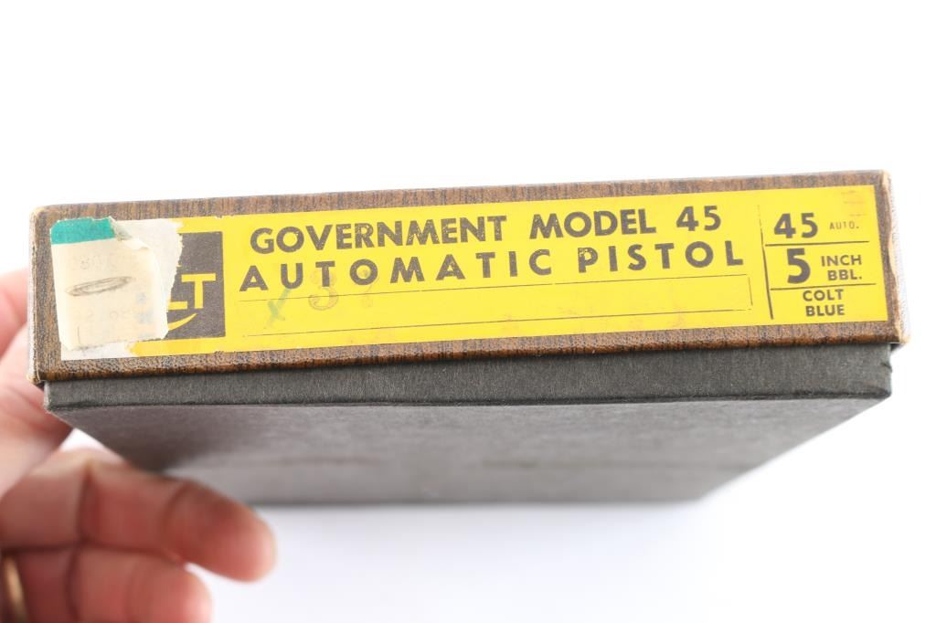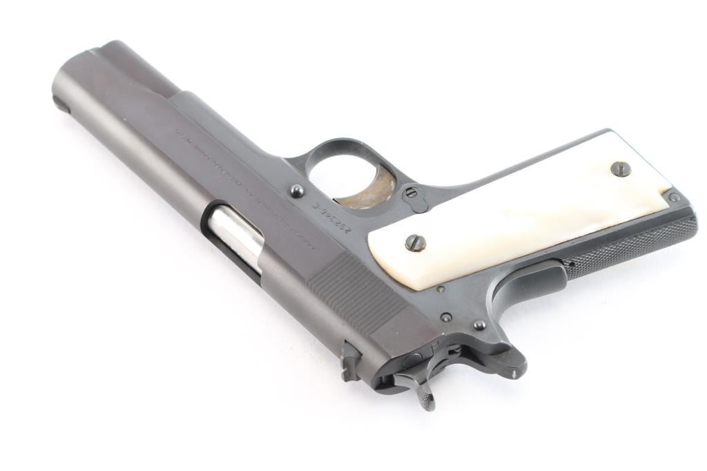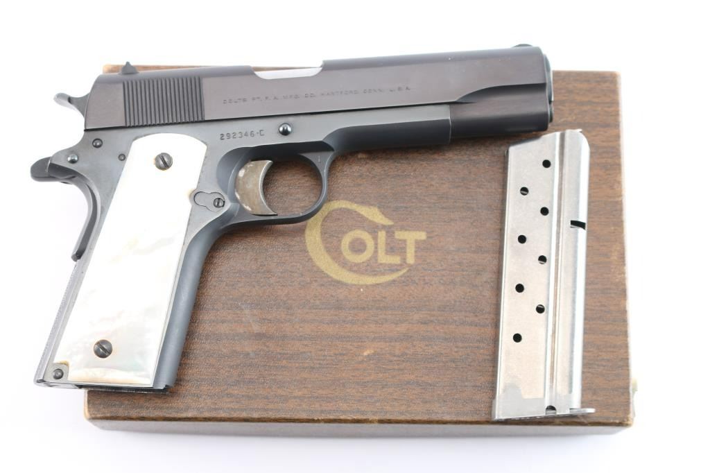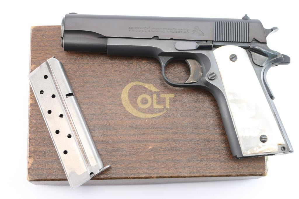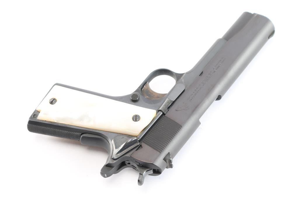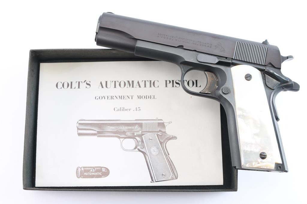 American made 'Pre-Series 70' semi-Automatic single action pistol chambered in .45 Automatic Colt Pistol, manufactured circa 1963 in Hartford, CT. This 1911 features a blued finish with polished flats and matte contours, a 5" barrel, smooth front strap, flat checkered mainspring housing, short single-piece guide rod, checkered recoil spring plug, fixed serrated blade front sight, dovetailed square notched rear sight, color-case solid serrated curved trigger, serrated push-button magazine release, frame mounted serrated manual safety, checkered hammer spur, smooth grip safety, accepts seven and eight round magazines, and faux pearl two-piece grips. The slide is marked "Government Model, Colt, Automatic Caliber .45" in two lines on left side. One line Colt address on the right side of slide. The original blued finish retained is approximately 98% with a few minor scratches by the slide stop, and a few more light scattered scratches on the frame. The action is smooth and crisp. Bore is bright with strong rifling, and the grips are very good with chipping by the top screw on the right grip panel, and the left panel fits loosely. Pistol includes original Colt brown cardboard box with original paperwork.