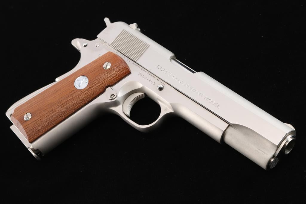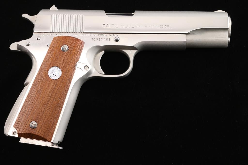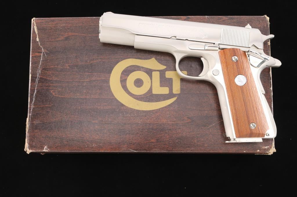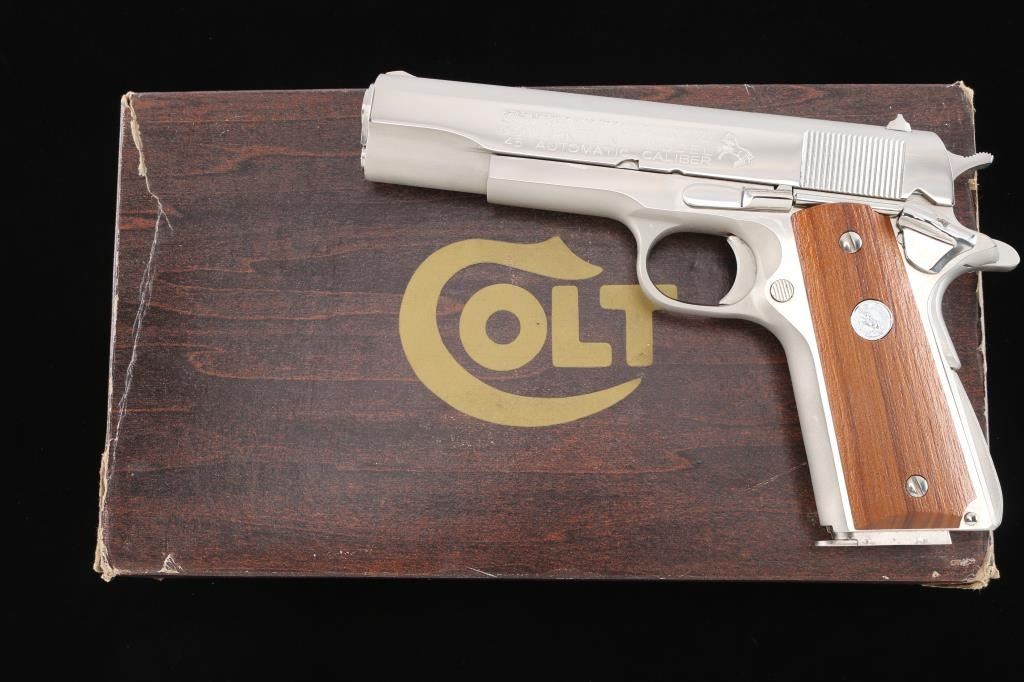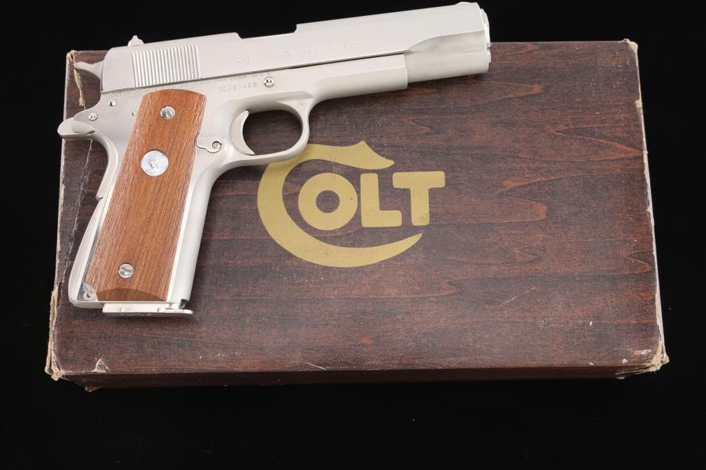 'MK IV/Series 70' 1911A1 pattern single action semi-automatic pistol manufactured circa 1973-74. Features Nickel Plated, matte finished with polished sides , 5" barrel, low profile serrated blade front sight, square notch rear sight in dovetail, serrated lightweight trigger, serrated hammer, thumb safety on the left side of the frame, grip safety, push button magazine release, arched serrated mainspring housing, rough textured smooth wood grips with "Rampant Colt" medallions. Bore is excellent/bright. stainless steel finish is excellent condition, with some minor scratches. Action is smooth and the grips are excellent. Colt 8-rd magazine. Comes in original factory "wood grain" box with matching label, styrofoam insert and manual.