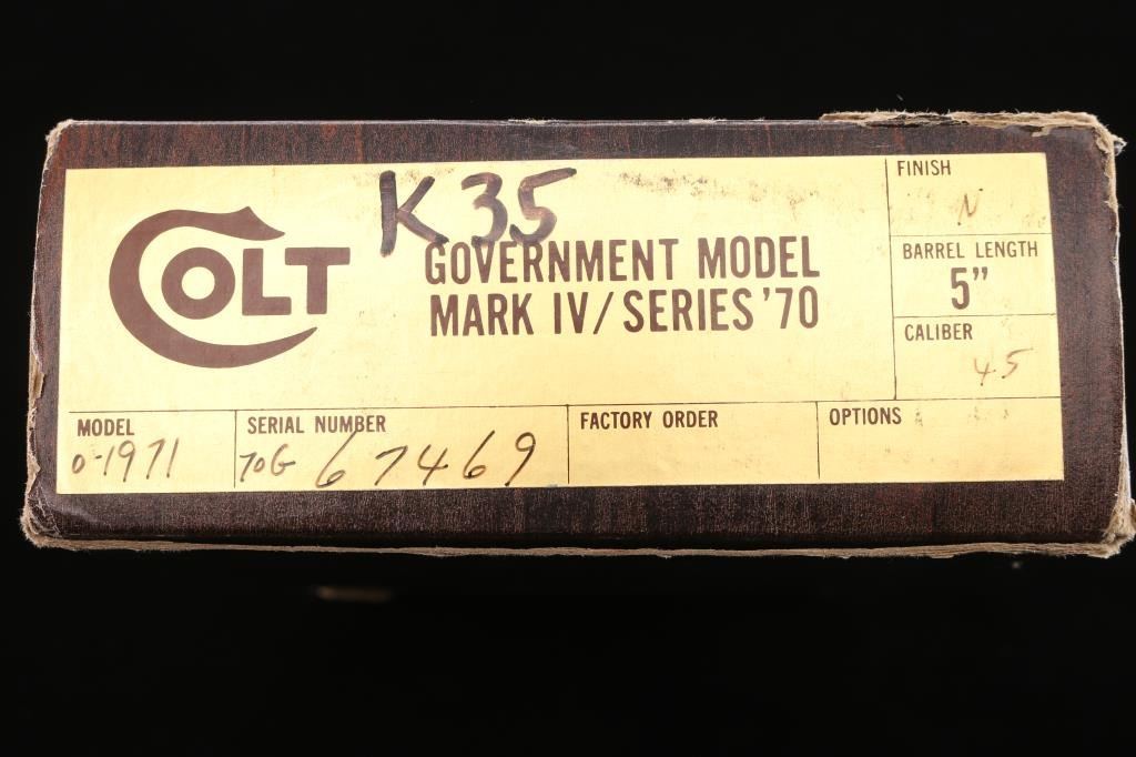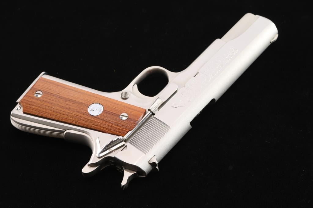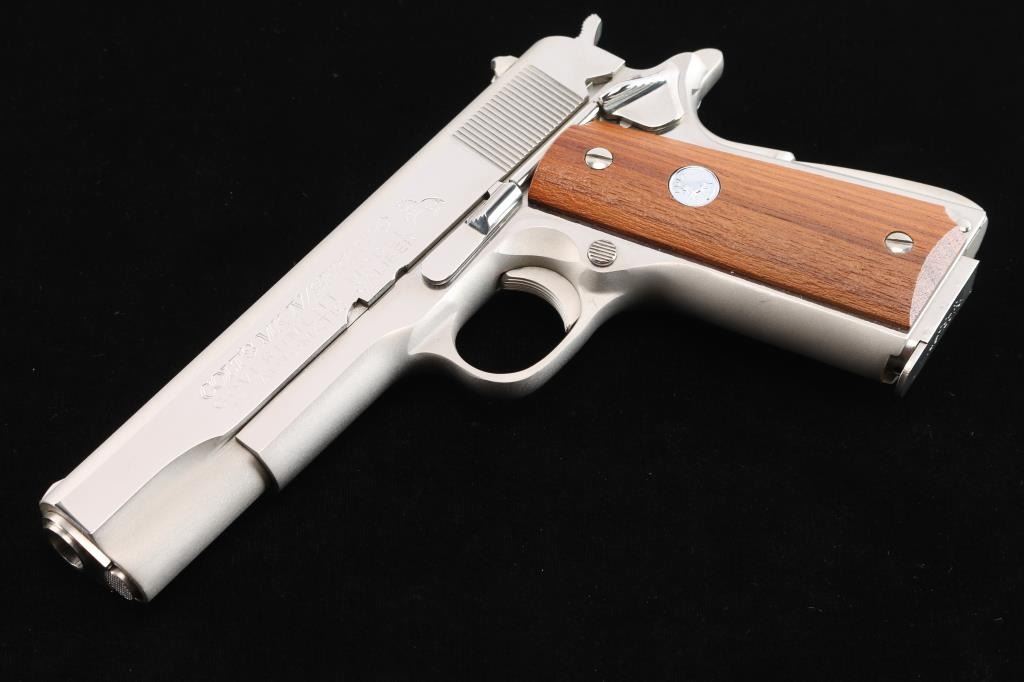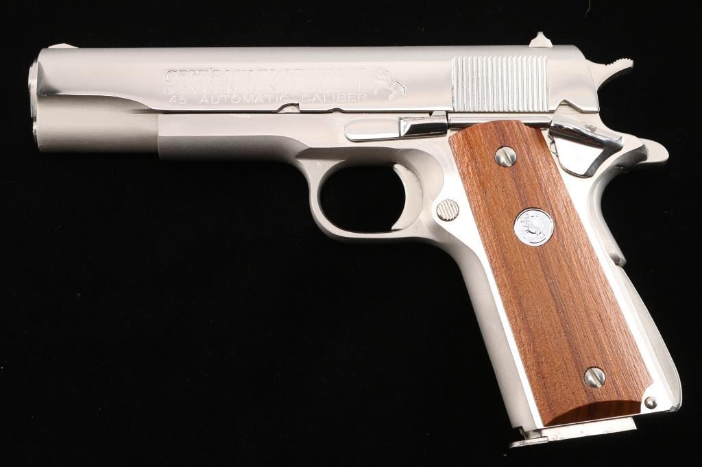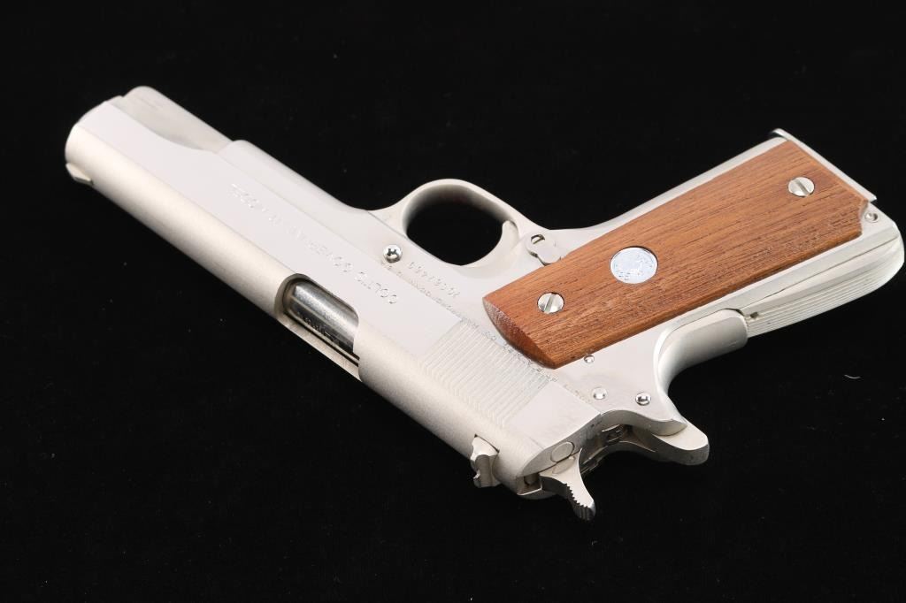 'MK IV/Series 70' 1911A1 pattern single action semi-automatic pistol manufactured circa 1973-74. Features Nickel Plated, matte finished with polished sides , 5" barrel, low profile serrated blade front sight, square notch rear sight in dovetail, serrated lightweight trigger, serrated hammer, thumb safety on the left side of the frame, grip safety, push button magazine release, arched serrated mainspring housing, rough textured smooth wood grips with "Rampant Colt" medallions. Bore is excellent/bright. stainless steel finish is excellent condition, with some minor scratches. Action is smooth and the grips are excellent. Colt 8-rd magazine. Comes in original factory "wood grain" box with matching label, styrofoam insert and manual.