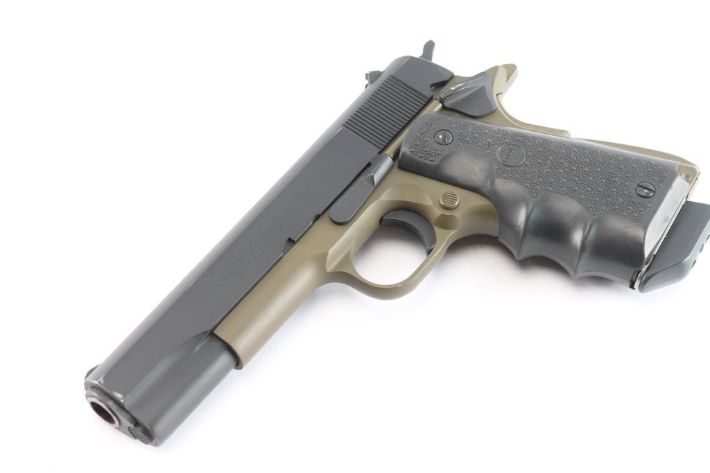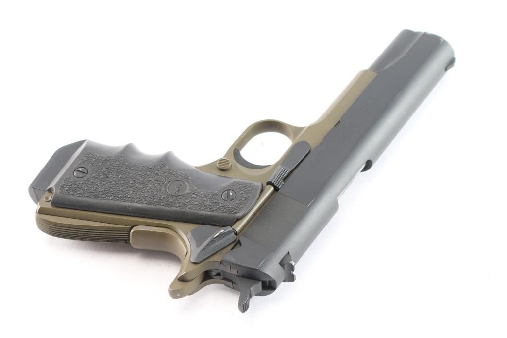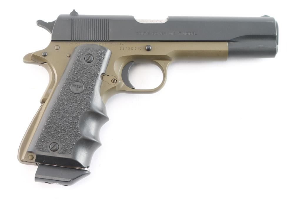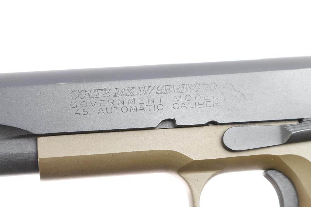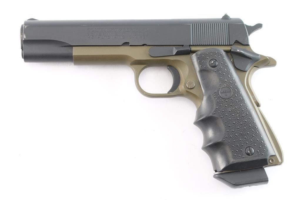 'MK IV/Series 70' 1911A1 pattern single action semi-automatic pistol manufactured circa 1978. Features two toned finish (matte blued finish slide with flat dark earth frame), 5" barrel, serrated ramp front sight, dovetailed square-notch rear sight, grooved trigger, serrated hammer spur, thumb safety on the left side of the frame, grip safety, push button magazine release, grooved, arched mainspring housing & Hogue wrap-around textured, finger grooved black rubber grip. Bore is excellent/bright. Retains about 97% finish with minor rubbing wear on the front slide and safety lever. Grips are excellent. Comes with one 8-rd magazine with extended floorplate.