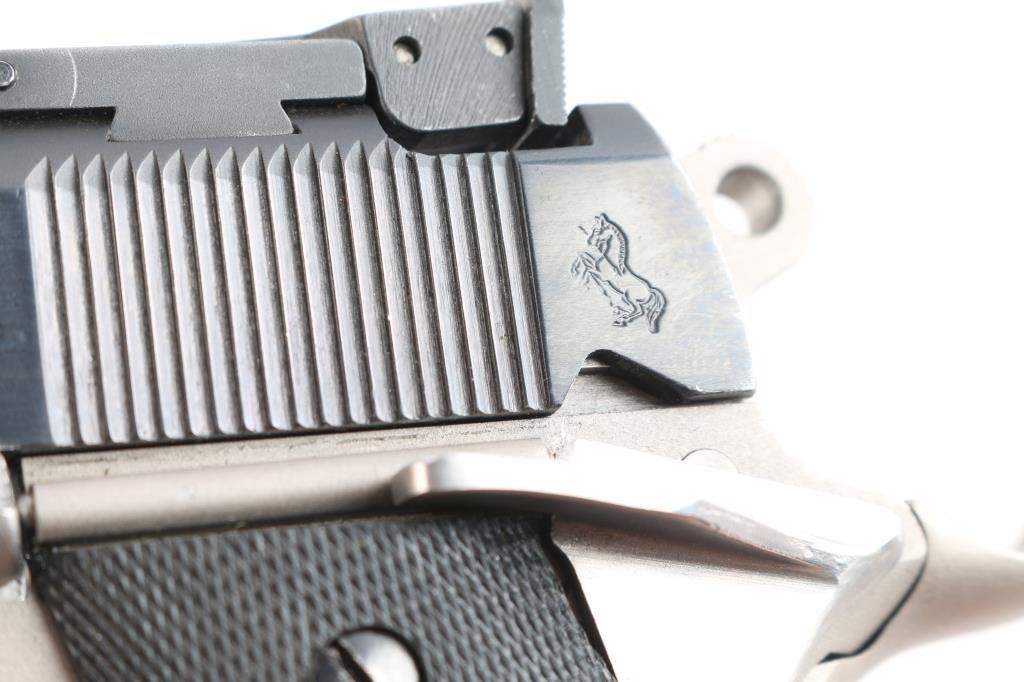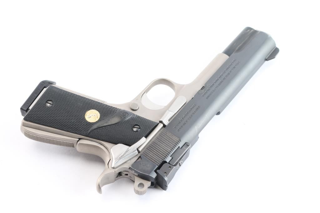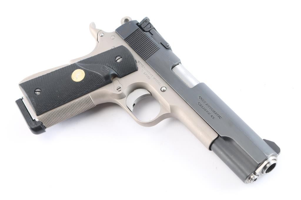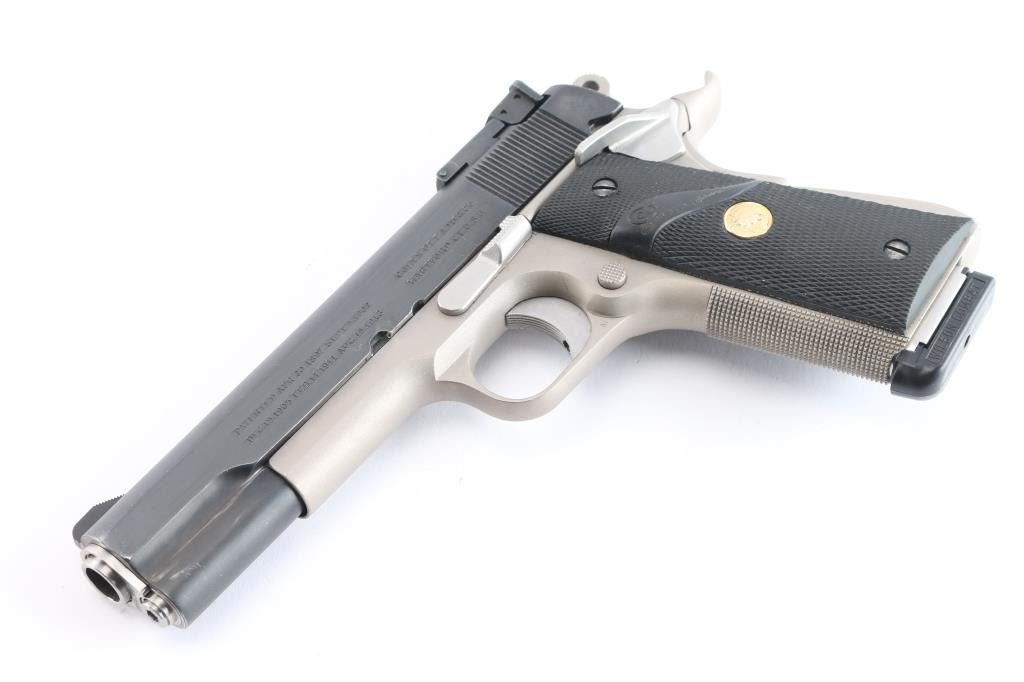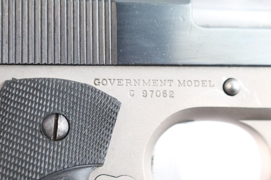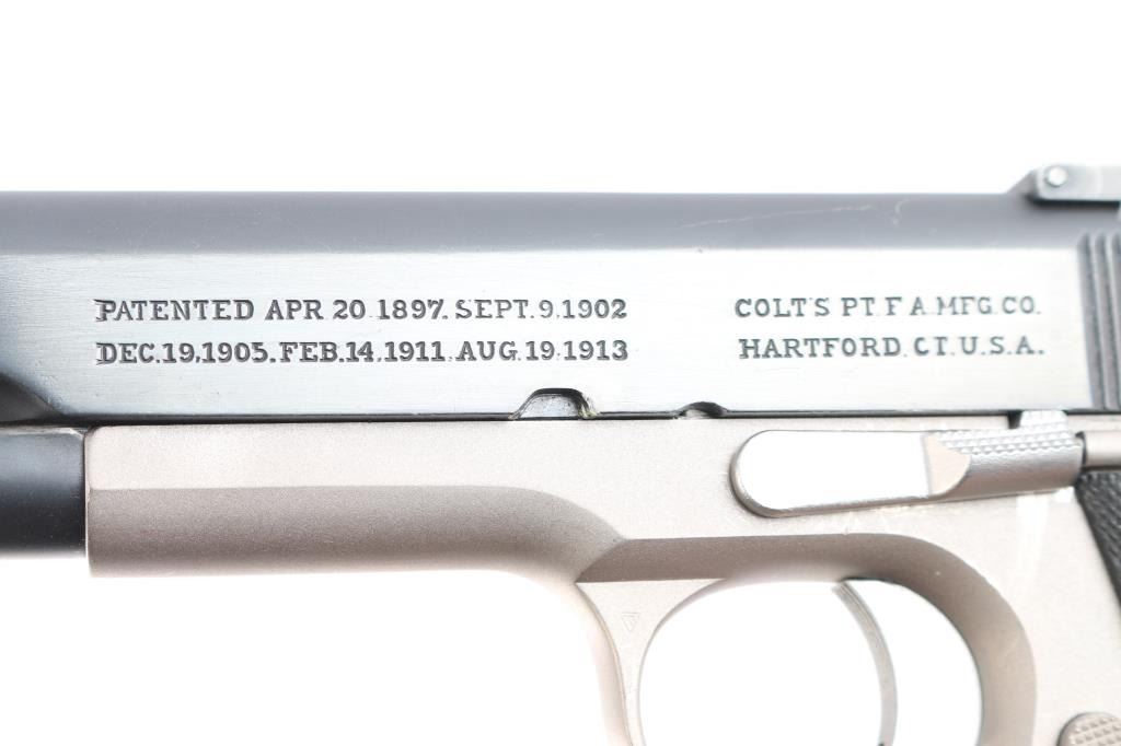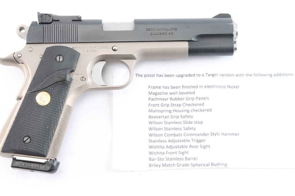 This is a Colt commercial Government Model pistol that has been professionally restored/upgraded to a target version. Manufactured 1917. Slide has the correct slide markings for that time period, The upgrades are as follows: Frame has been finished in electroless nickel, magazine well has been beveled, checkered black rubber Pachmayr grips with gold toned Colt medallions added, front grip strap checkered, arched mainspring housing checkered, upswept 'beavertail' grip safety added, Wilson combat knurled, stainless steel slide stop, wilson stainless steel safety, Wilson combat commander style hammer, serrated, stainless steel adjustable trigger, Wichita front sight, Bar-Sto stainless steel barrel and Briley match grade spherical bushing. Slide has a high polish reblued finish. The bore is pristine, grips are excellent, finish has a few very minor scratches and a little friction wear from slide stop. Comes with one Wilson Combat 8-rd stainless magazine and a list of upgrades. It would cost a lot of money for these professional upgrades.
