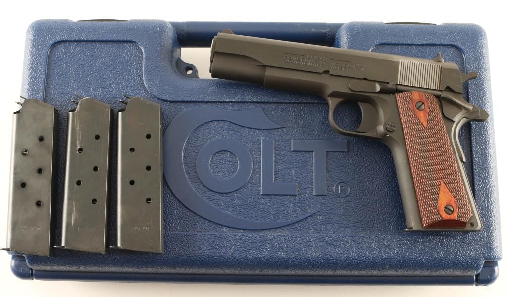 1911A1 pattern single action semi-automatic pistol chambered in .45 Auto. Features a matte blued finish with polished flats, 5" barrel, three-dot sights, serrated trigger, serrated hammer spur, thumb safety on the left side of the frame, grip safety, push button magazine release, factory 7 round magazine, steel frame, serrated flat mainspring housing and double diamond checkered laminated rosewood grips. Includes the original factory hard case with manual, lock and three spare magazines. Pistol retains approximately 99% of its original blued finish showing some superficial scratches on the slide with no major wear observed. Action is smooth, the bore is excellent and the wood grips are fine. Condition is NRA Excellent in box. ***Modern Firearm***