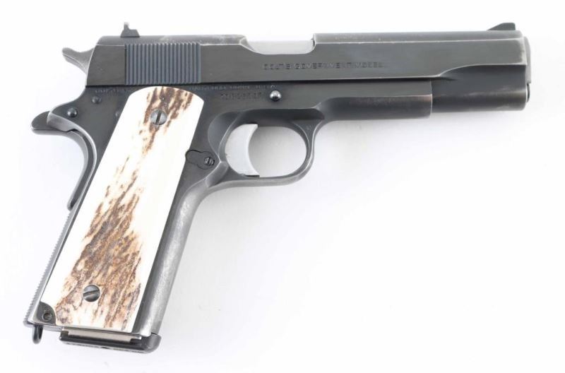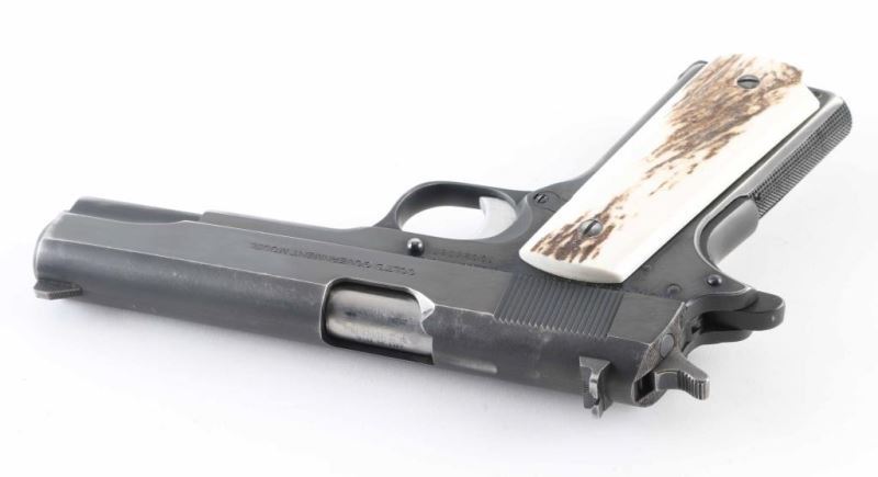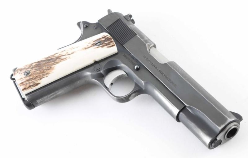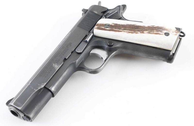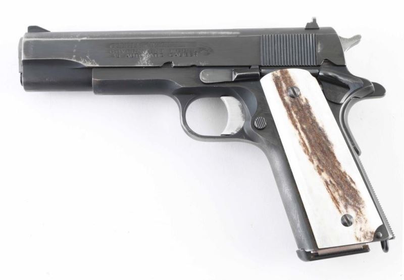 'MK IV/Series 70' 1911A1 pattern single action semi-automatic pistol manufactured circa 1972. Features matte blued finish with bright polished sides, 5" barrel, aftermarket fixed sights, bare aluminum grooved trigger, serrated hammer spur, thumb safety on the left side of the frame, grip safety, push button magazine release, steel frame, serrated arched mainspring housing, stag grips. Bore is very good condition. Retains 75% finish with scuffs & scrapes, edge losses, thinning at front strap. Grips are very good condition. Includes (1) magazine. Condition is NRA Very Good+ *** Modern Firearm ***