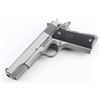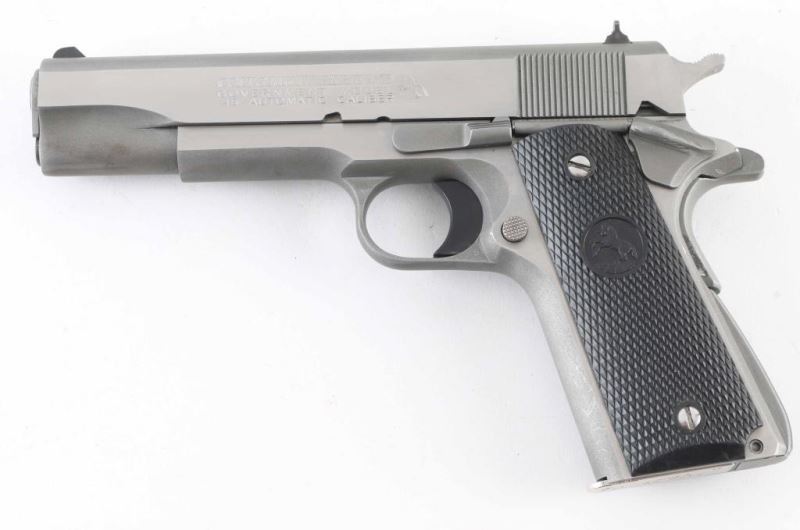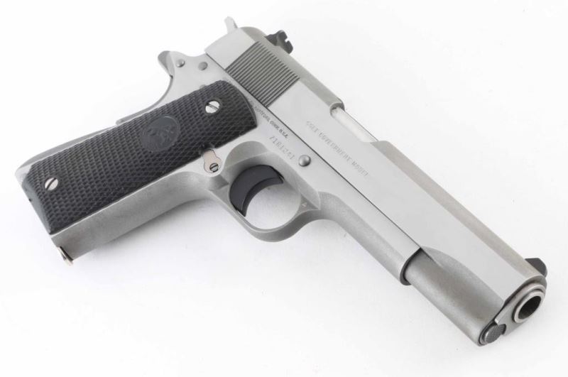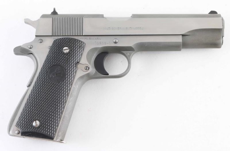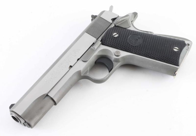 'MK IV/Series 70' 1911A1 pattern single action semi-automatic pistol. Features stainless steel construction, 5" barrel, fixed sights, smooth polymer trigger, serrated hammer spur, thumb safety on the left side of the frame, grip safety, push button magazine release, serrated arched mainspring housing, checkered black plastic grips with embossed Colt emblems. Bore is very good condition. Metal surfaces show handling marks, some small scratches. Grips are very good condition. Includes (1) magazine, factory blue cardboard box with sleeve. Condition is NRA Excellent *** Modern Firearm ***