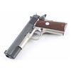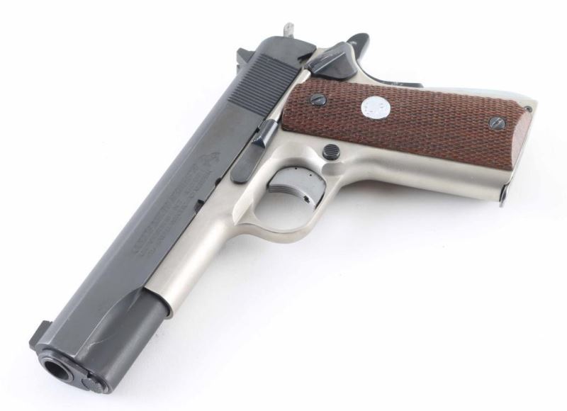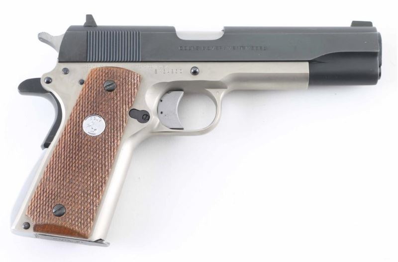 Pistol. Semi-Automatic. MK IV/Series 70. Manufactured 1981. Short Recoil. Fed from 8-rd magazine. 5" barrel. Fixed iron sights. Frame mounted thumb safety. One line Colt address/serial # on right frame. "Colt Government Model" on right slide. " "Colt's Mk IV/Series 70 Government Model .45 Automatic caliber" stamped on left slide in 3 lines. Blue over Electroless nickel finish. Checkered walnut grips with silver "Rampant Colt" medallions. Slide action is Crisp/Tight. Bore is excellent/bright. Metal finish is very good with minor scratches.. Grips are excellent. Comes in a Colt wood grain cardboard box with Styrofoam insert. Magazine included. NRA Condition-Near Excellent. Modern firearm.
