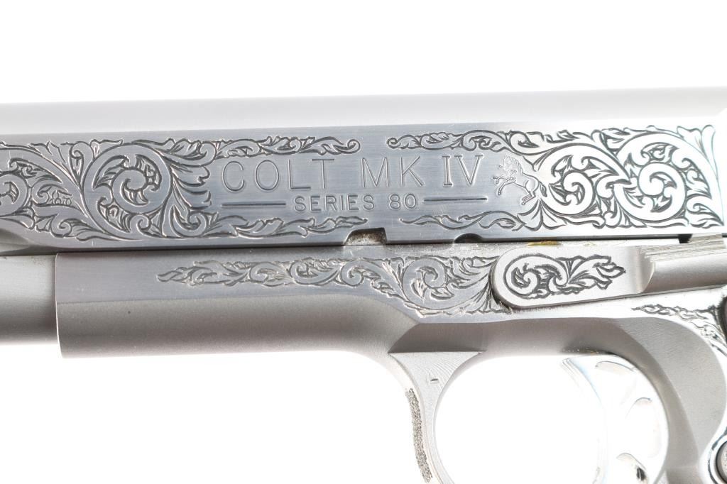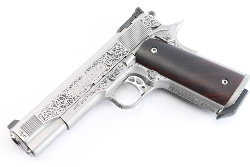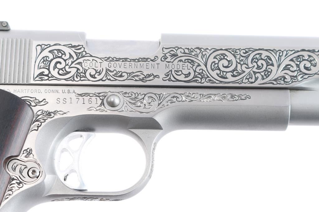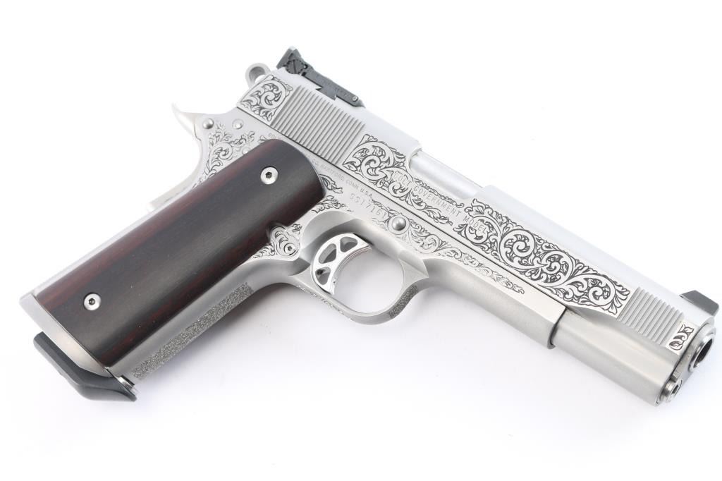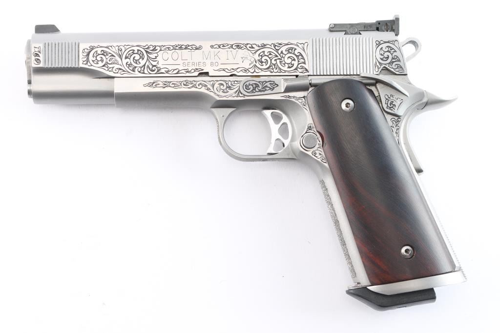 'MK IV Series 80' Engraved stainless steel 1911 pattern single action semi-automatic pistol chambered in .45 Auto. Manufactured in Hartford, CT circa 1986 and subsequently upgraded & engraved. Features a matte finish with polished flats, 50% coverage scroll pattern hand engraving, anti-glare angled cuts on the top of the slide as well as fore & aft cocking serrations on the sides, 5" barrel, two-piece full-length guide rod, white dot front sight, fully-adjustable Bo-Mar rear sight, serrated “k-hole” aluminum trigger with overtravel adjustment, skeletonized hammer, extended thumb safety on the left side of the frame, upswept grip safety, checkered push button magazine release, 8 round magazine with bumper pad, stippled front strap, checkered mainspring housing with beveled magazine well and smooth ironwood grips with mag well cut. Pistol exhibits minor contact wear on the slide with no major wear observed. The action is mechanically sound, the bore is excellent, and the ironwood grips are excellent.