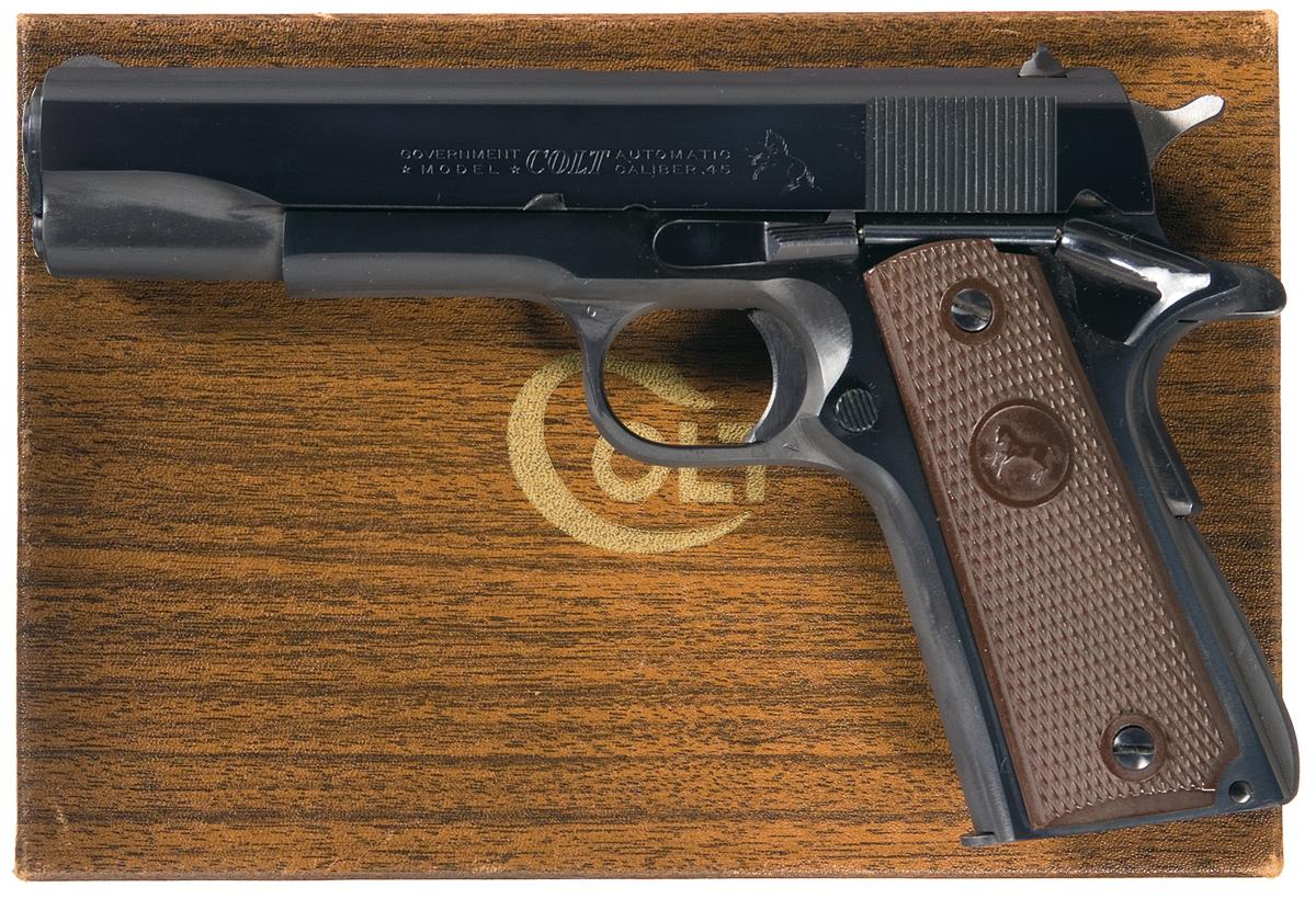 Manufactured in 1966, with fixed sights, standard markings, serrated arched mainspring housing and checkered plastic grips with Rampant Colt imprints. Complete with Colt "wood grain" box numbered to gun on bottom.