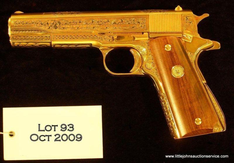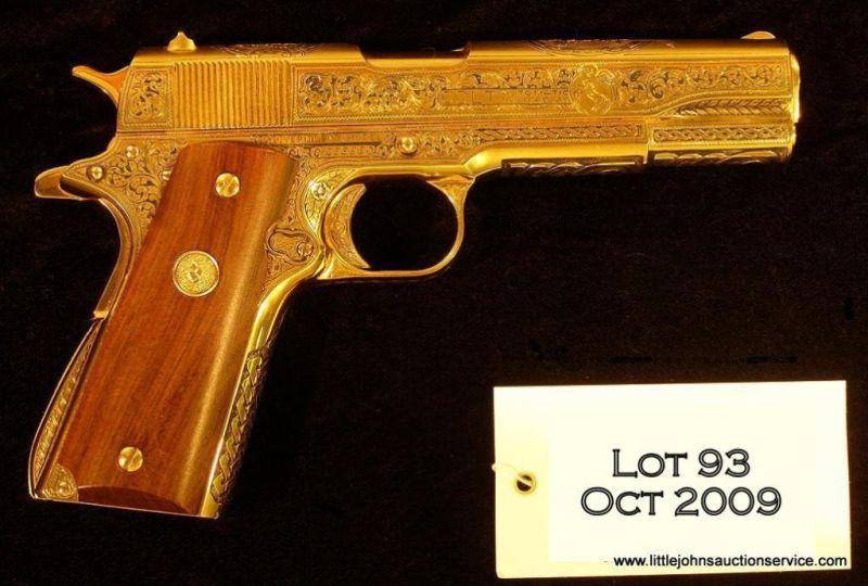 Colt Government Model semi-auto pistol, .45 cal., 5" barrel, custom engraved and gold plated finish, smooth wood Colt medallion grips, #C233830. This gun has been masterfully and deeply engraved extensively on the frame and slide showing scrolland floral coverage including two fancy vignettes on the top of the slide containing flower arrangements; the gold finish shows approx. 99%+, the bore is very good, the grips are excellent and the markings are crisp. A really nicelydecorated Government Model. Engraved by John Barra Clough. Est.: $1,500-$3,000.