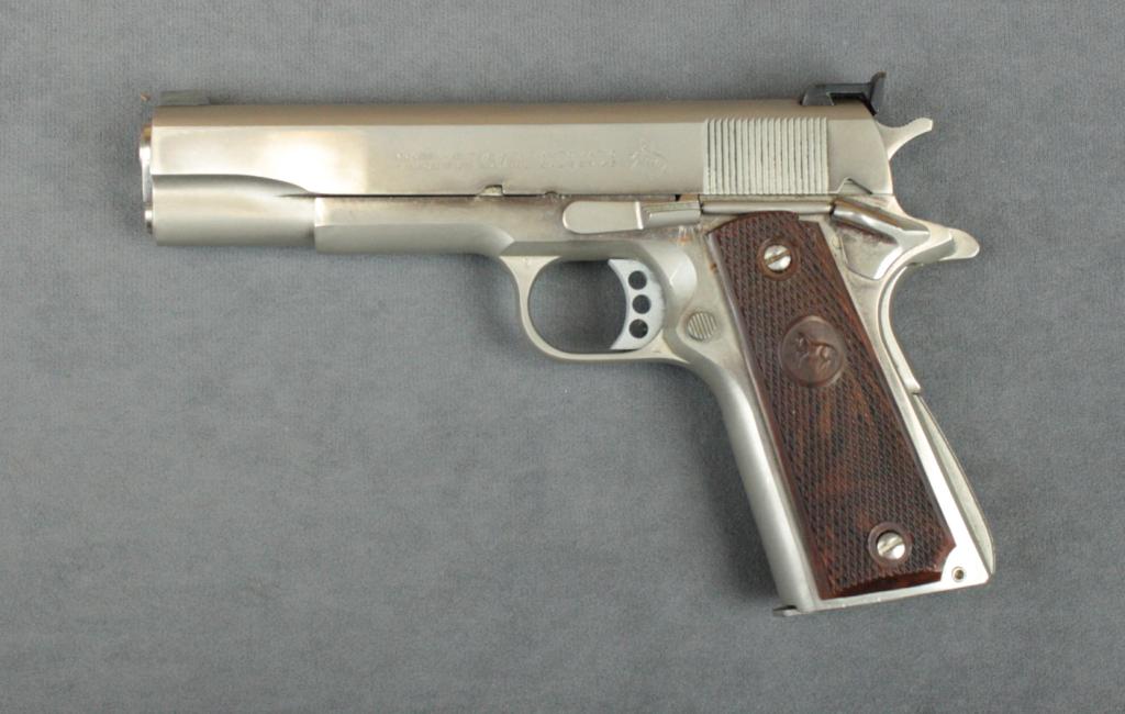 Colt Government Model semi-auto pistol, .45  cal., nickel finish, checkered mottled  Rampant Colt plastic grips, #301381-C. This  gun is in overall very good condition showing  a quality older re-nickel of which approx.99% of that finish remains; very good bore,  crisp action, good markings, grips are  overall good but from a different gun;  trigger is adjustable and lightened; updated  sights, correct Colt magazine; accompanied by a Hunter brand tooled leather holster.   Est.:  $400-$600.