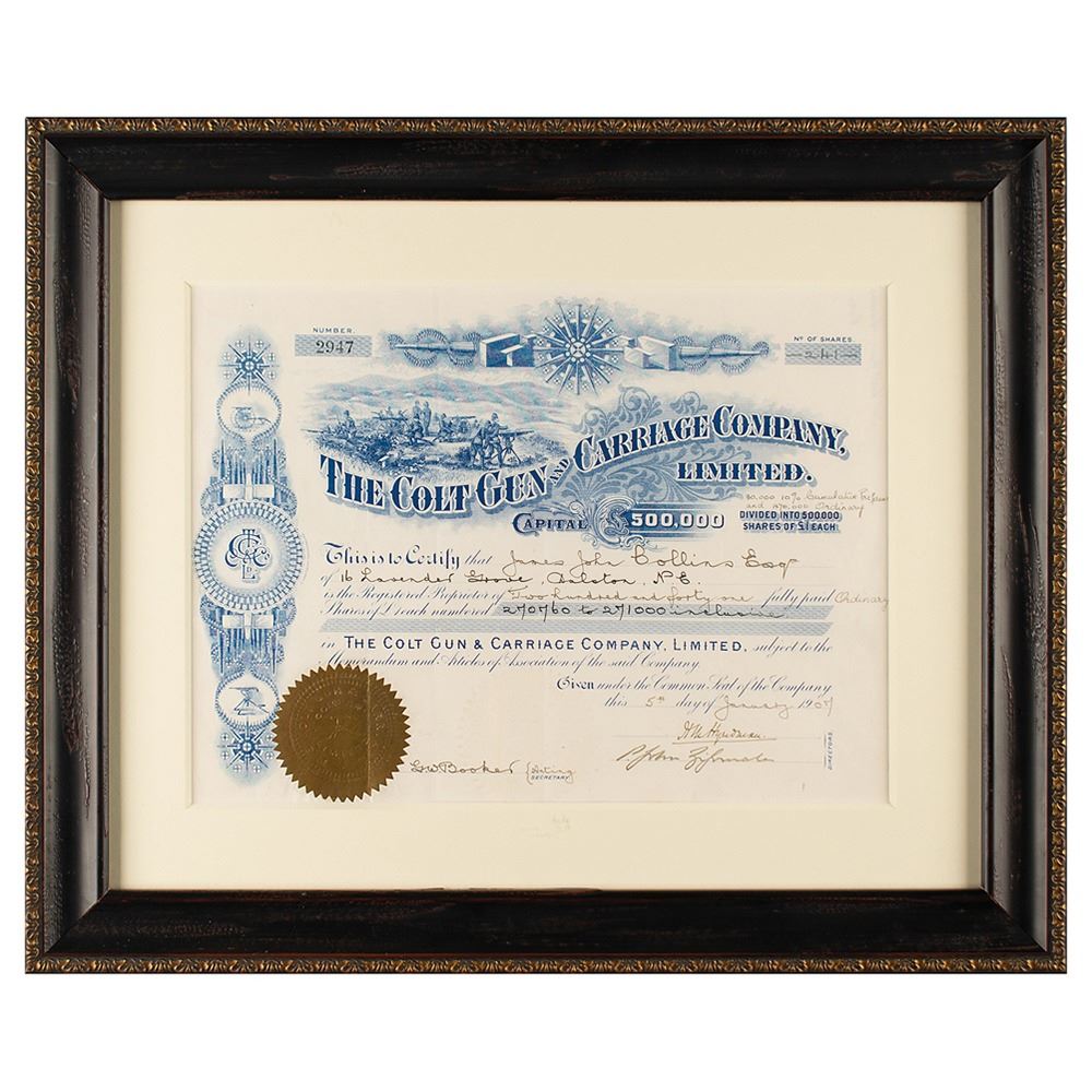 Spectacular stock certificate for 241 shares in the Colt Gun and Carriage Company, one page, 13 x 9.5, January 5, 1907. Issued to James John Collins, the certificate is beautifully engraved with vignettes of soldiers, machine guns, ammunition, and other artillery. Signed in ink by the company's directors and secretary, and retains its gold foil seal to lower left. Attractively matted and framed to an overall size of 19.25 x 15.75. In fine condition.